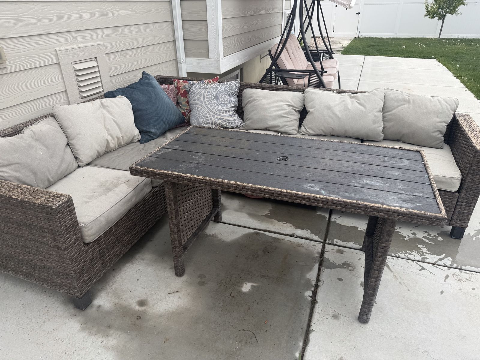 ApplePayIt’s partially wet from the rain, Two cushions missing so I just used decorative pillows instead in the corner. A few tears that were stitched up and not super noticeable. Comes with table and two stools. Fair condition but still usable and nice set for someone needing something without being too pricey.