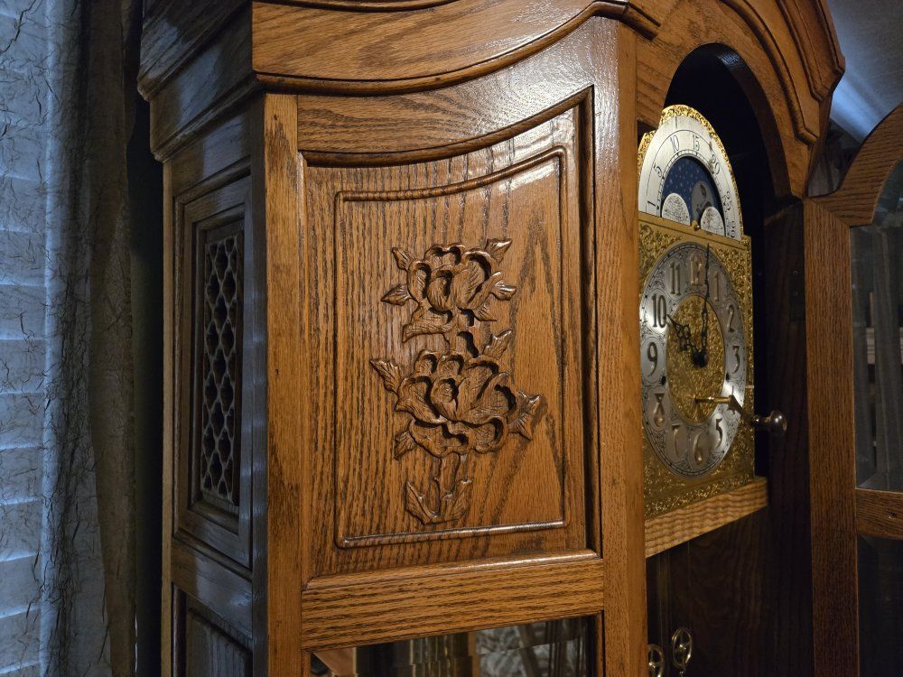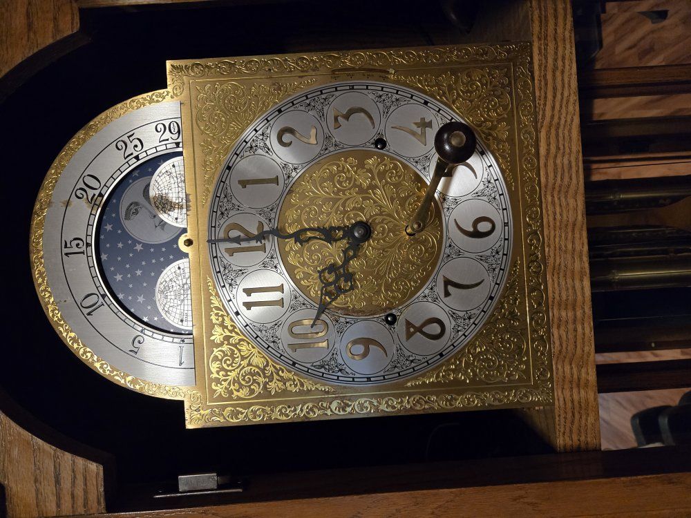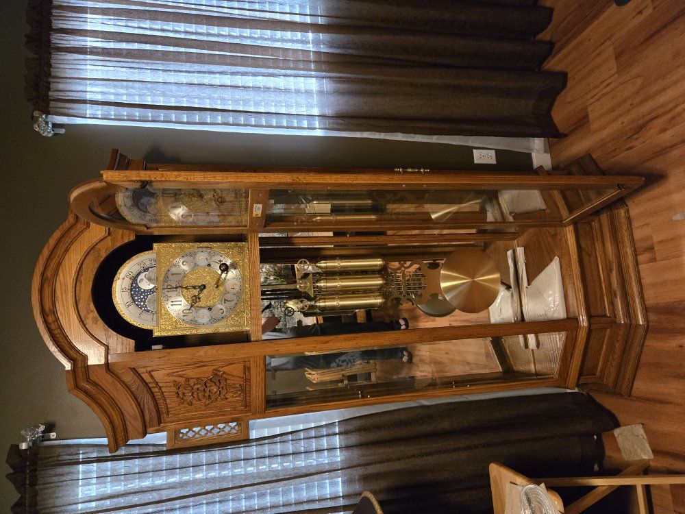 Zellegrandfather clock with curiosity displays. over 35 years old, works good, some chime bars missing