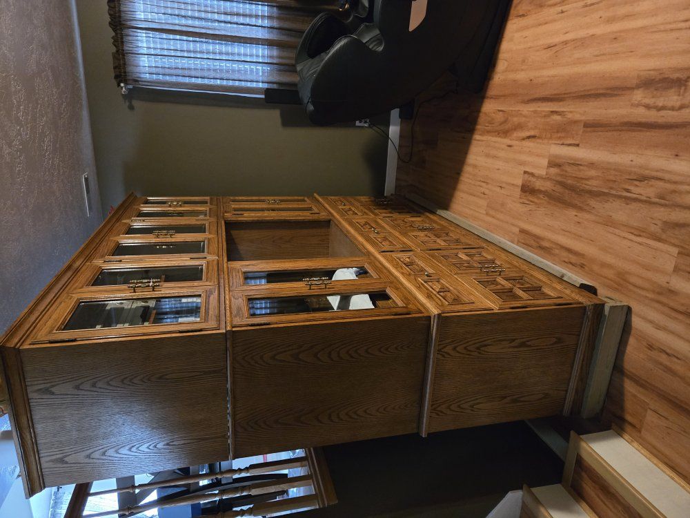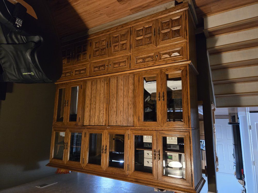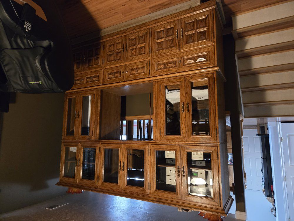 Zellethree tiered bookcase/ entertainment center, solid wood, about 7 foot tall, 7 foot long, and 30 inches deep.