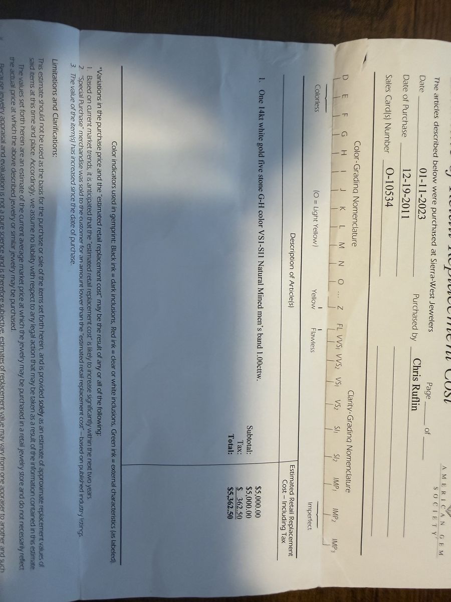 This is a 14k white gold 5 stone G-H color and VS1-SI1 Natural mined men's band totalling 1.00 cttw. (see appraisal in pictures)It is a size 10 but can be sized to whatever you need it to be easily.