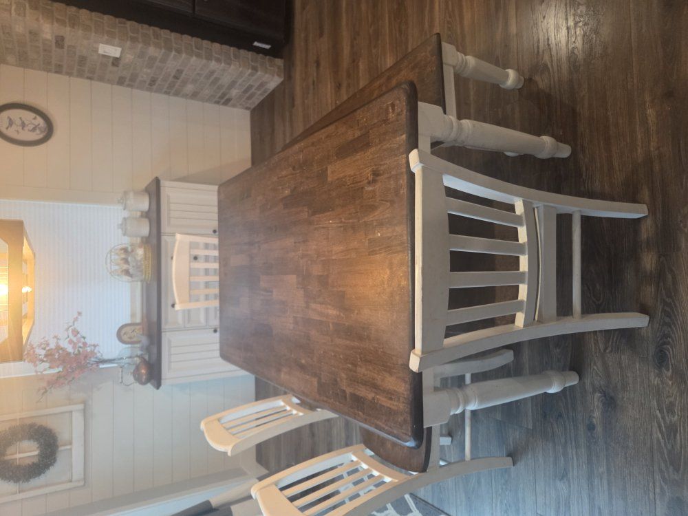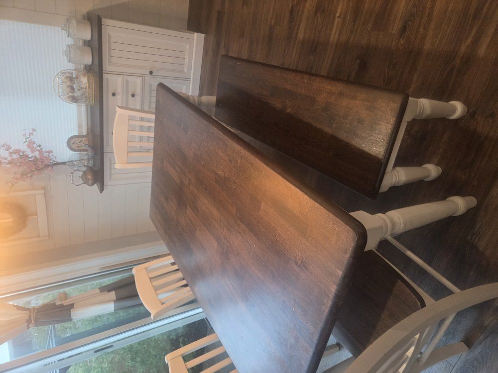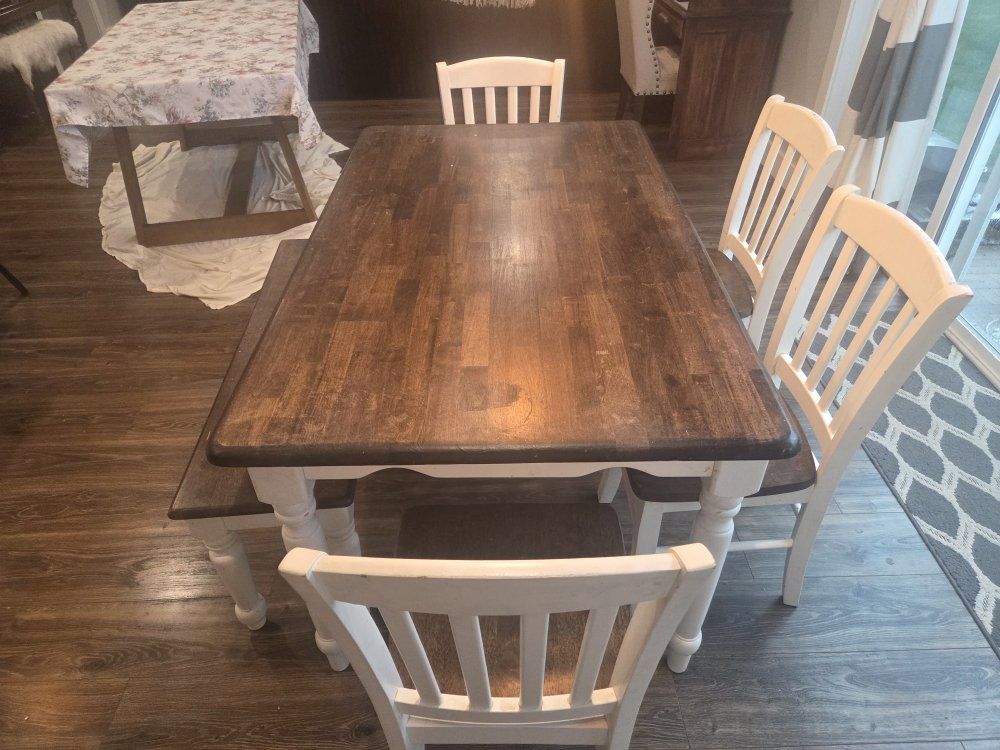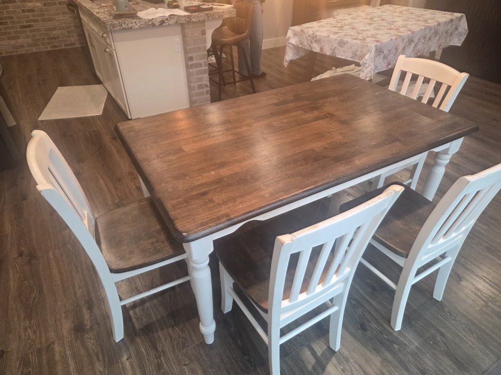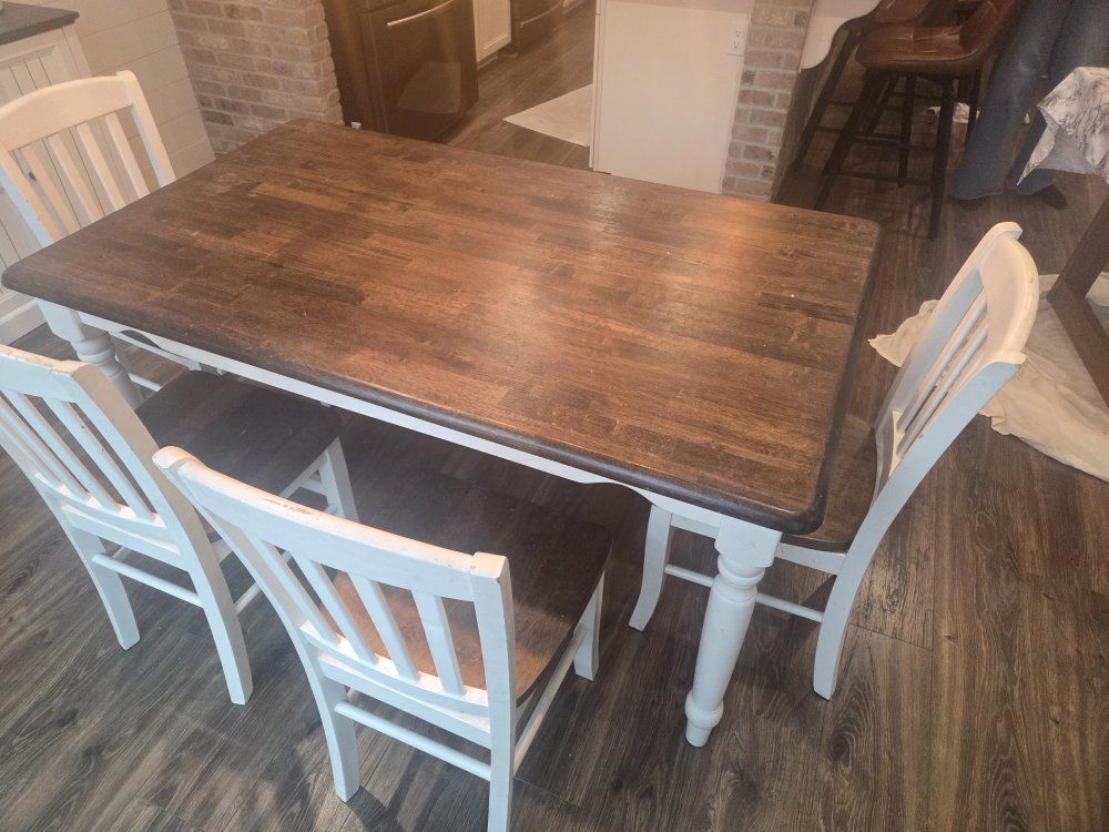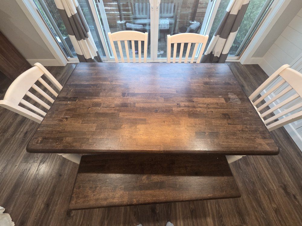 we refinished this 5 years ago, the finish is gone and it needs to be sanded down and reapplied same applies to the chairs. there are scuffs and scraps and stains that meed to be cleaned but if sanded it will look brand new. cash only, pick up only