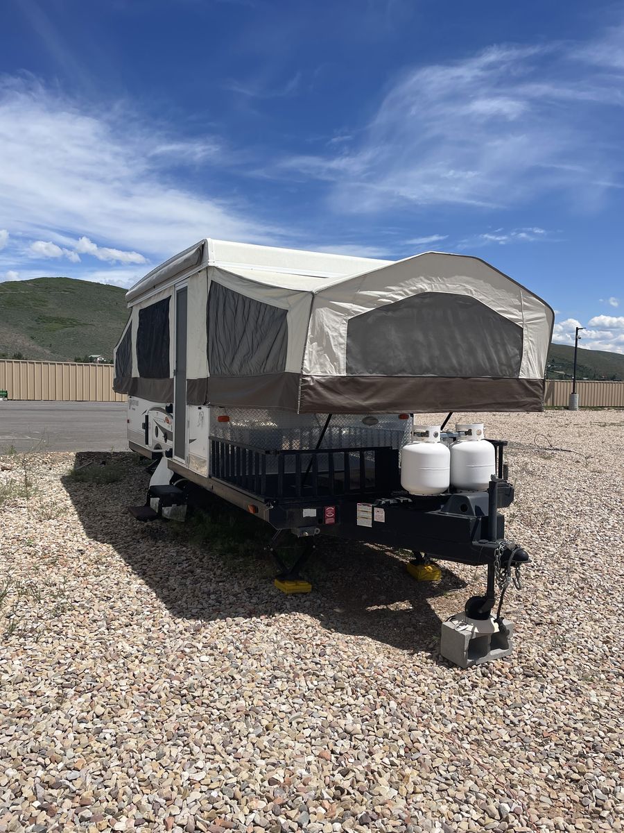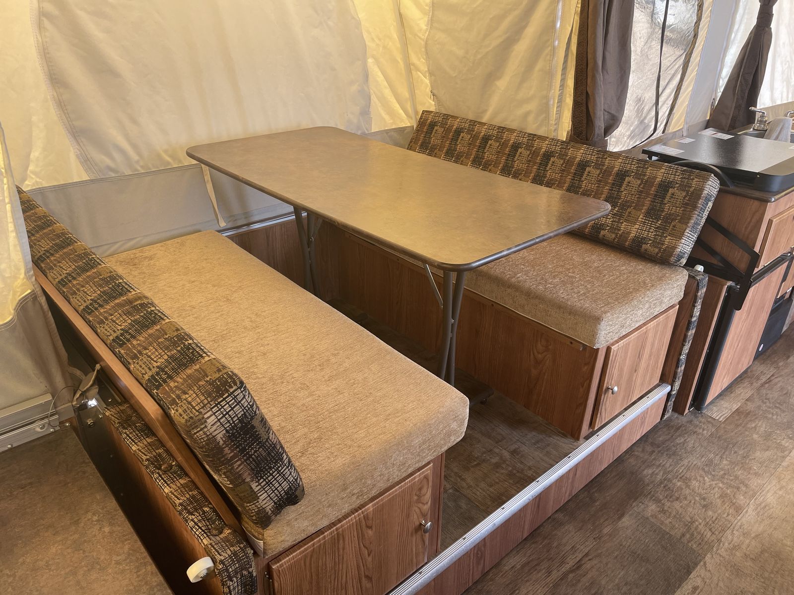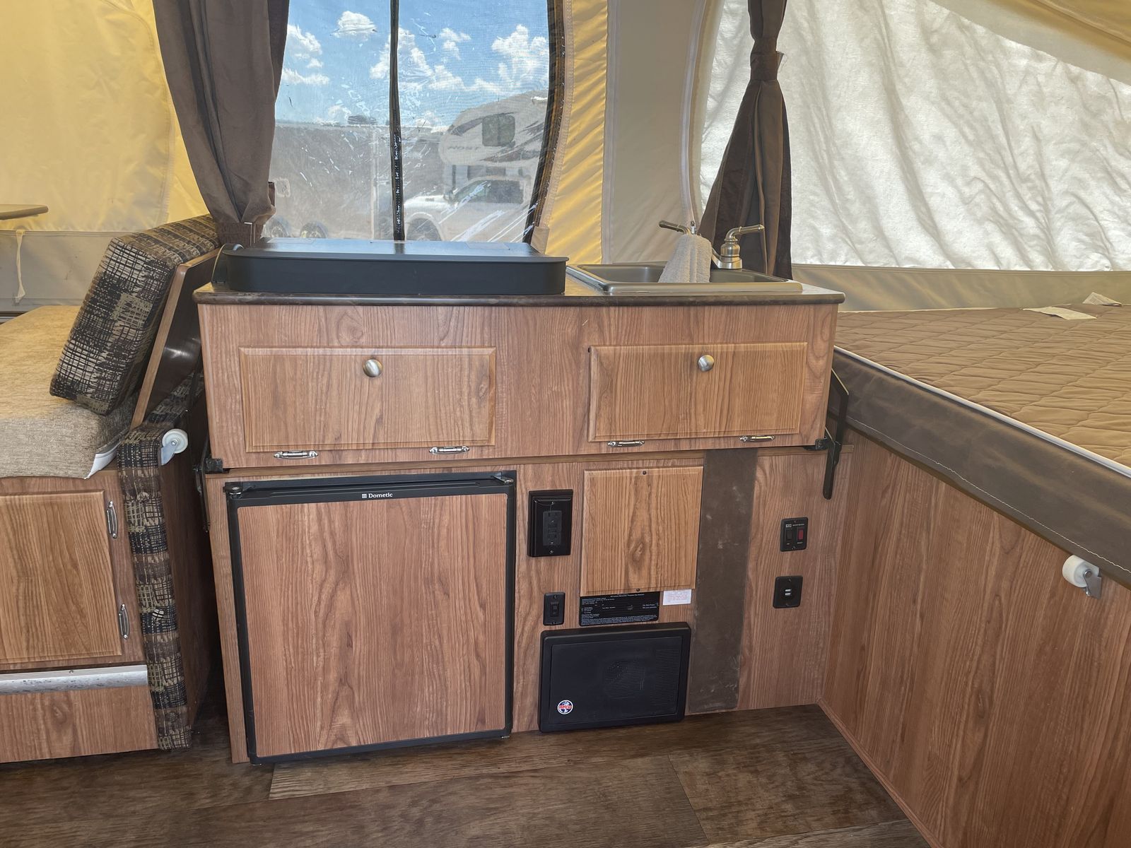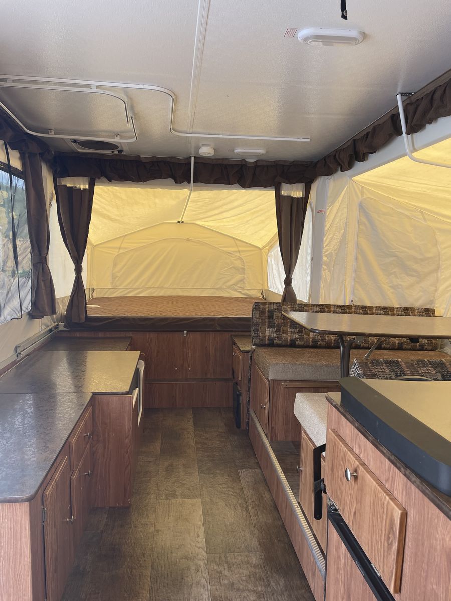 The single slide Rockwood Freedom 232XR folding pop-up camper features 54 x 84 front deck storage with expanded metal decking outside. The front king and rear queen tent end beds offer comfortable sleeping. The back wall offers a swing galley with a single bowl sink, three burner stove top and refrigerator (included). The back rear corner houses a cabinet where the heater is included. A slide out housing a booth dinette with a water heater under the seat completes this wall. Along the entry wall you will find a shower/porta-potty cassette as well as lots of storage cabinets. Includes outdoor gas grill.