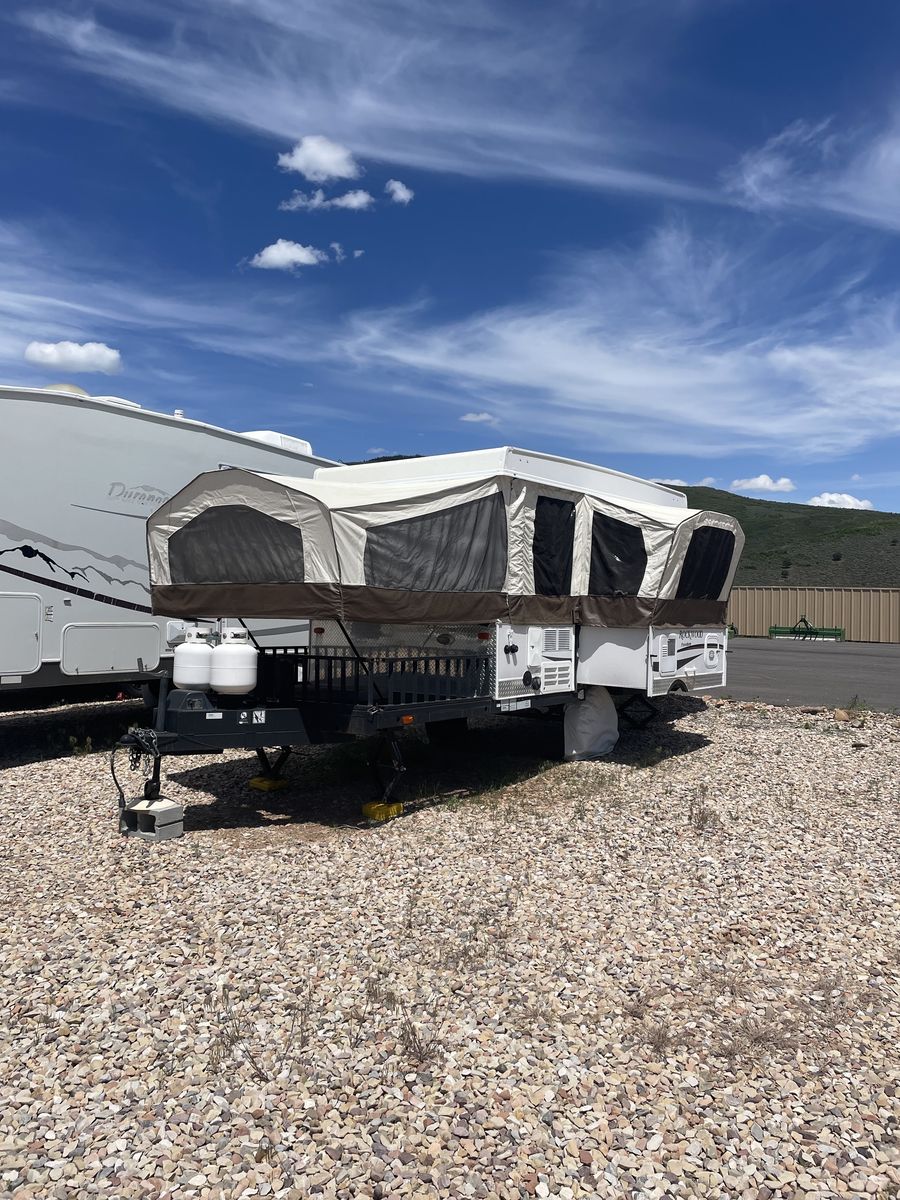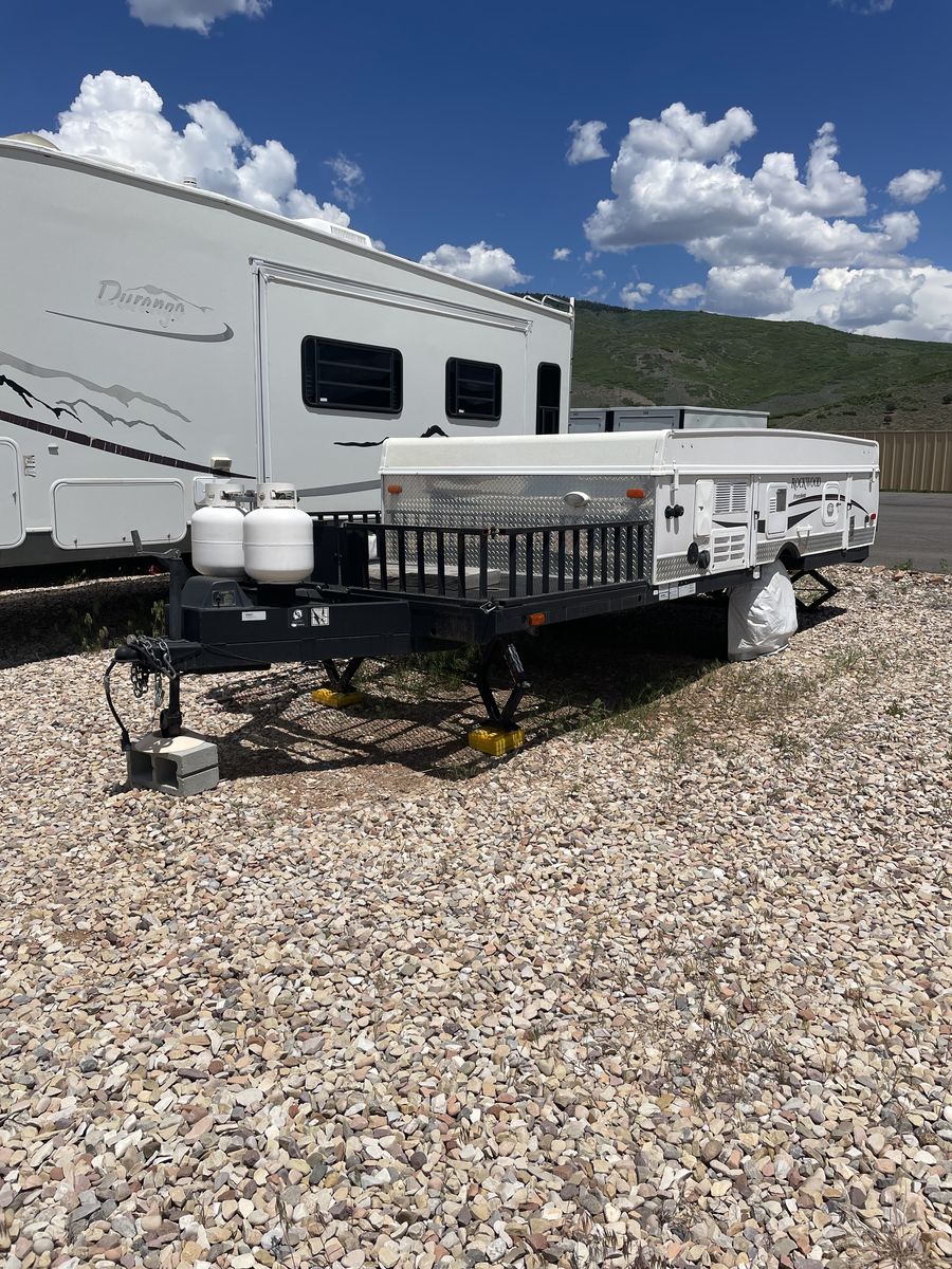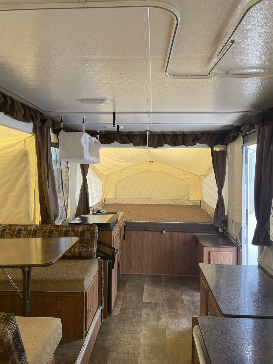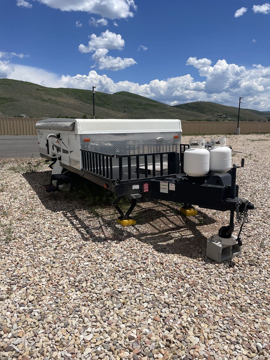 The single slide Rockwood Freedom 232XR folding pop-up camper features 54 x 84 front deck storage with expanded metal decking outside. The front king and rear queen tent end beds offer comfortable sleeping. The back wall offers a swing galley with a single bowl sink, three burner stove top and refrigerator (included). The back rear corner houses a cabinet where the heater is included. A slide out housing a booth dinette with a water heater under the seat completes this wall. Along the entry wall you will find a shower/porta-potty cassette as well as lots of storage cabinets. Includes outdoor gas grill.
