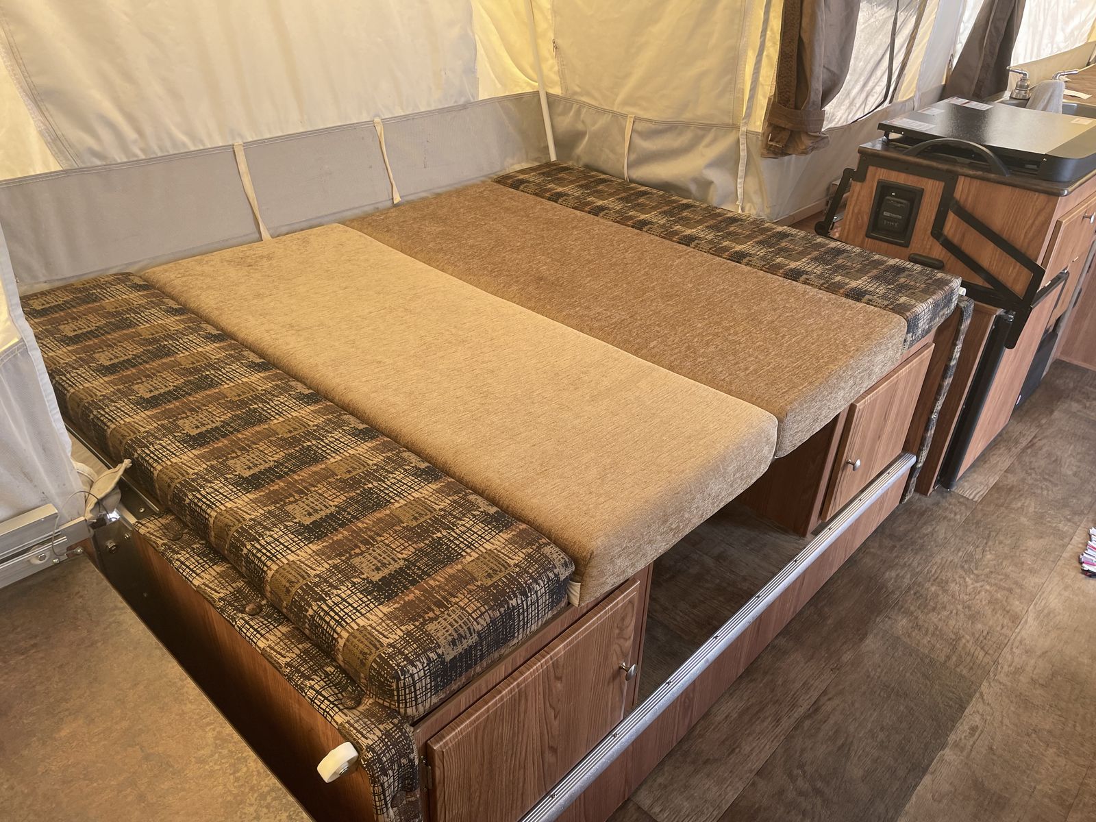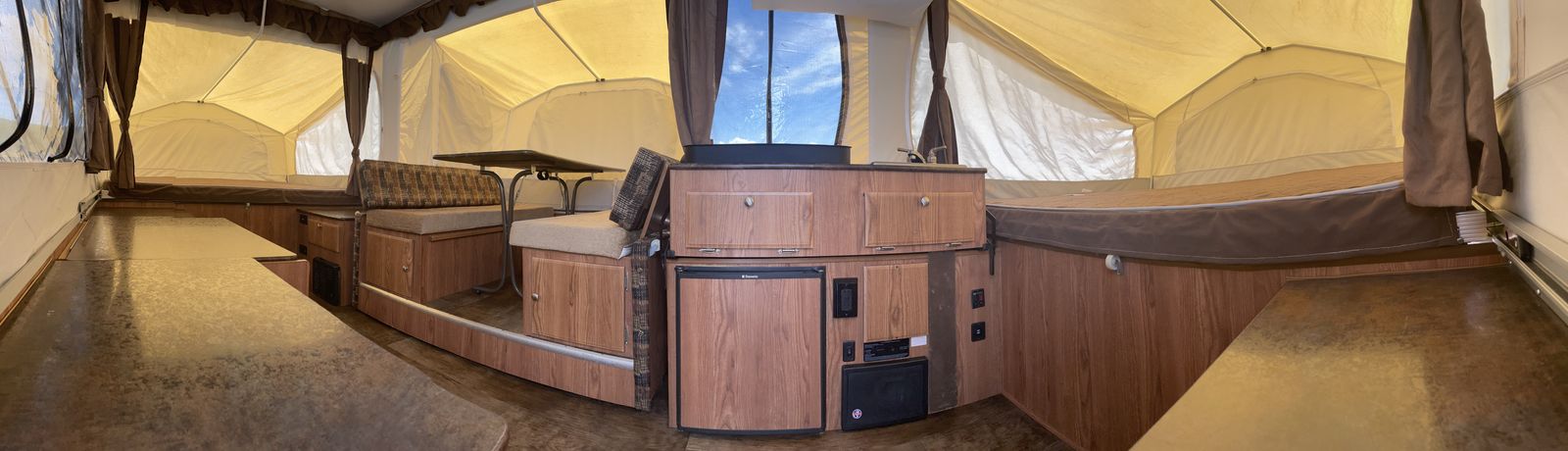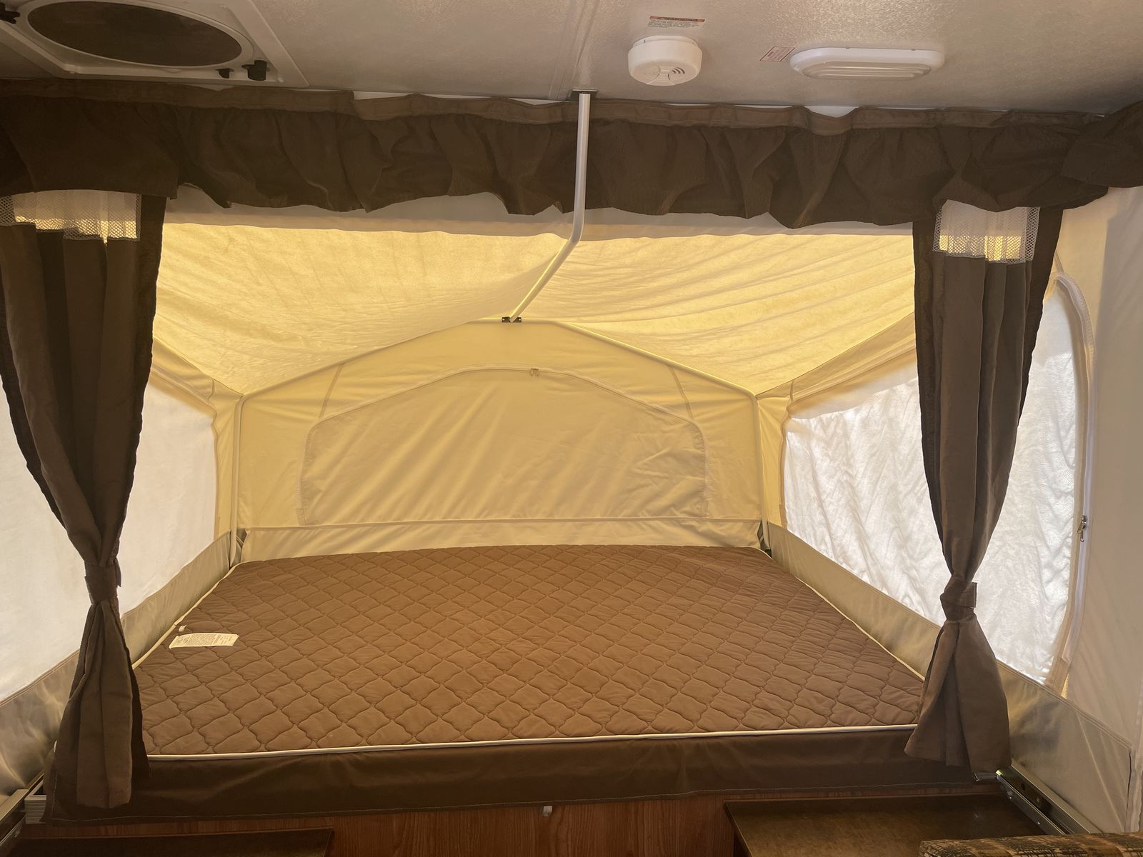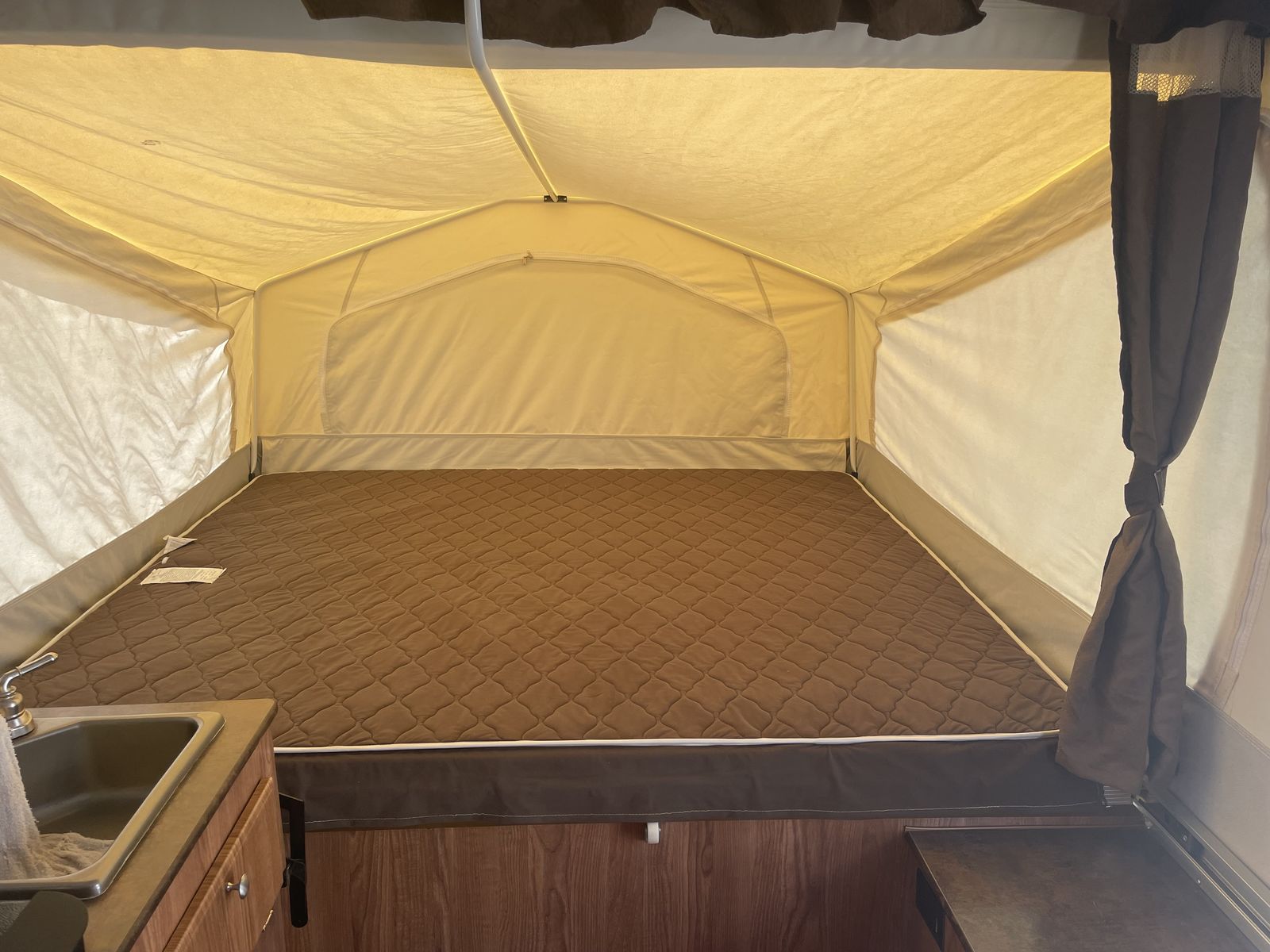 The single slide Rockwood Freedom 232XR folding pop-up camper features 54 x 84 front deck storage with expanded metal decking outside. The front king and rear queen tent end beds offer comfortable sleeping. The back wall offers a swing galley with a single bowl sink, three burner stove top and refrigerator (included). The back rear corner houses a cabinet where the heater is included. A slide out housing a booth dinette with a water heater under the seat completes this wall. Along the entry wall you will find a shower/porta-potty cassette as well as lots of storage cabinets. Includes outdoor gas grill.