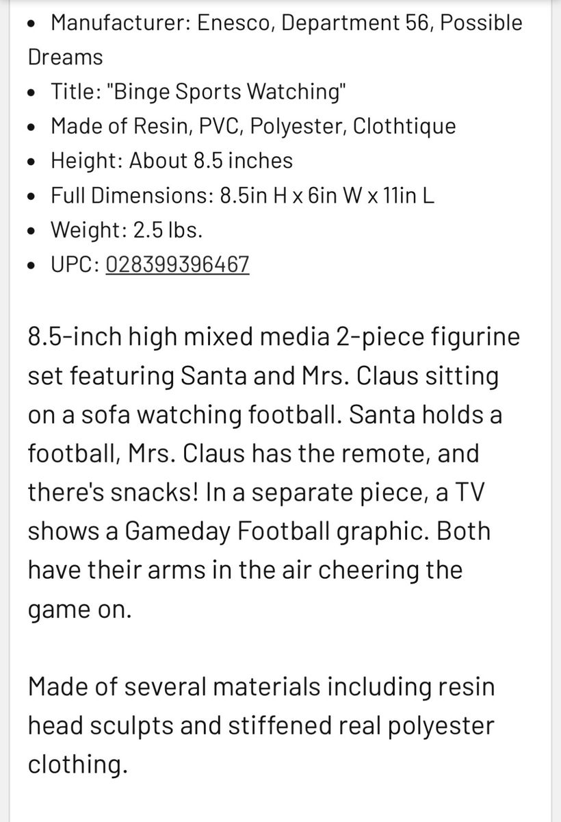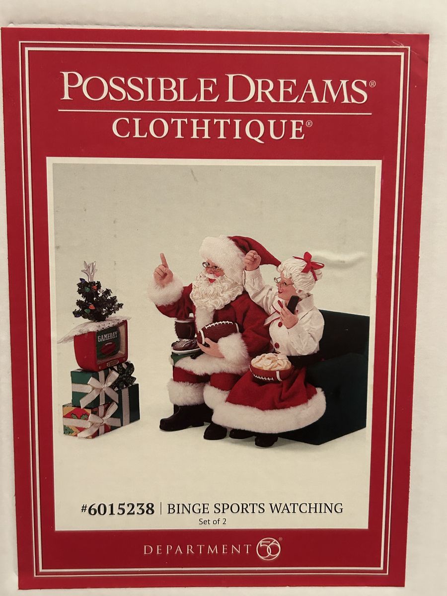 VenmoI have 4 new in box (NIB) Possible Dreams Clothique Binge Sports Watching Santas with Mrs Clause. These are $135.00 a piece online and are highly collectible. Out of room for Christmas item storage so have to let them go for cheap. $30 each or $100 for all 4.