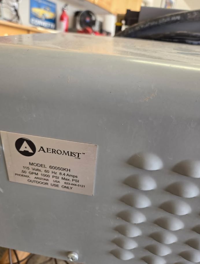 Patio Mister Aeromist Pinnacle E Misting Pump .50GPM Model: 60050KH Manufacturer: Aeromist Approx 75 lbs or so Approx 6-12 months old, never used. New condition, hoses included. This unit is top of the line, attached manufacture website info. 1,000 PSI misting pump. Cat Pump, compatible with both 120V and 220V power sources. Fully enclosed fan-cooled motor. Automatic overload protection. and ready to put to use. Patio misters are popular for restaurants patio settings, high end homes, etc. to keep cool during the hot months.