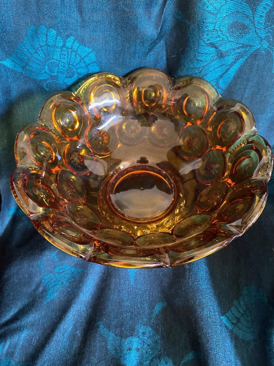 This beautiful LE Smith Amber Glass Bowl in the Moon and Stars pattern measures 10" across and stands just under 5" tall. In great shape--like new. This is probably from the 1960s to 1980s.