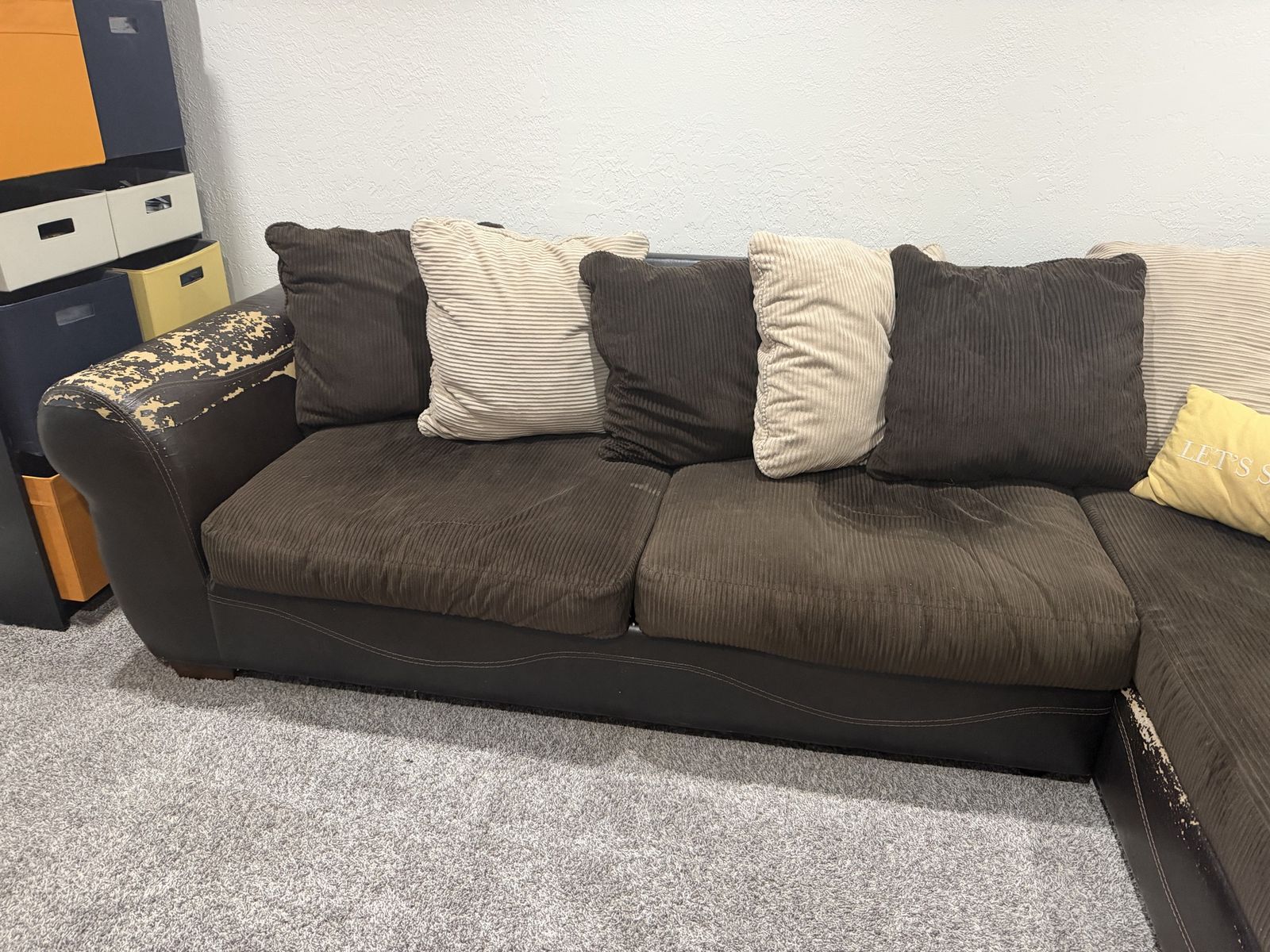 Im giving away a used sectional couch. It comes apart in 2 pieces. Cushions are soft, the middle one has a bit of a butt print, the faux leather on the arms is peeling. We have a dog but he didn’t use it. It’s free.