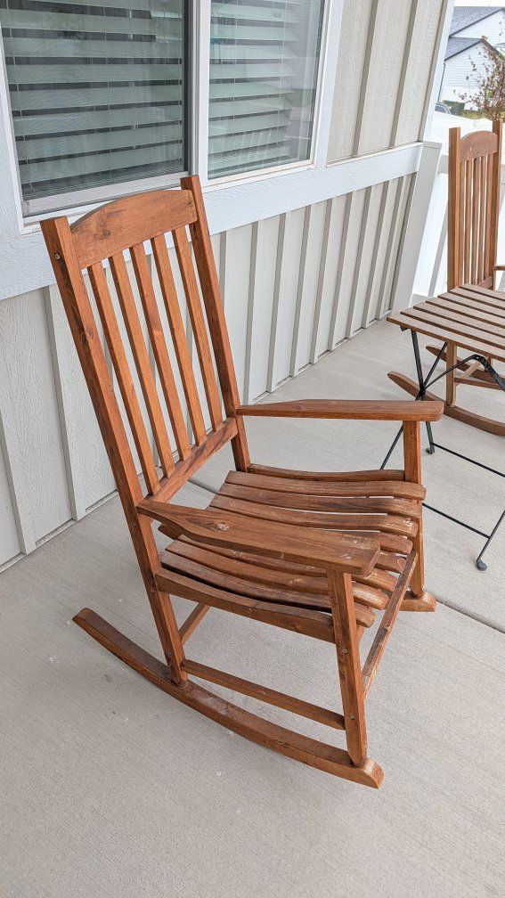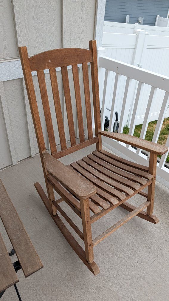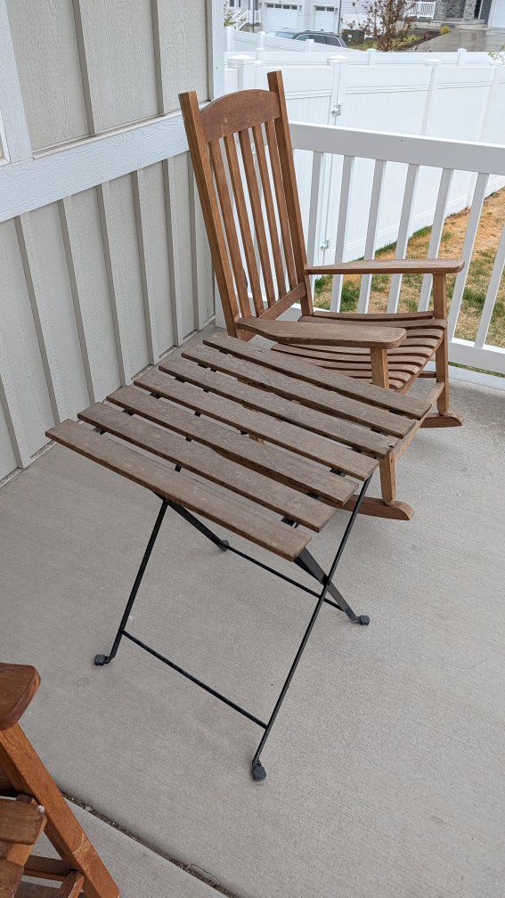 2 Rocking Chairs and a table. They are structurally fine and work well. They just need a good cleaning and maybe some sort of wood treatment to bring them back to life a bit.