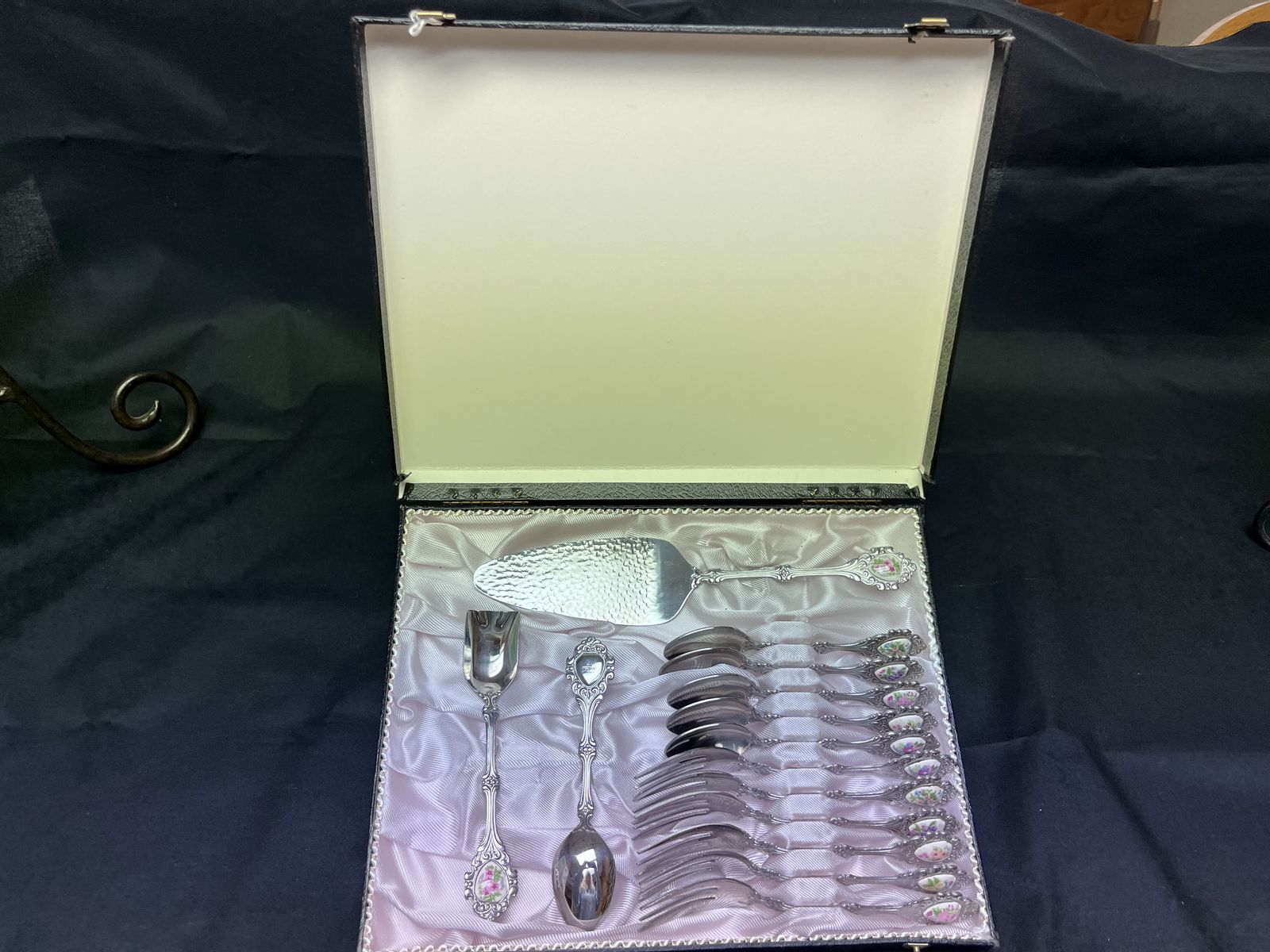 Venmo6 Forks, 6 Spoons, Sugar Shovel and Cake/Pie Server. All with enamel Rose Handles in original case.