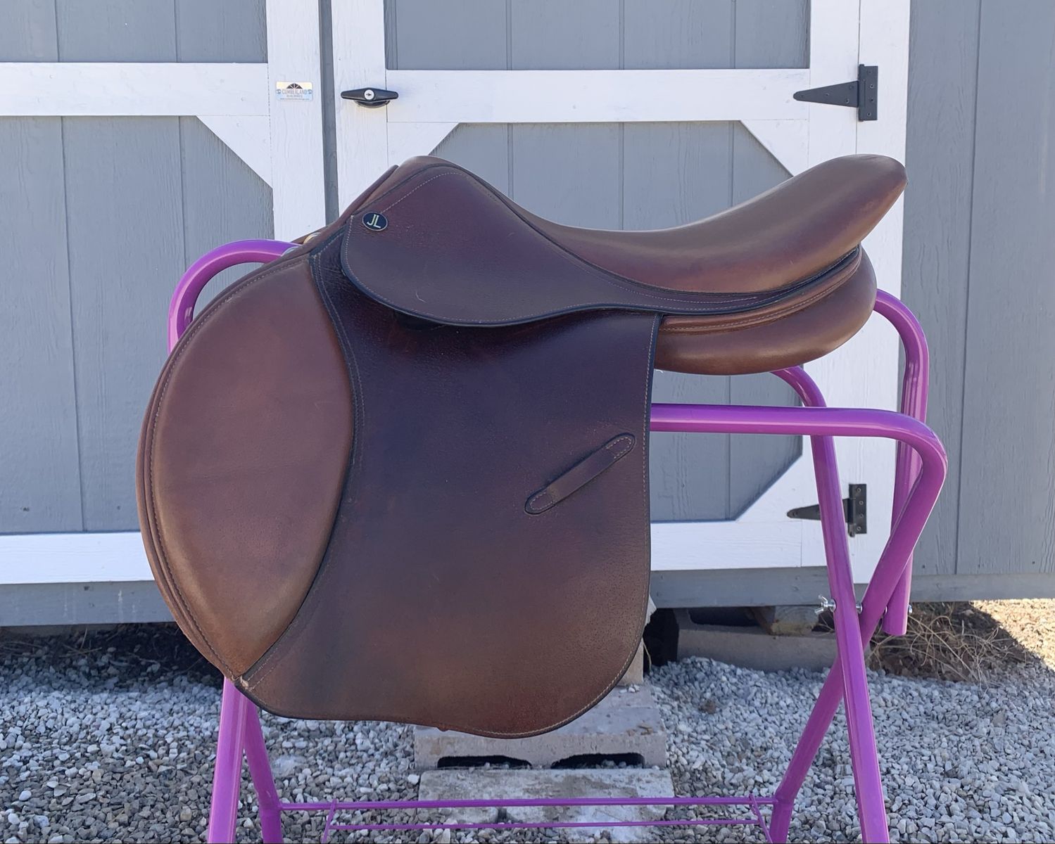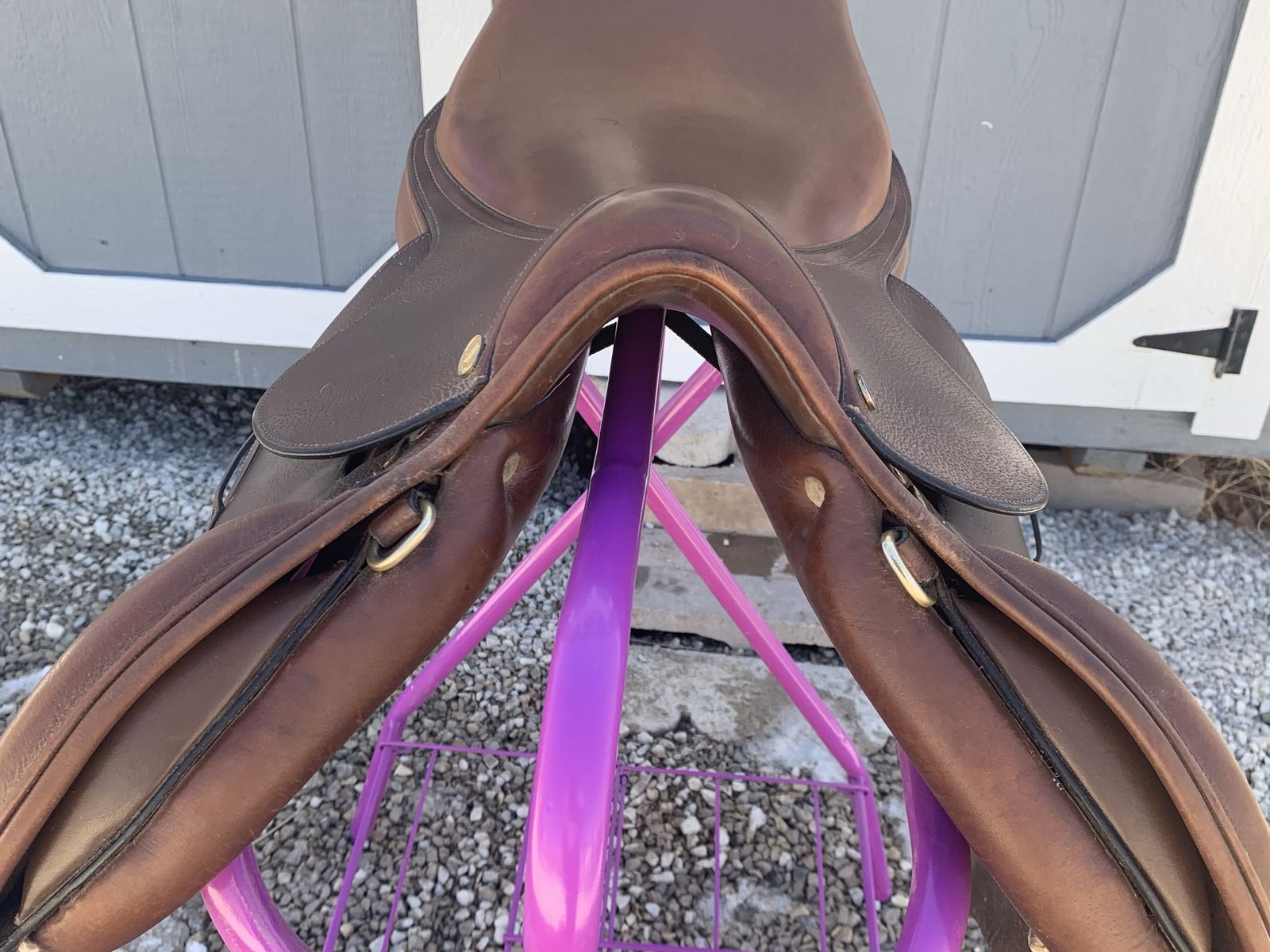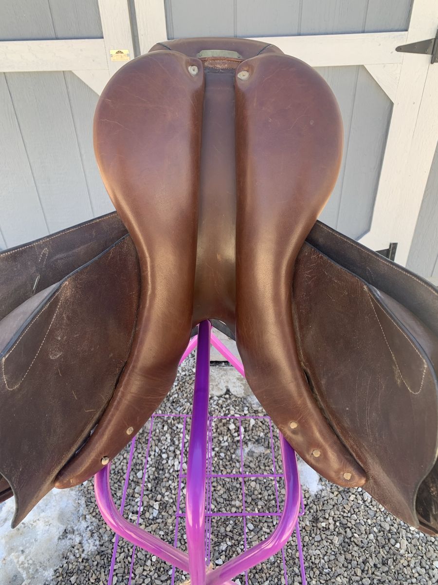 17.5" jumping saddle. 13.5" wide flaps 4.25" dot to dot. Used with little ware. Fits a bit more like a 17". Very nice saddle made by a saddler in Kansas and extremely comfortable but doesn't fit me well