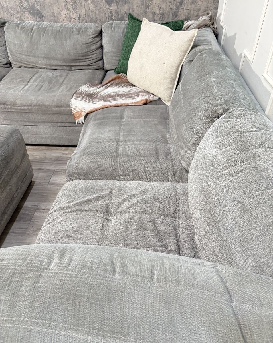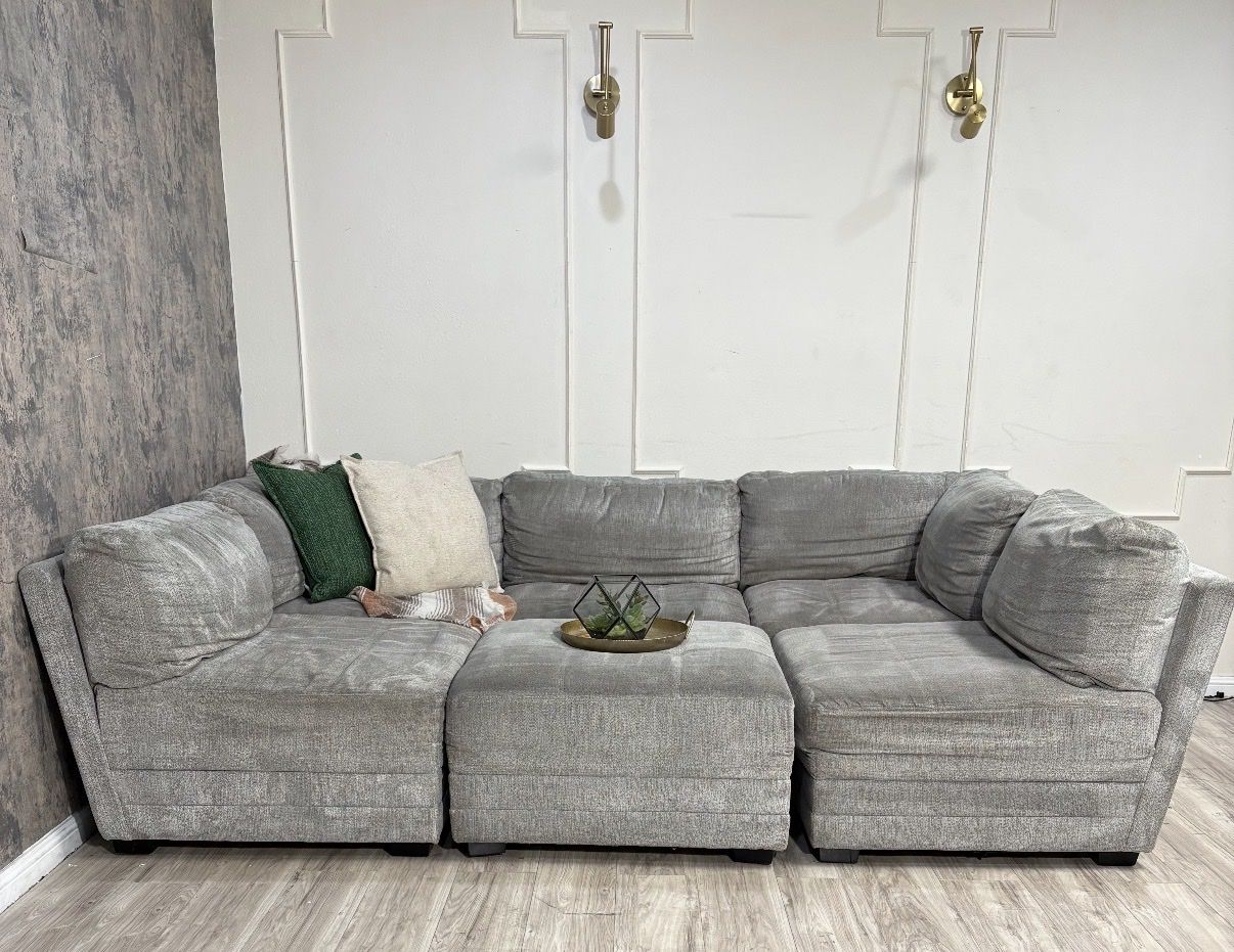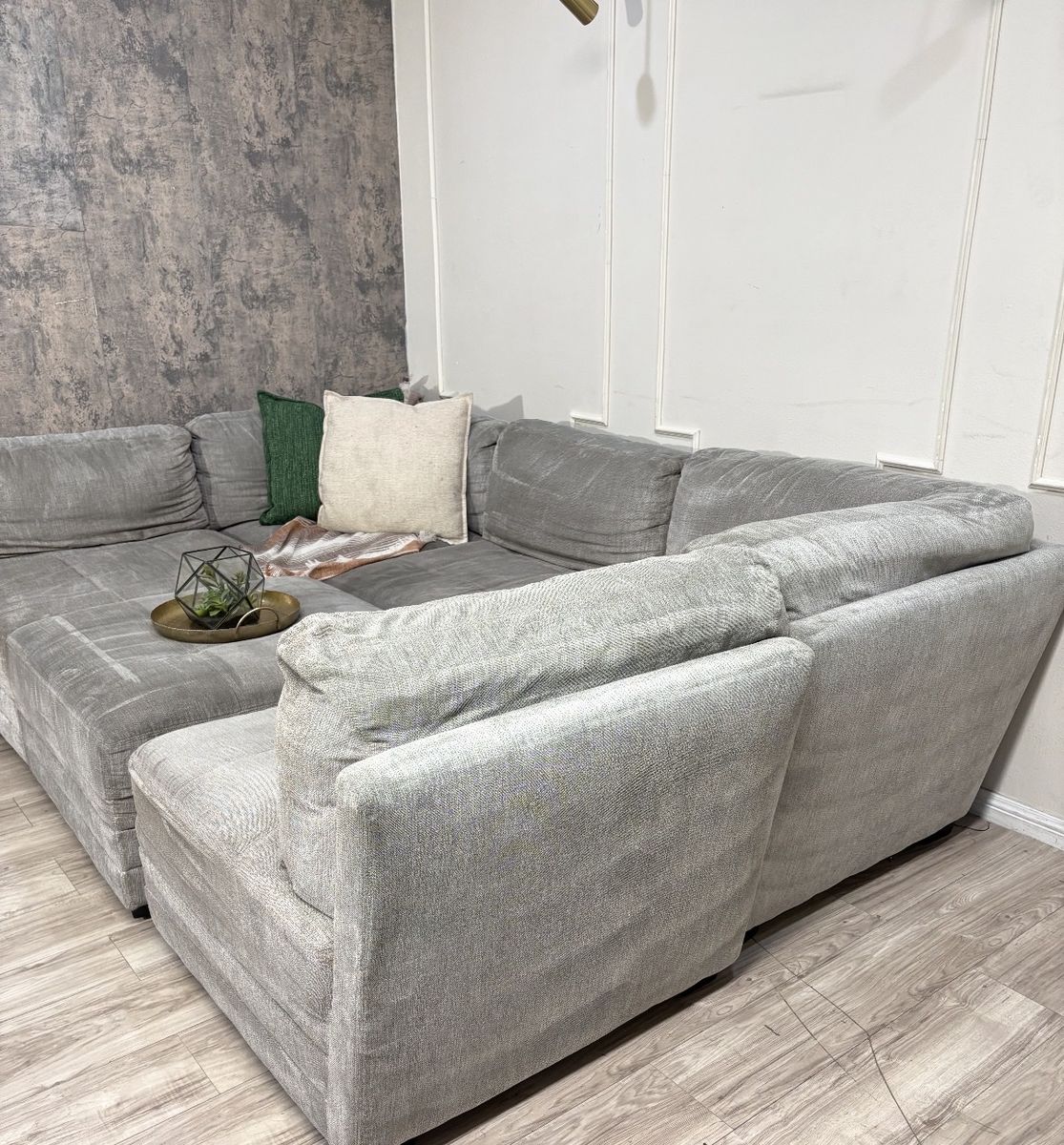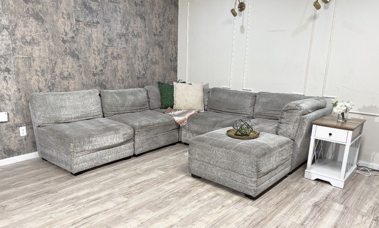 This is an amazing modular sectional. Color is light grey has some wear show overall very comfortable and perfect for lounging. It is 6 pieces can be reconfigured as needed.