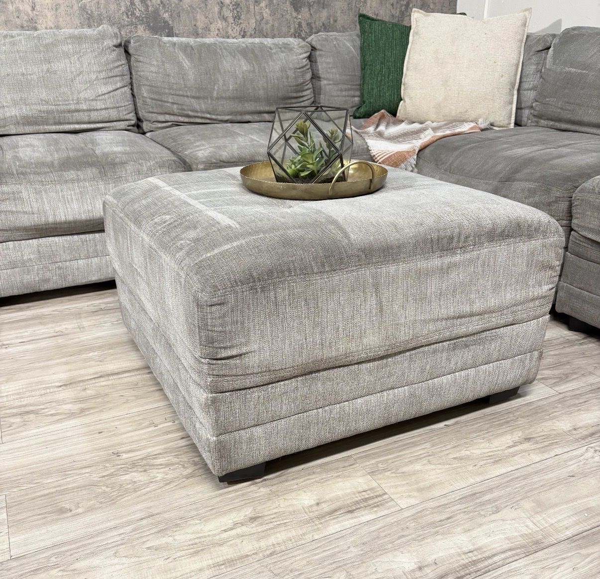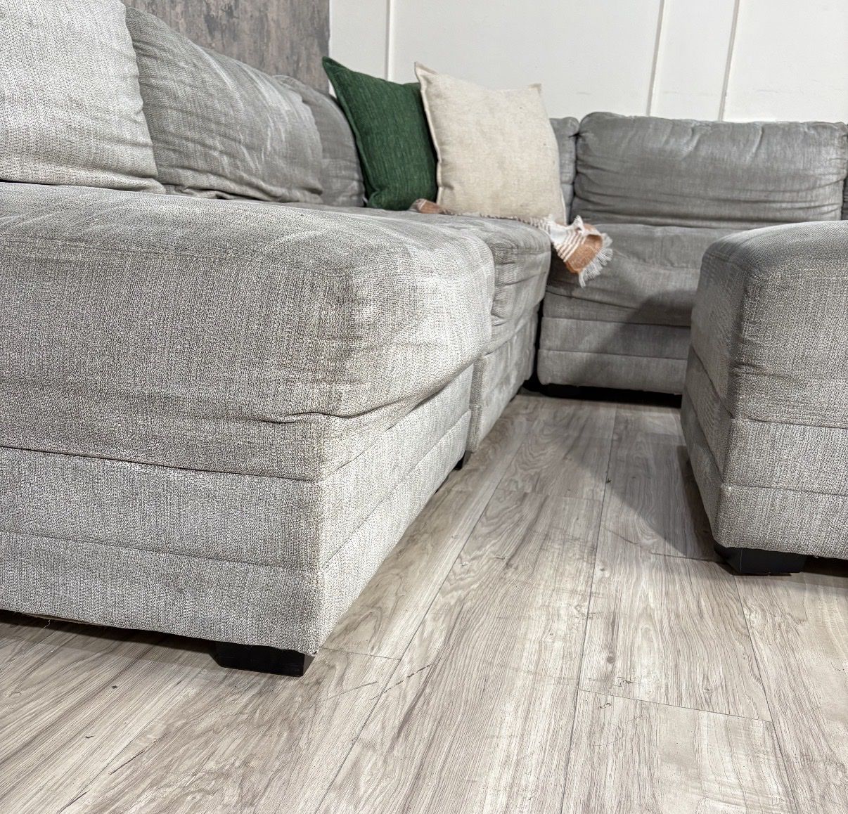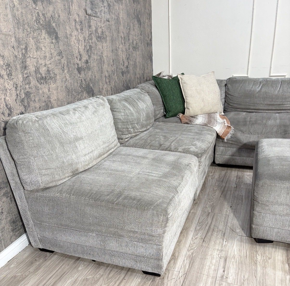 This is an amazing modular sectional. Color is light grey has some wear show overall very comfortable and perfect for lounging. It is 6 pieces can be reconfigured as needed.