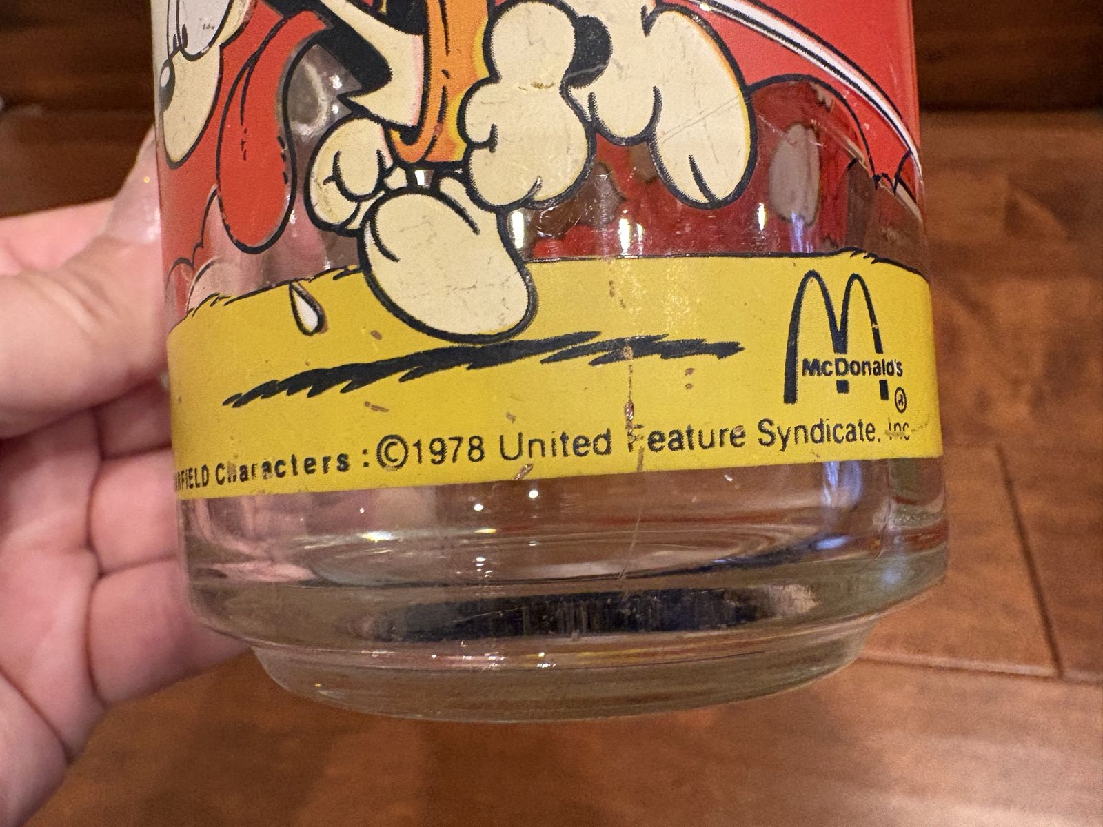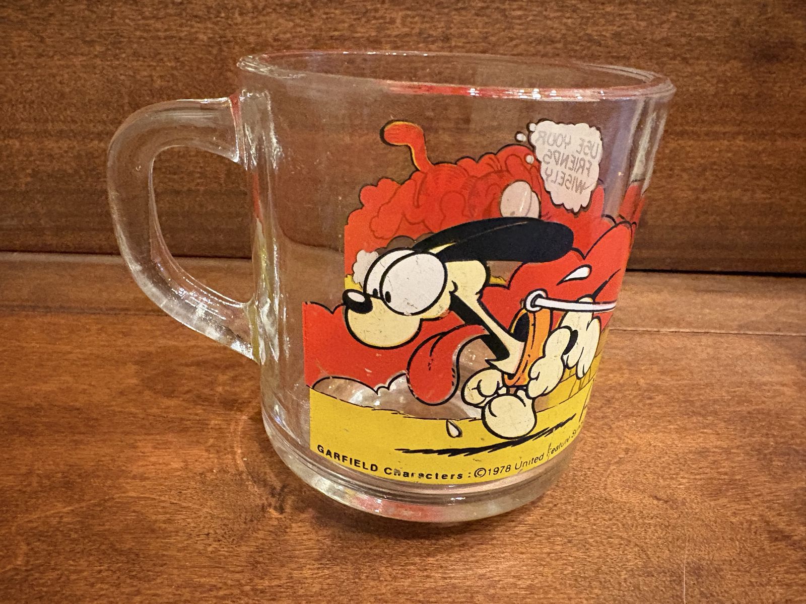 I have a vintage glass mug from McDonald’s in 1978. It is Odie pulling Garfield on a skateboard. Garfield says “Use your friends wisely”. It is 3 1/2 inches tall and 4 1/2 inches wide with the handle. See my other ads for jewelry, artwork, home decor and more.