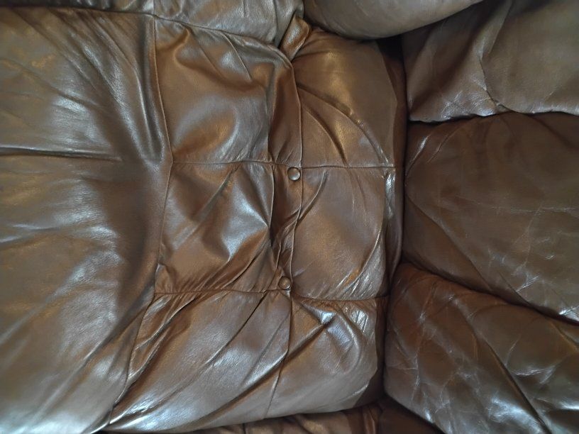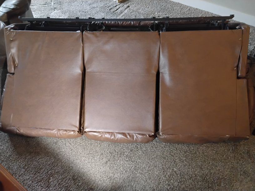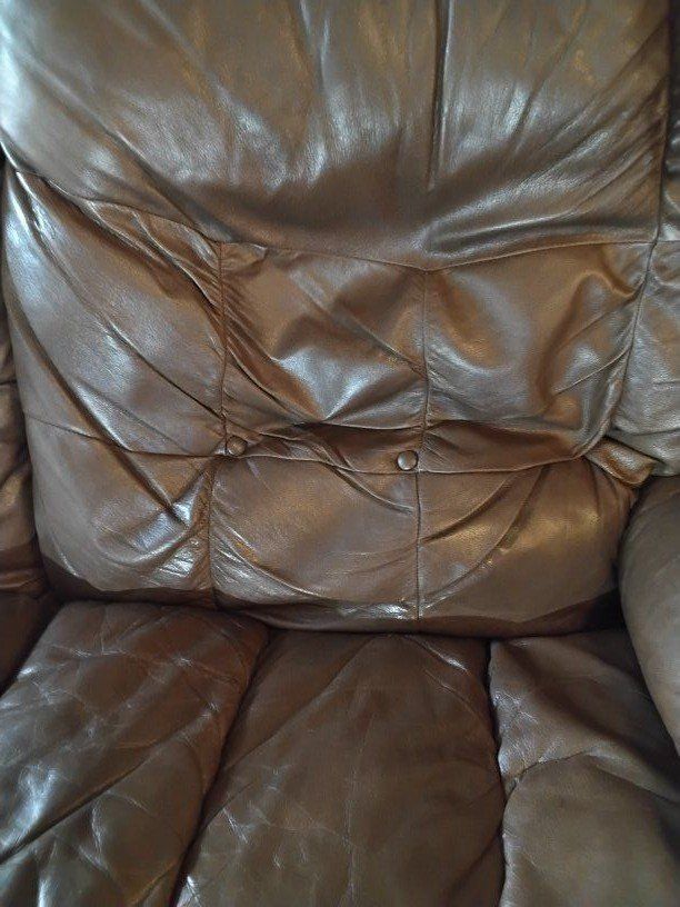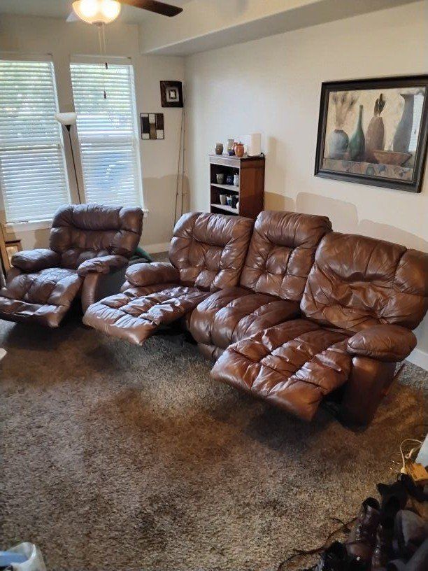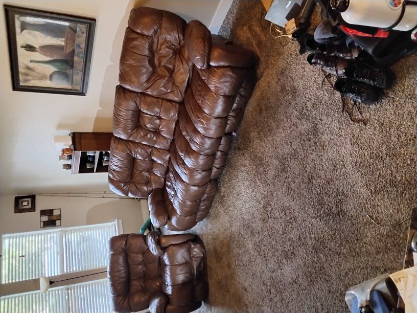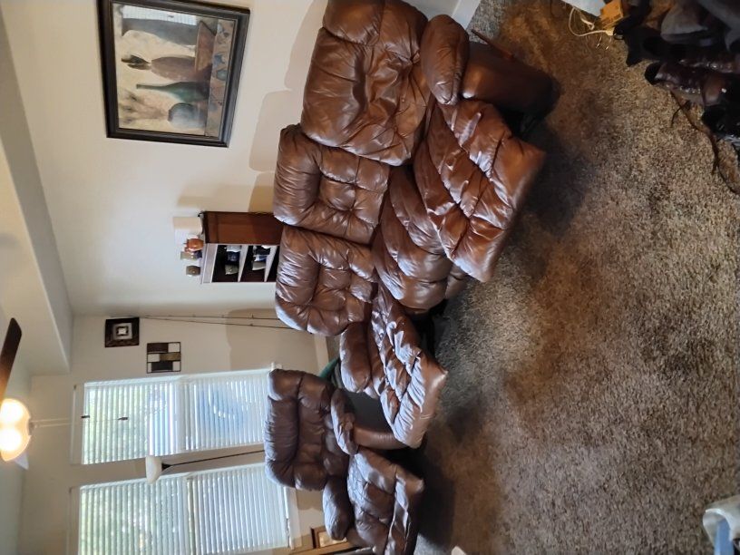Selling a high-quality leather reclining set (originally $1,750). This is Best Chairs Inc. brand—very sturdy with solid hardwood frames and heavy-duty steel mechanisms. Features: Dual Reclining Sofa: The two ends recline for maximum comfort; the center seat is stationary. Matching Rocking Recliner: Large, overstuffed matching chair. Easy Move-Out: Items are on the ground floor right inside the front door. No stairs or elevators! Easy to back a truck right up. Condition: Clean and from a smoke-free home (no funky smells) Mechanisms work perfectly. A few minor cosmetic tape repairs on the back/arm (invisible if against a wall) and two missing buttons on one side.