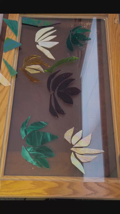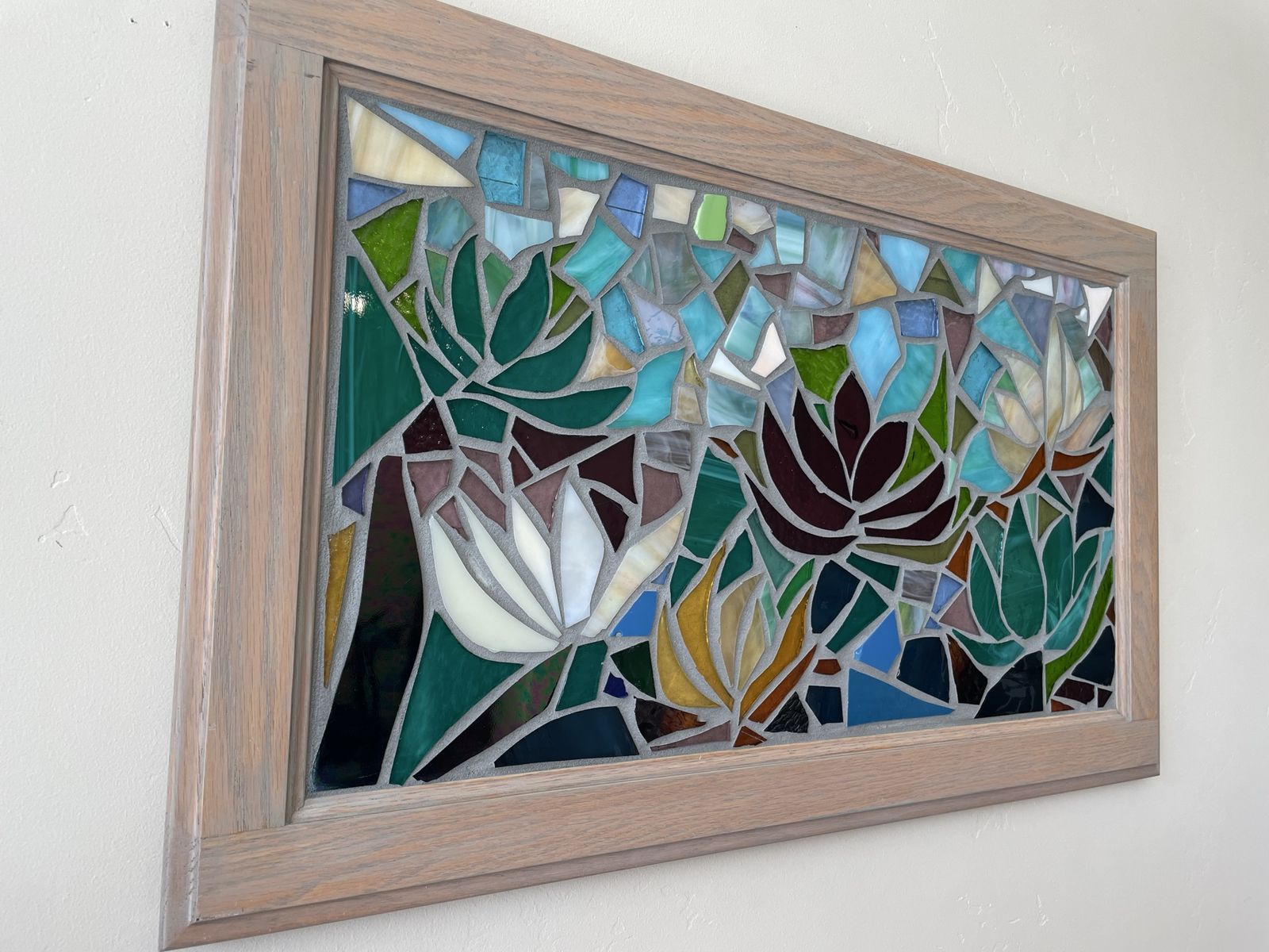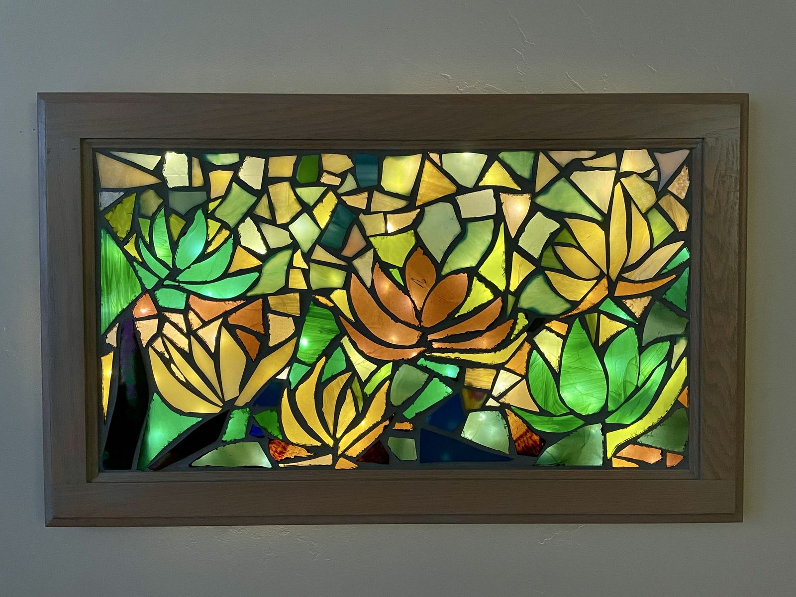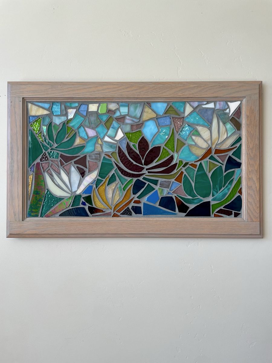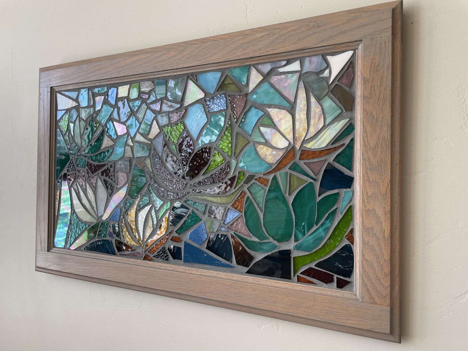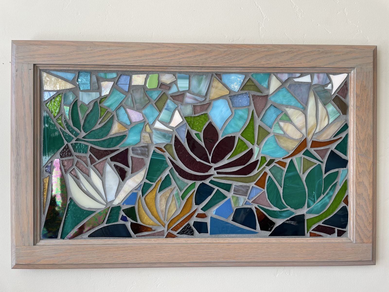 VenmoGlass on glass mosaic of a lovely lotus garden. Handmade using stained glass & broken antique crystal. Creatively arranged & framed in whitewashed oak. Grouted & sealed to last a lifetime! Taking broken peices and making something so beautiful and complete! Hang in a window for a a gorgous stained glass effect that will light up your world!