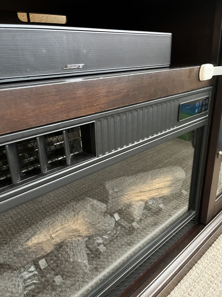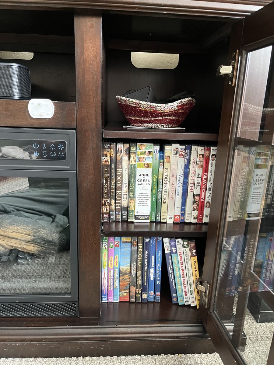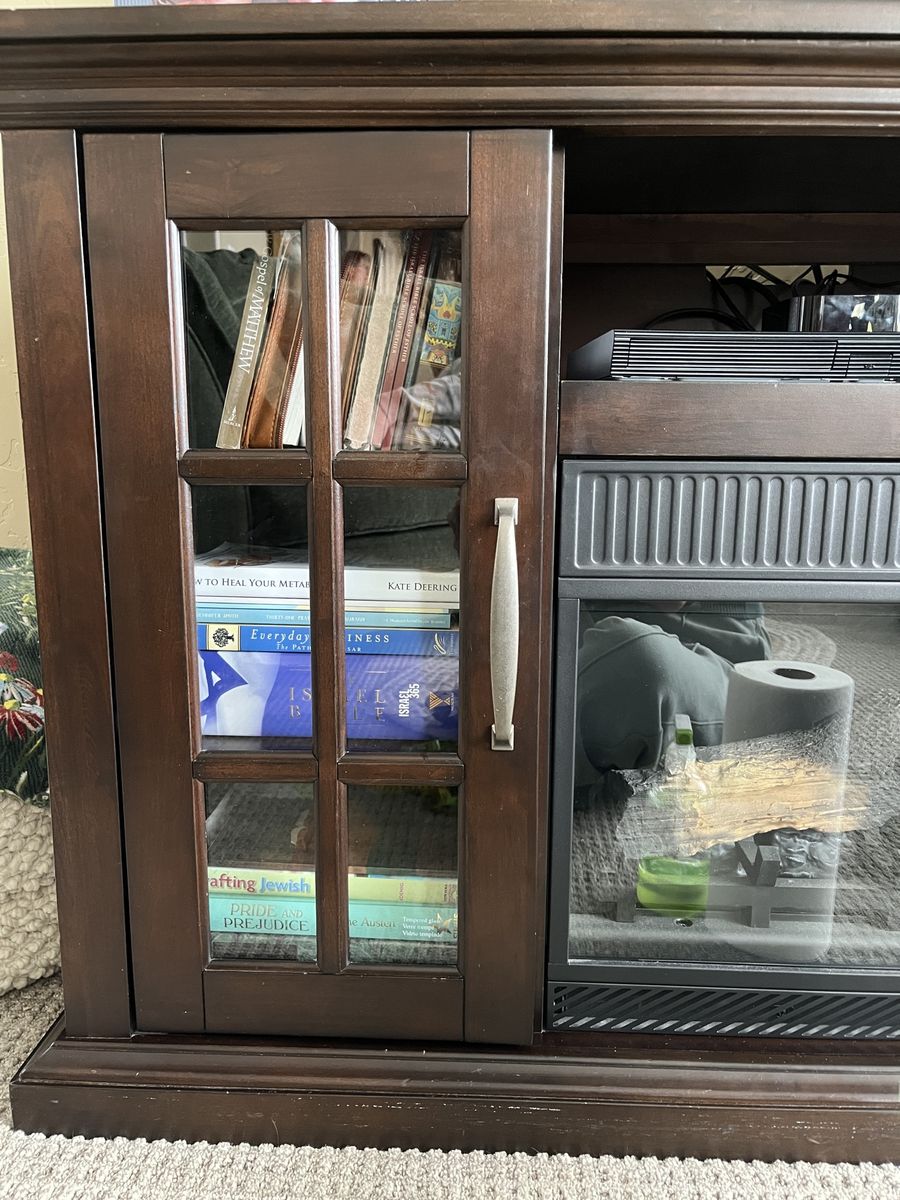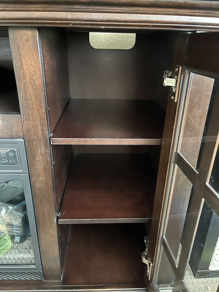 This beautiful dark oak electric fireplace/television stand is the perfect solution for living/family rooms that need some aesthetically pleasing storage. This unit boasts six shelves behind tempered glass and one center shelf that’s perfect for sound systems, dvd players, and other television accessories. The shelves are the perfect height for dvds or books and a lovely place to tuck remotes away when you want to focus on family time instead. The heat on this unit needs repair, but the fire still visually appears. We believe the issue has to do with a wire connection, so if someone has electrical expertise, the fix may be incredibly simple.
