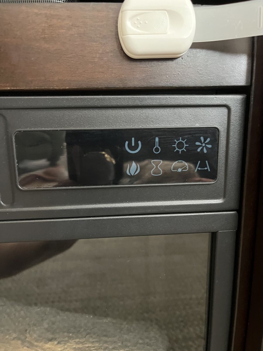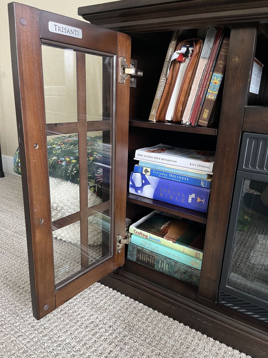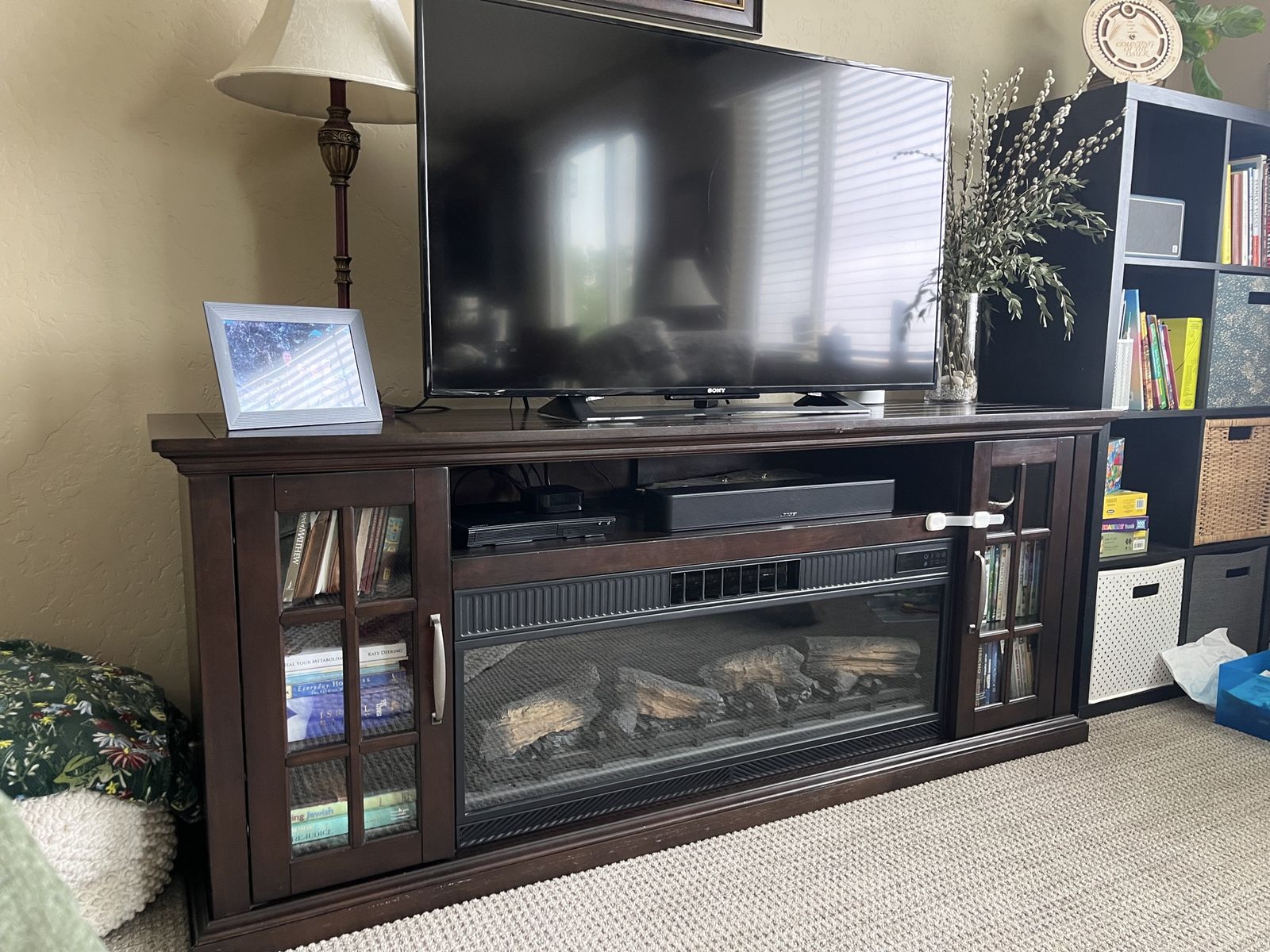 This beautiful dark oak electric fireplace/television stand is the perfect solution for living/family rooms that need some aesthetically pleasing storage. This unit boasts six shelves behind tempered glass and one center shelf that’s perfect for sound systems, dvd players, and other television accessories. The shelves are the perfect height for dvds or books and a lovely place to tuck remotes away when you want to focus on family time instead. The heat on this unit needs repair, but the fire still visually appears. We believe the issue has to do with a wire connection, so if someone has electrical expertise, the fix may be incredibly simple.