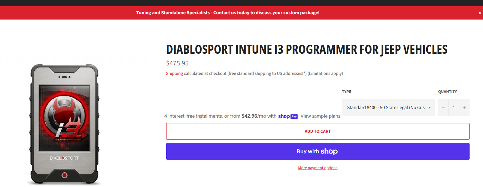 Fits 2005-2006 Jeep Wrangler TJ, 2005-2014 Grand Cherokee, 2006-2010 Commander, 2007-2014 Wrangler JK (DBS-8400) Features Multiple tunes available to increase horsepower and torque “Easy Tune” mode for a quick and simple installation Works with Windows, Mac, and Linux Allows for the checking and clearing of trouble codes Remove the top speed limiter Adjust speedometer to adjust to different tire sizes Modify transmission timing Able to purchase multiple vehicle licenses to use the same tuner on multiple vehicles A myriad of adjustable parameters that are application specific Update on the go with Wi-Fi connectivity 50 State Legal Certification under CARB E.O. # D-770 Description Take back control of your engine with a DiabloSport inTune i3 programmer. Increase horsepower and torque, modify engine timing, clear trouble codes, and much, much more. DiabloSport dyno tests all of their application specific tunes to ensure maximum horsepower and torque. The inTune i3 features a new and improved display that is easy to navigate in comparison to its predecessor. Most supported vehicles have the ability to remove the top speed limiter, adjust speedometer for different tire sizes, and adjust transmission shifting. There are even more adjustable parameters based on specific applications, everything from disabling the active fuel management, adjusting REV limiter, taking control of cooling fan, and much, much more. DiabloSport inTune i3 programmer has taken the game to the next level, and the amount of control this simple machine offers you over your engine is unparalleled. Installation The DiabloSport inTune i3 Programmer offers a simple at home installation with no drilling. The included installation manual and quick start guide are easy to read. For additional information, please don’t hesitate to call us.