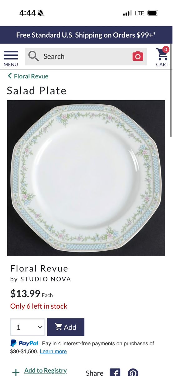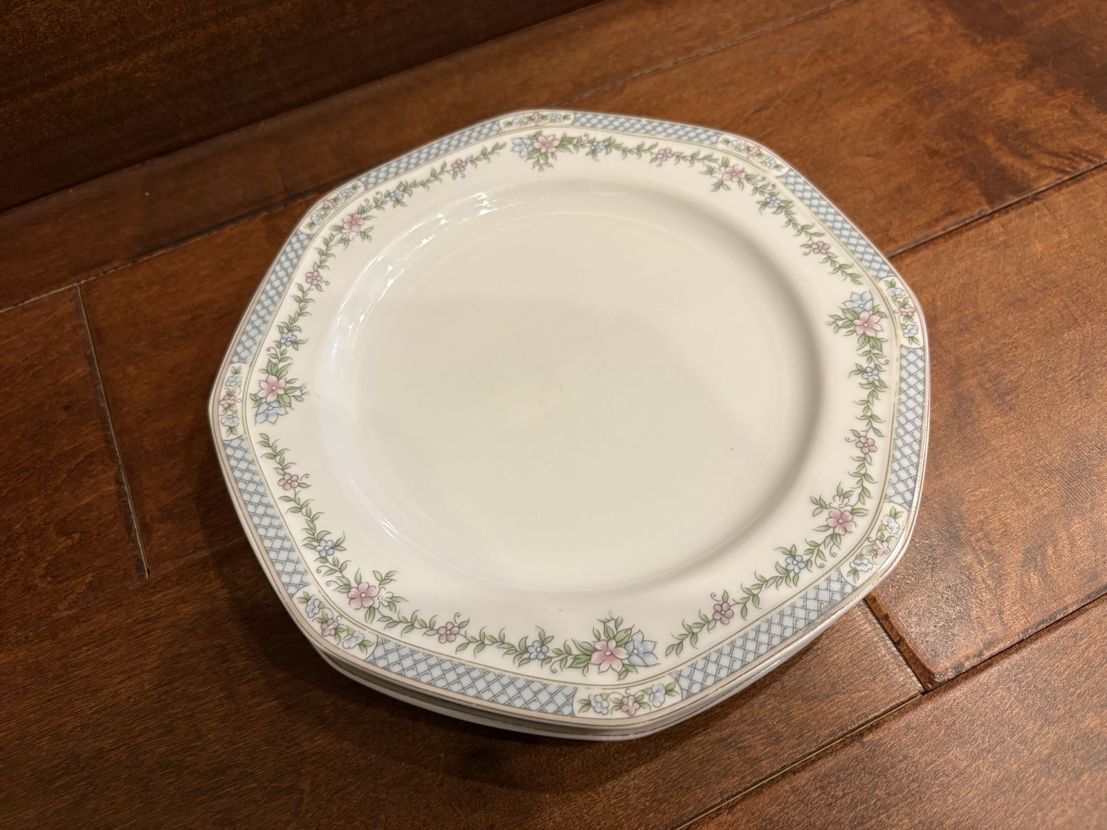 I have 3 vintage Studio Nova Floral Revue salad plates. They have a unique octagonal shape and are 8 inches across. They’re are white with blue and pink flowers. The last picture shows they sell on Replacements.com for $13.99 each. I’m asking $18 for all of them together. See my other ads for jewelry, artwork, home decor and more.
