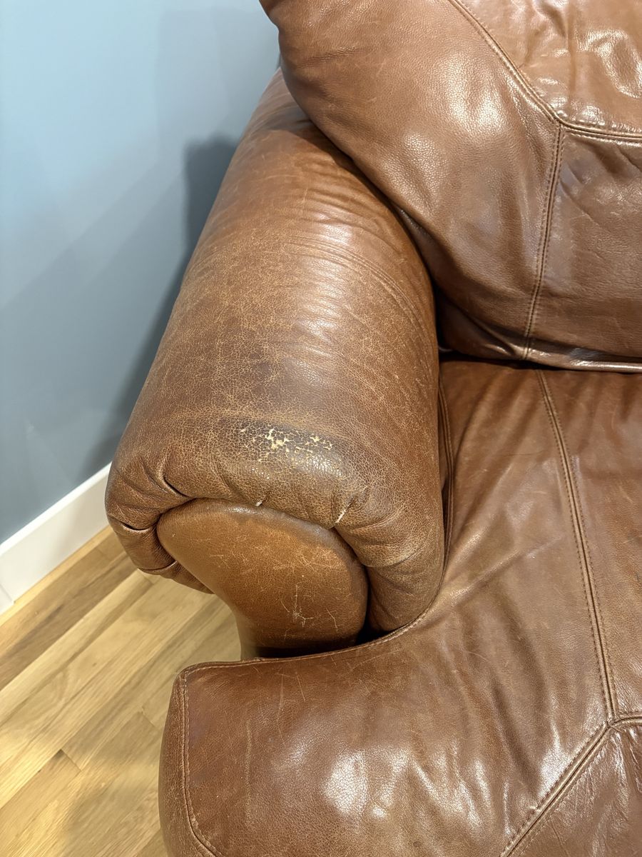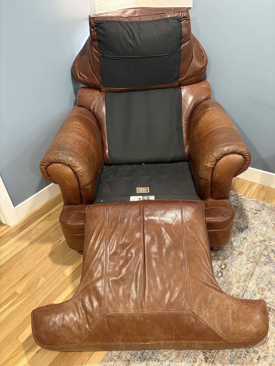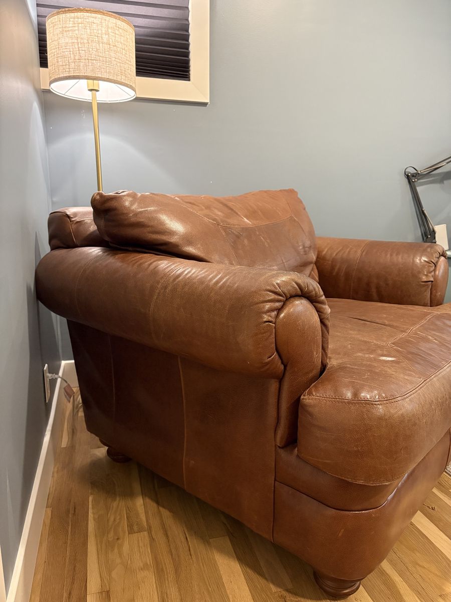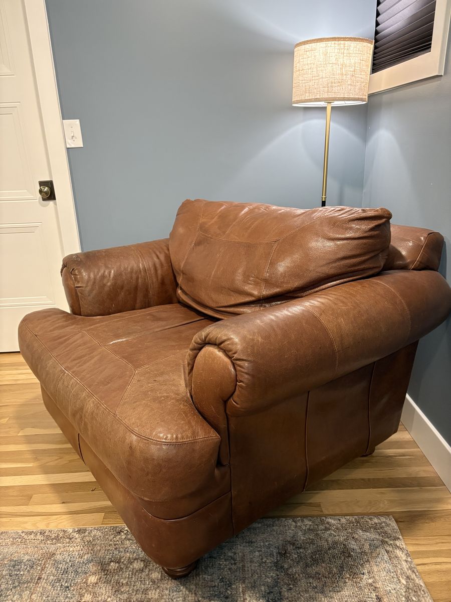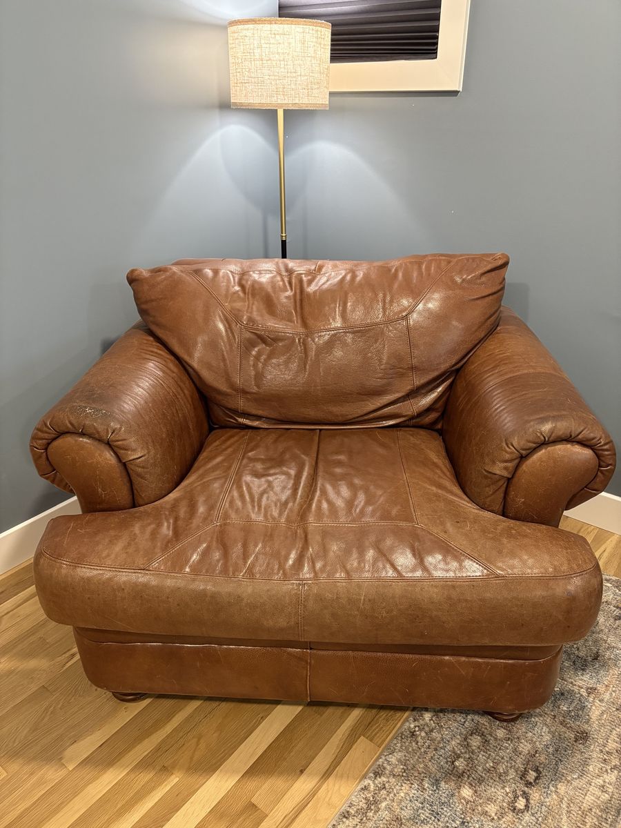 ZelleLarge, super comfy, leather armchair. No rips or tears. Truly a versatile and timeless piece of furniture. The feet can be unscrewed and seat cushion removed for ease of moving. Measures 44” wide, 44” deep and 34” tall.