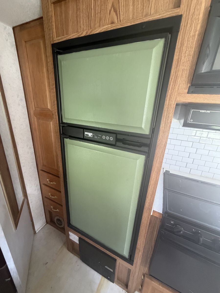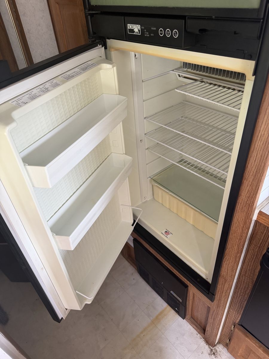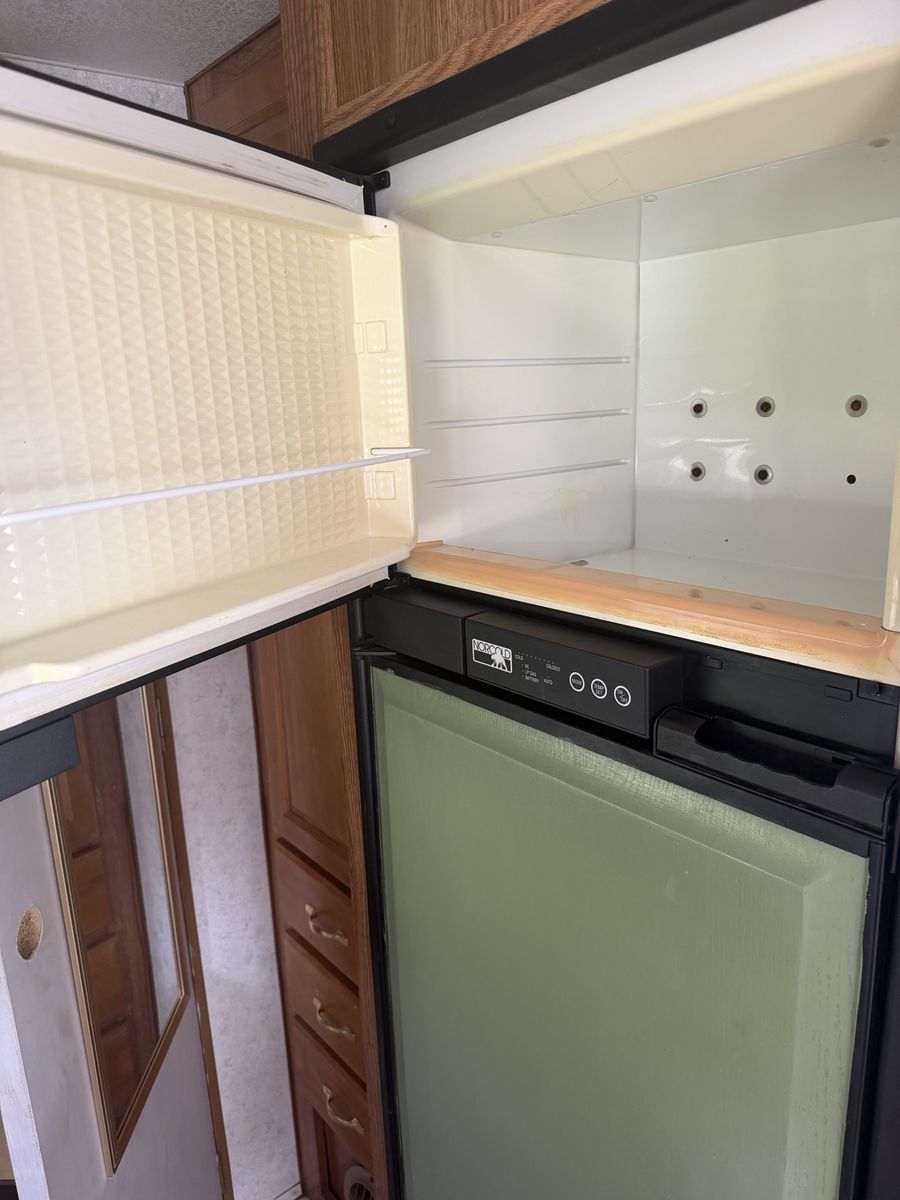 Clean inside. Queen bed in the front, twin bunk beds in the back. Table folds down to a bed and the couch pulls out to a full sized bed. Our family is too big for it or we would keep it!