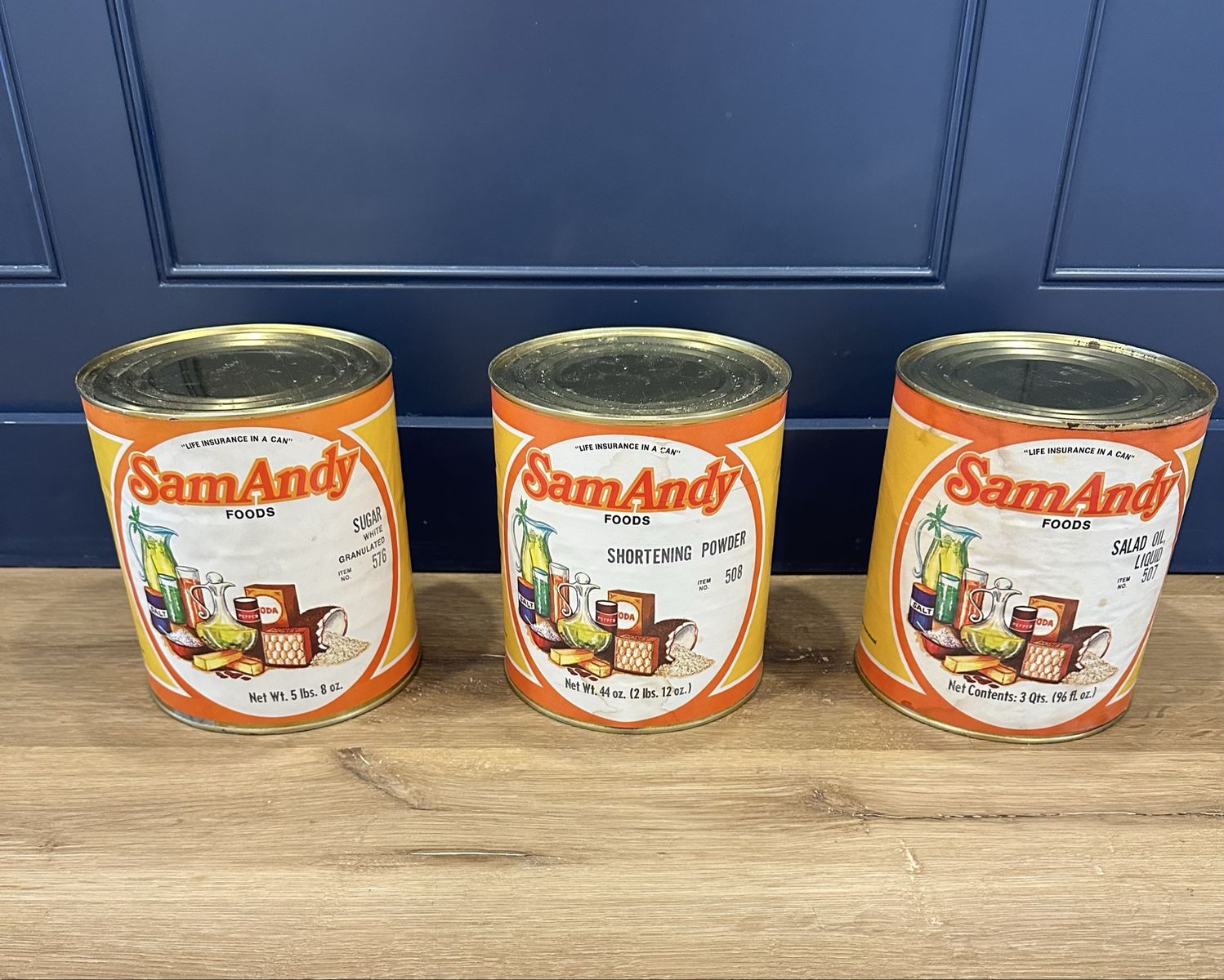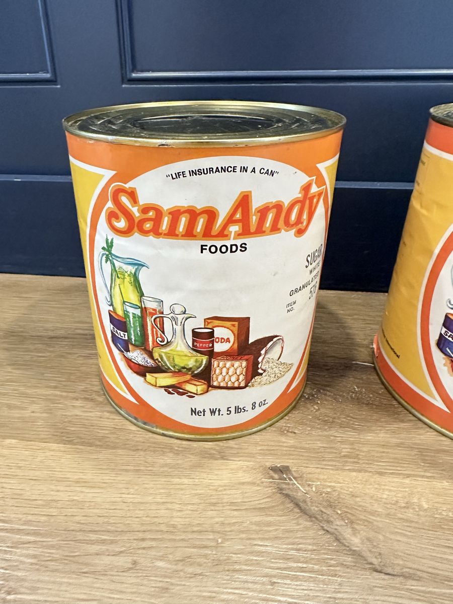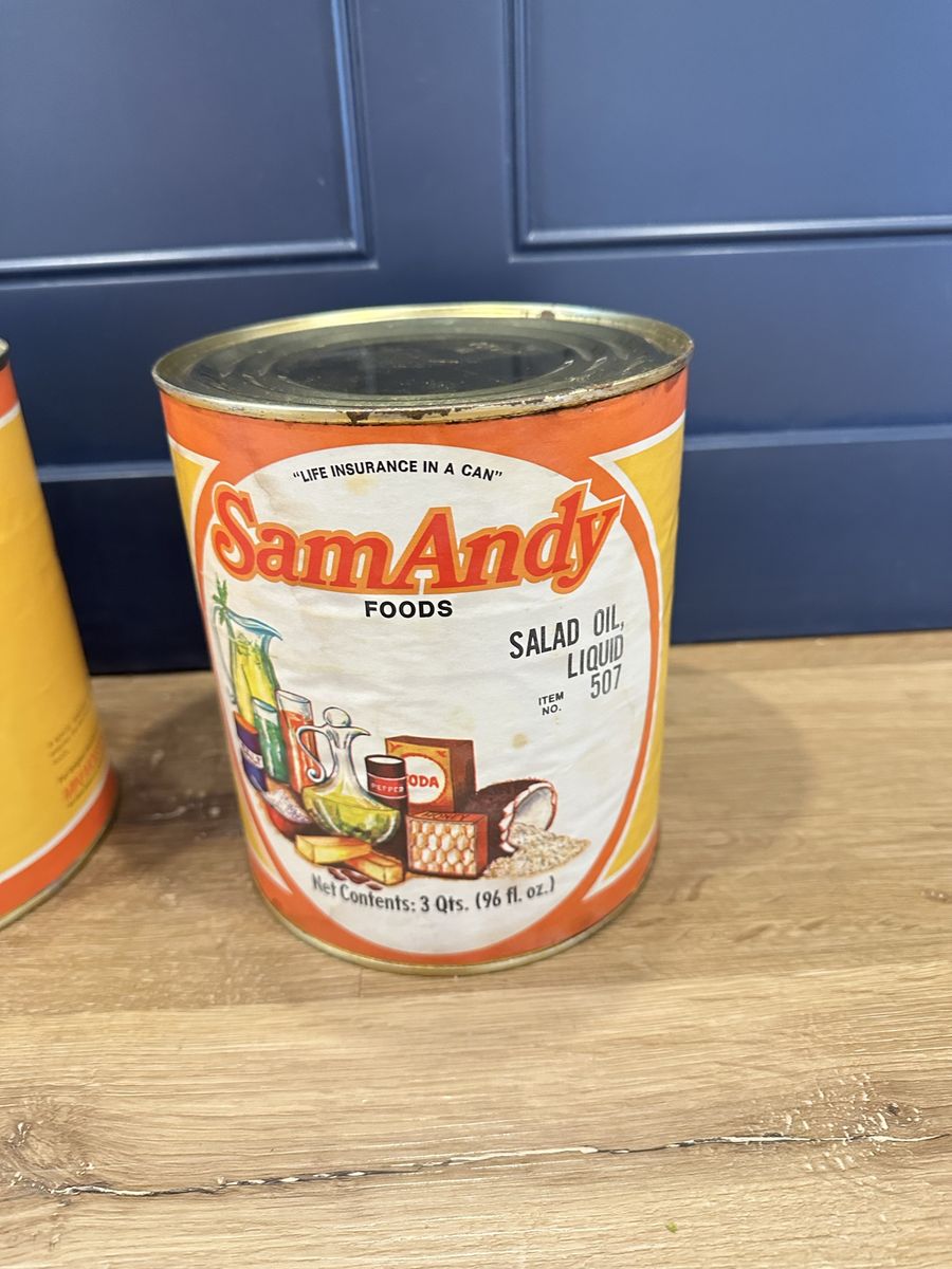 VenmoVintage SamAndy Foods "Life Insurance in a Can" survival food storage containers from the 1960s or 1970s. The cans include salad oil, granulated white sugar, and shortening. SamAndy Foods was a popular brand for long-term food storage prepper supplies during that era. These items are now considered collectibles among vintage packaging enthusiasts. While meant for long-term storage, the food within these vintage cans is generally not considered edible today.