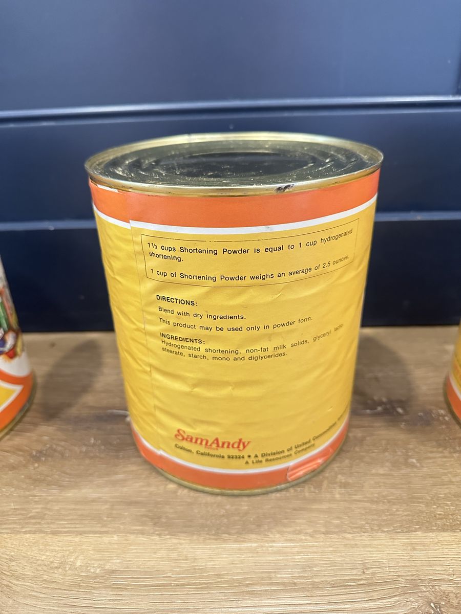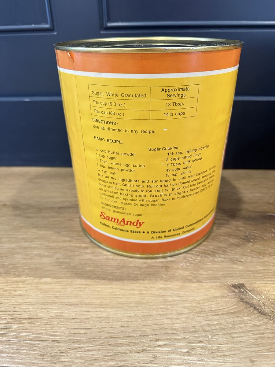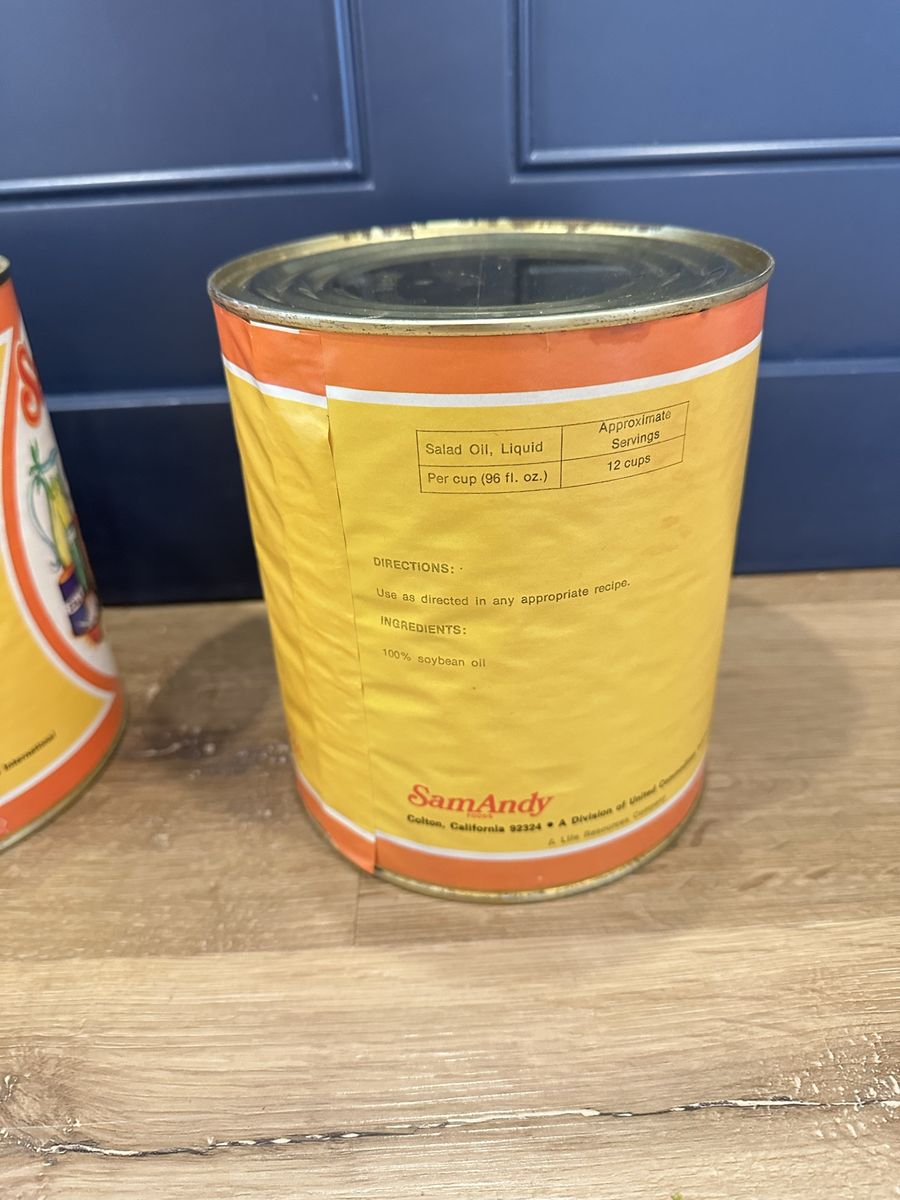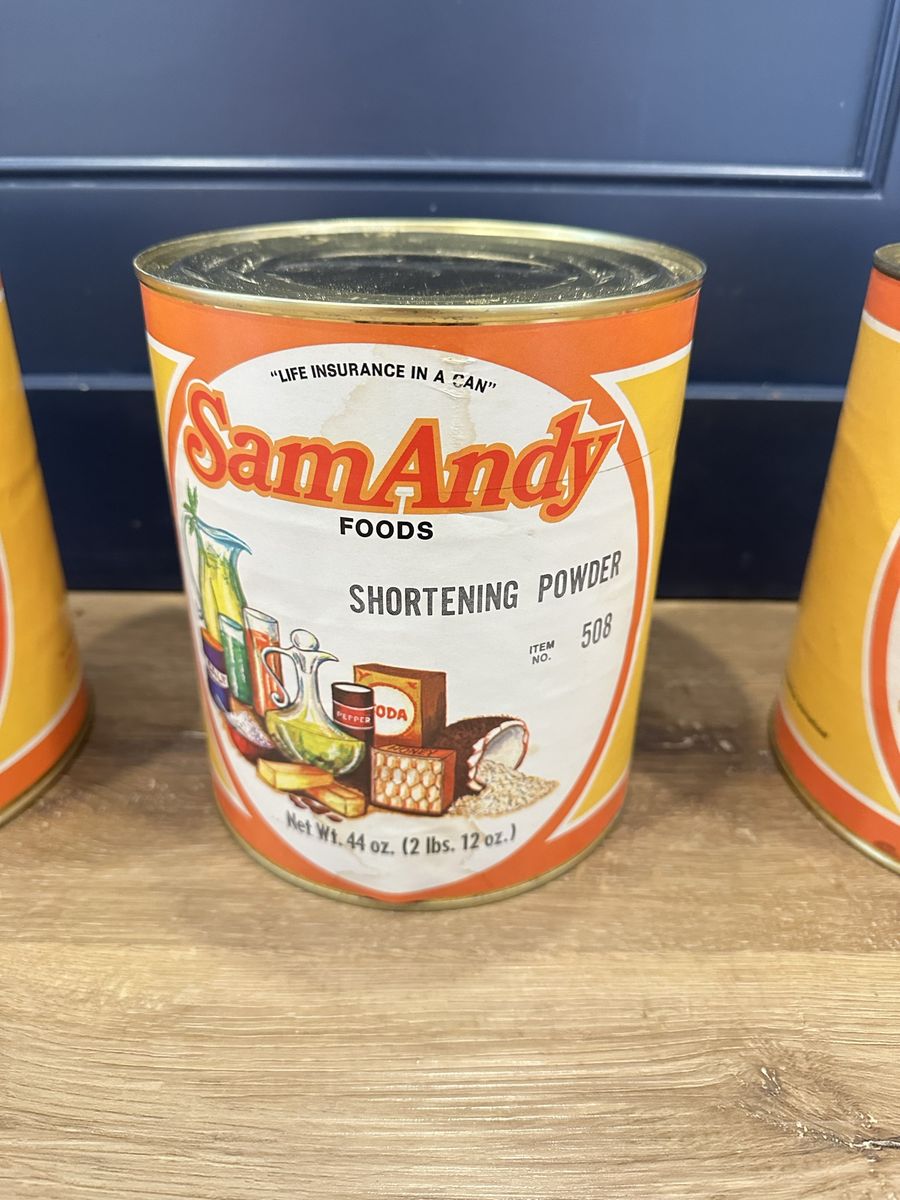 VenmoVintage SamAndy Foods "Life Insurance in a Can" survival food storage containers from the 1960s or 1970s. The cans include salad oil, granulated white sugar, and shortening. SamAndy Foods was a popular brand for long-term food storage prepper supplies during that era. These items are now considered collectibles among vintage packaging enthusiasts. While meant for long-term storage, the food within these vintage cans is generally not considered edible today.
