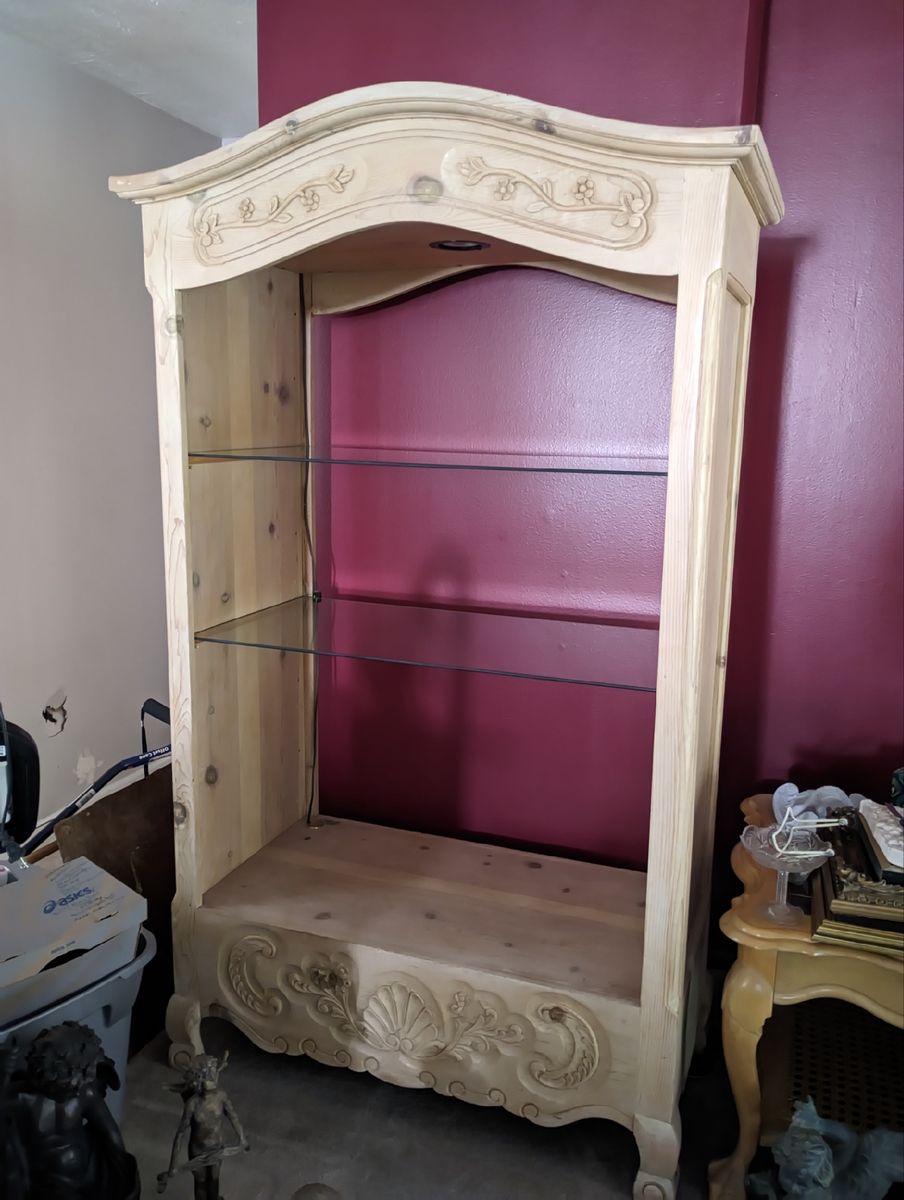 This beautiful knotty pine hutch is hand carved with lovely detail. Two glass shelves. Dresses up any room. In great condition. Perfect for displaying your favorite items. Always gets compliments whenever someone new sees it. Pick it up today!