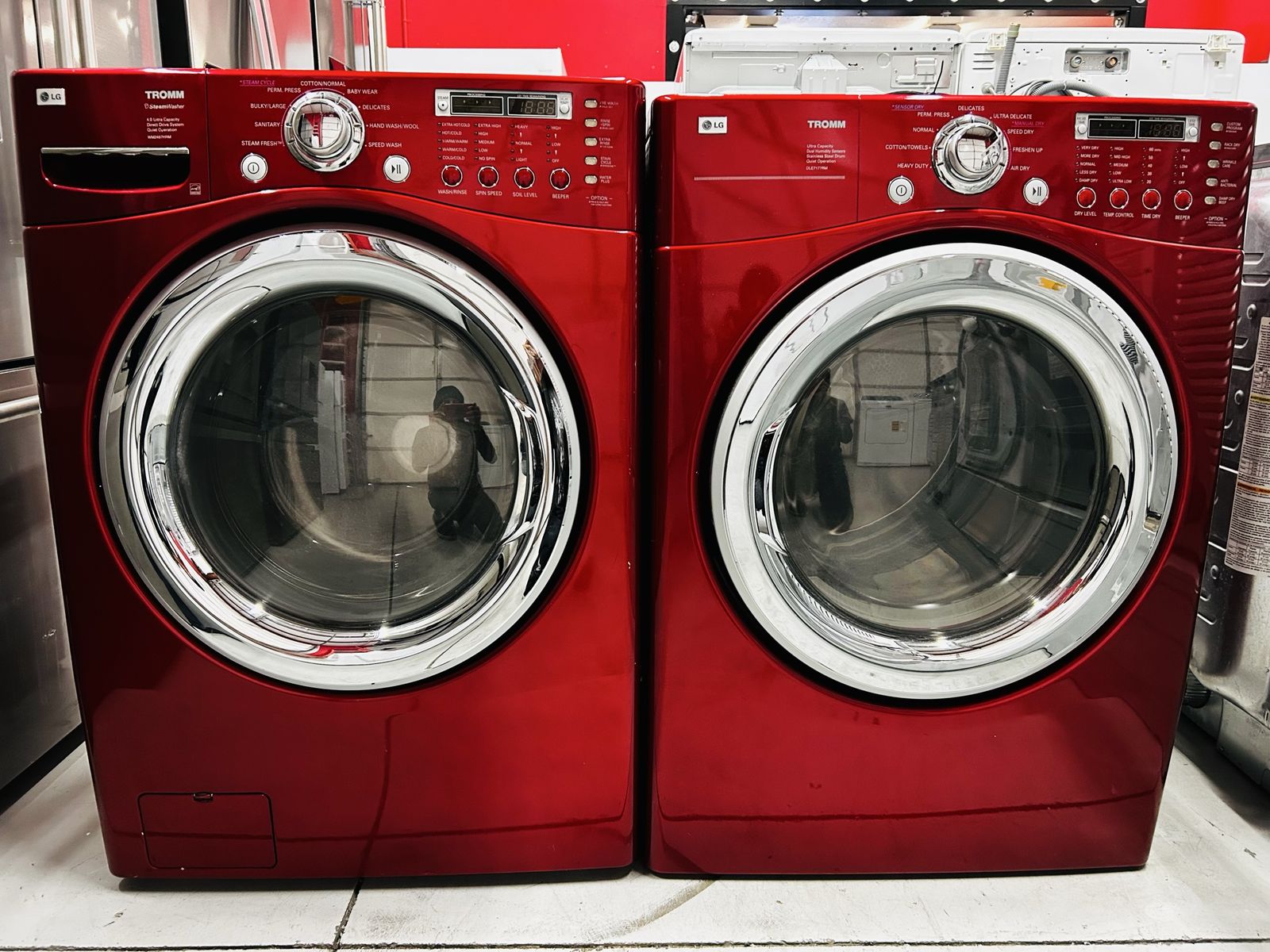 Lg Tromm Steam washer ultra capacity direct drive system quiet operation stainless steel drum heavy duty steam fresh sanitary bulky large cotton normal baby wear hand wash speed wash prewash rinse plus spin extra rinse stain cycle water plus etc..Lg Tromm ultra capacity dual humidity sensors quiet operation stainless steel drum heavy duty cotton towels normal speed dry freshen up air dry wrinkle care wrinkle care anti bacterial damp dry beep time dry etc..Can be stacked. They work great no issues. Clean. 45 day warranty. Delivery available.