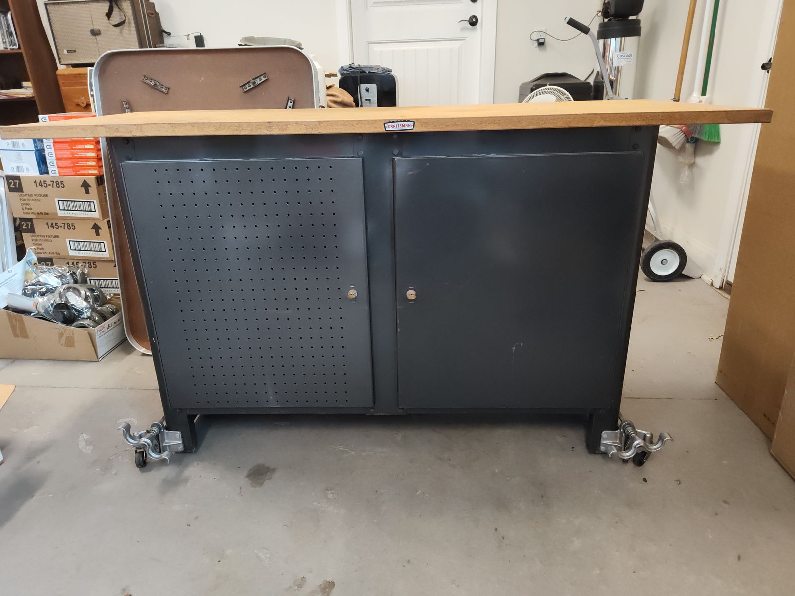 Two locking doors, elevator wheels added for moving convenience.