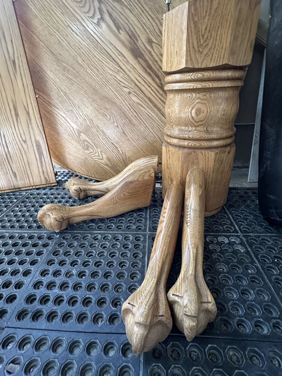 Solid Oak table with claw feet round pedestal, leaf and 6 chairs