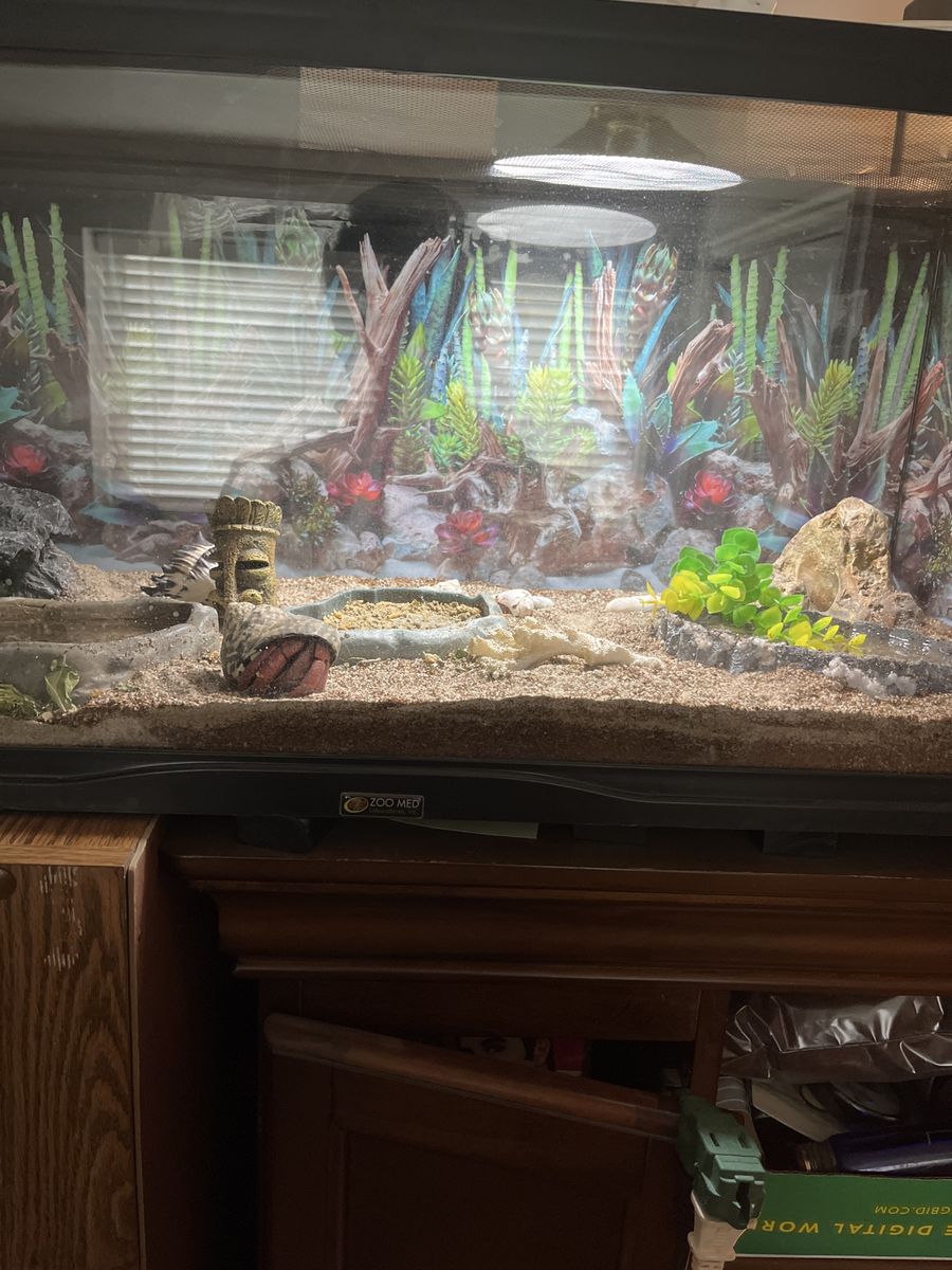 2 hermit crabs and complete set up asking $60. Includes: 20 gal tank with screened top, lights, decorations and background. Cash. Don 801 247-7091