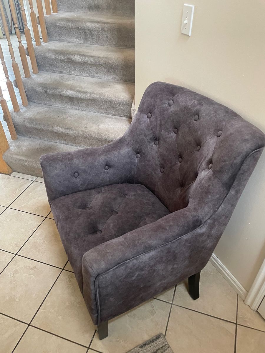 VenmoLike new soft grey accent chair with buttons, 34" tall, 25" wide, sitting depth 20"