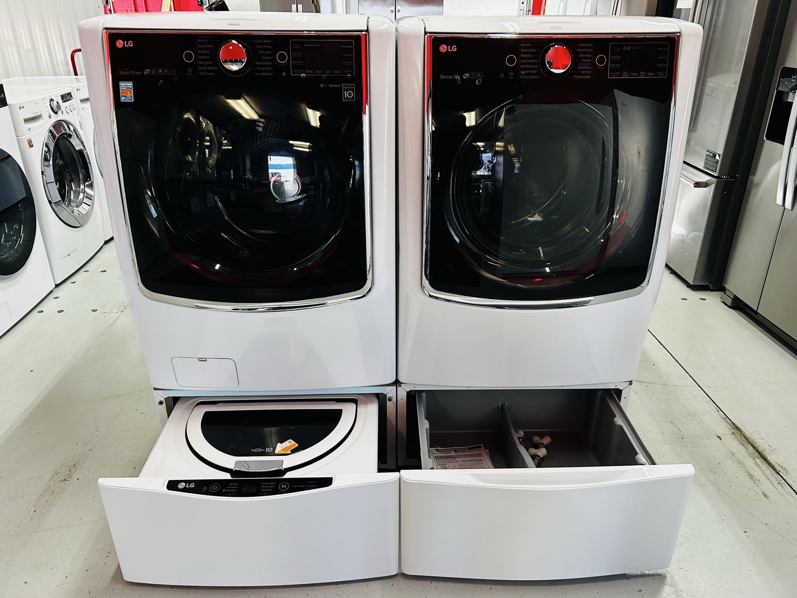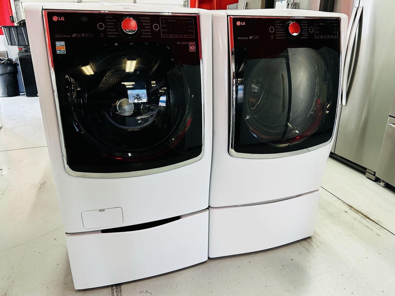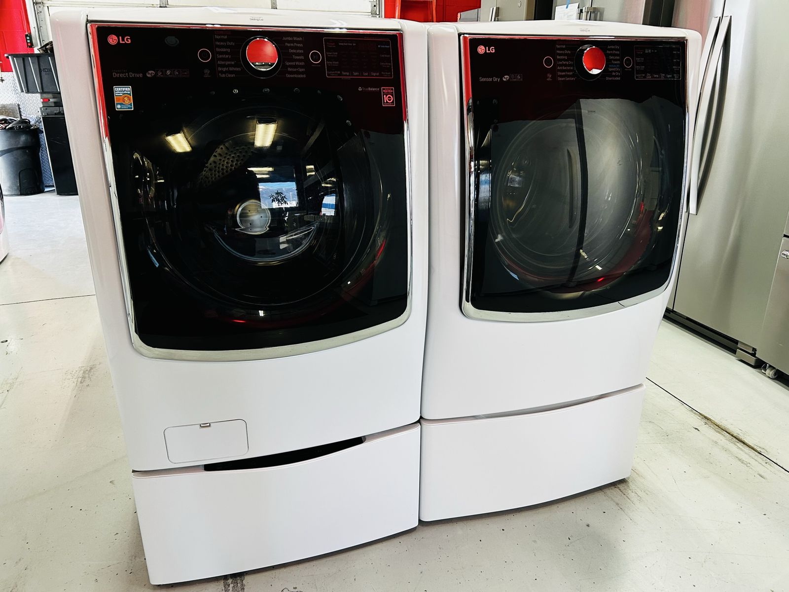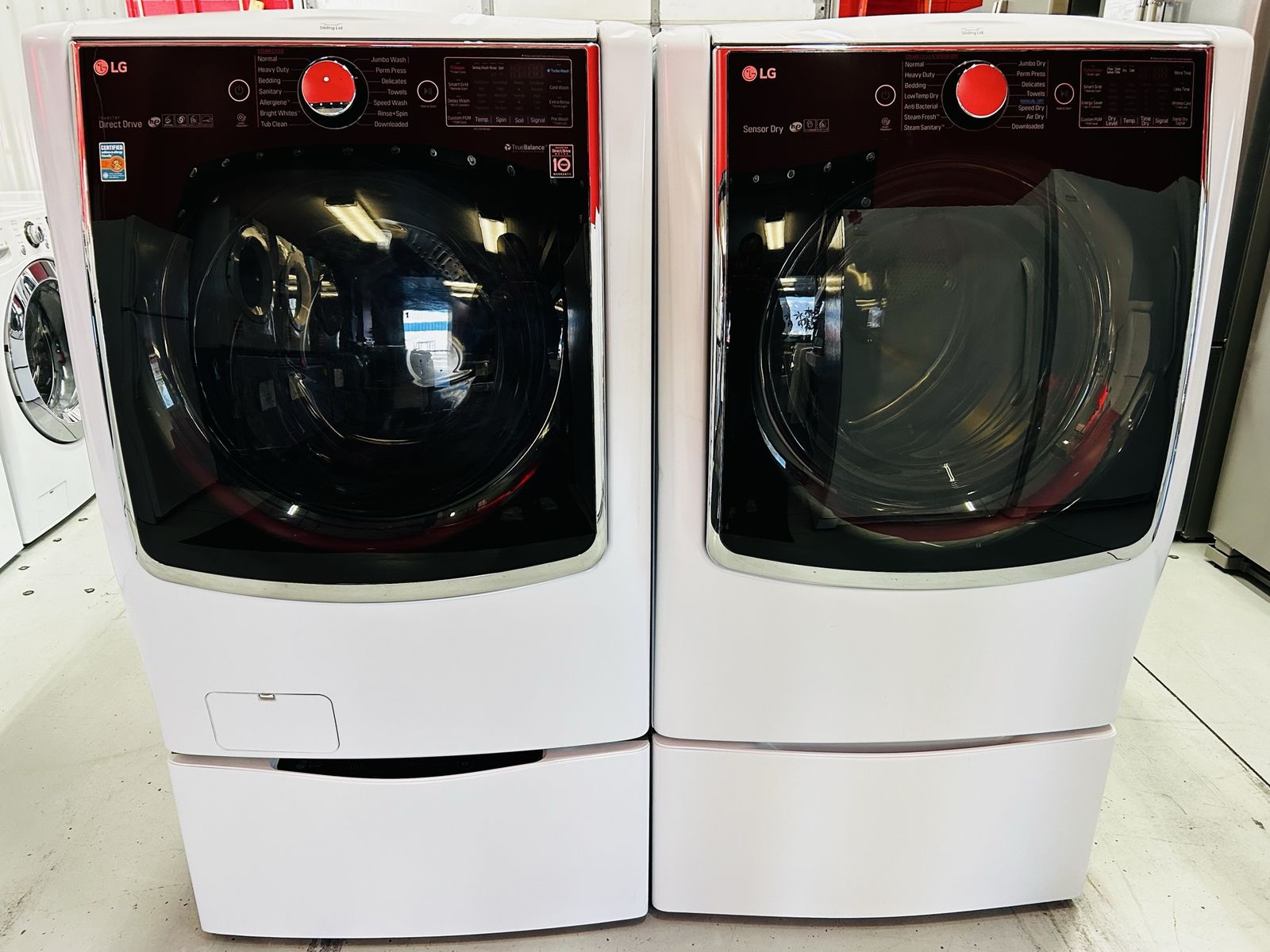 Lg Signature Steam Mega Capacity washer 5.2 cu ft inverter direct drive motion 6 turbo wash energy star HE stainless steel drum heavy duty cotton normal bulky large sanitary allergiene tub clean jumbo wash speed wash delay wash etc..Lg Signature True Steam Electric Dryer 9.0 cu ft HE sensor dry stainless steel drum heavy duty cotton normal anti bacterial steam sanitary jumbo dry super dry speed dry reduce static damp dry time dry etc..Washer pedestal is an Lg SideKick Washer. They work great. Clean. 45 day warranty. Delivery/install available.