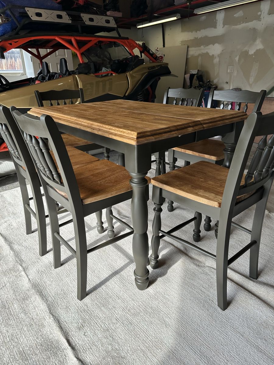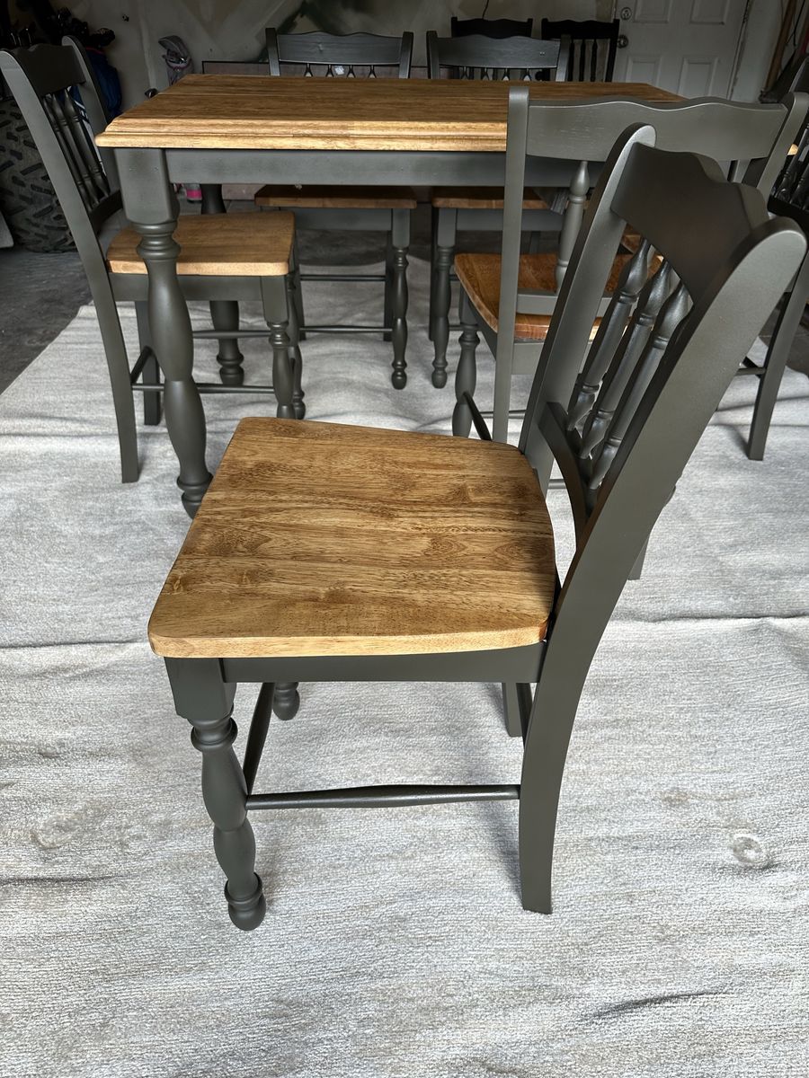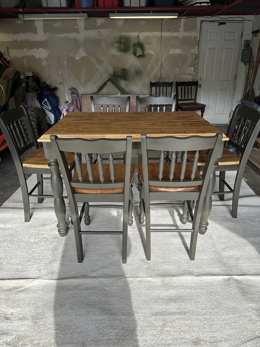 Recently refinished all wood table and 8 chairs. Stained in walnut and paint color is “deepest earth” with warm green and charcoal tones.