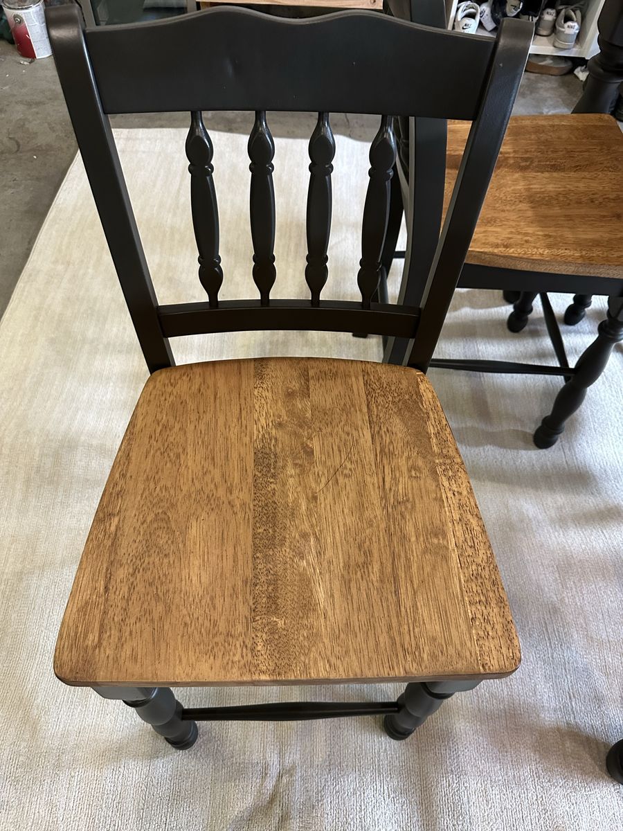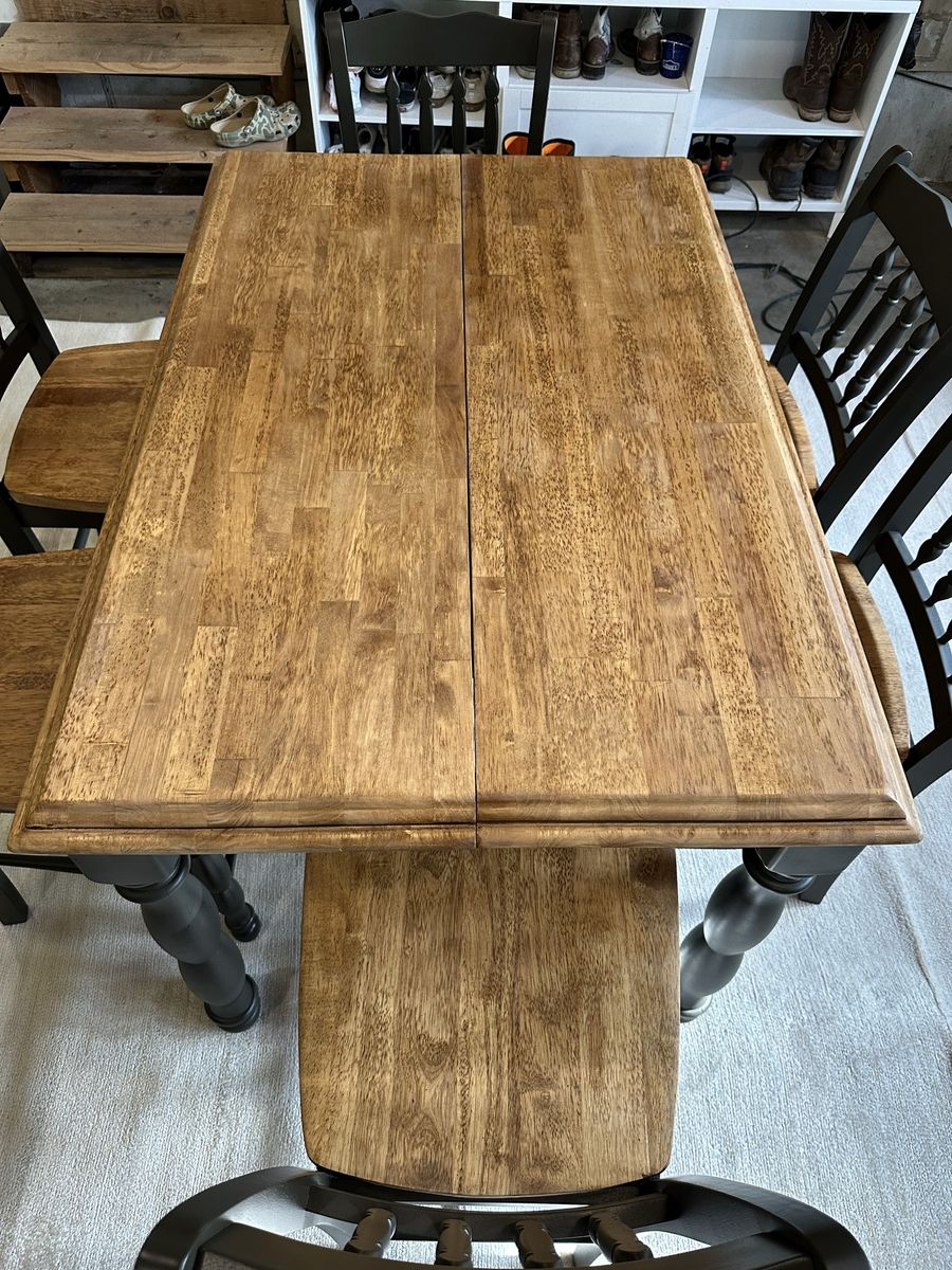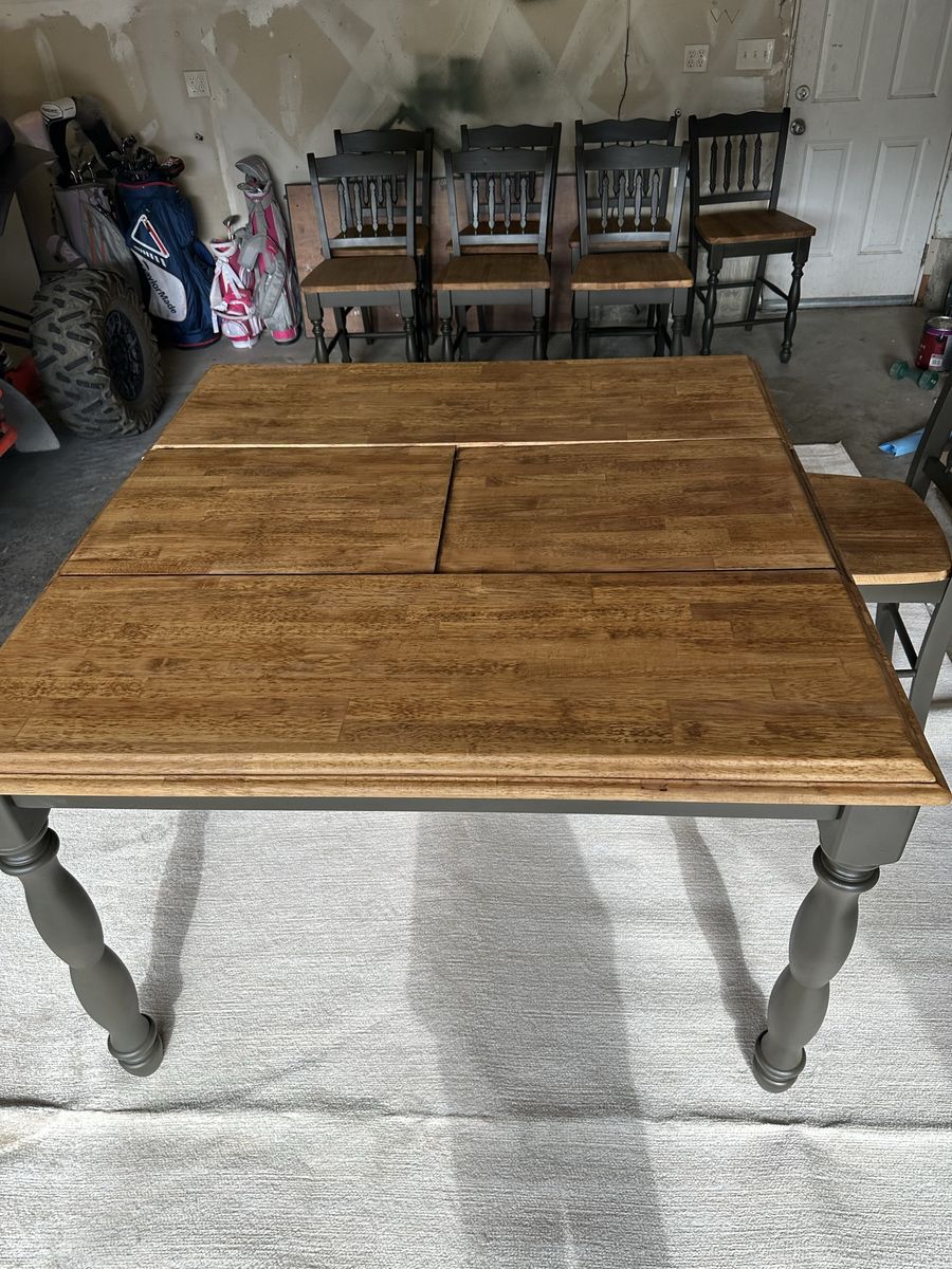 Recently refinished all wood table and 8 chairs. Stained in walnut and paint color is “deepest earth” with warm green and charcoal tones.