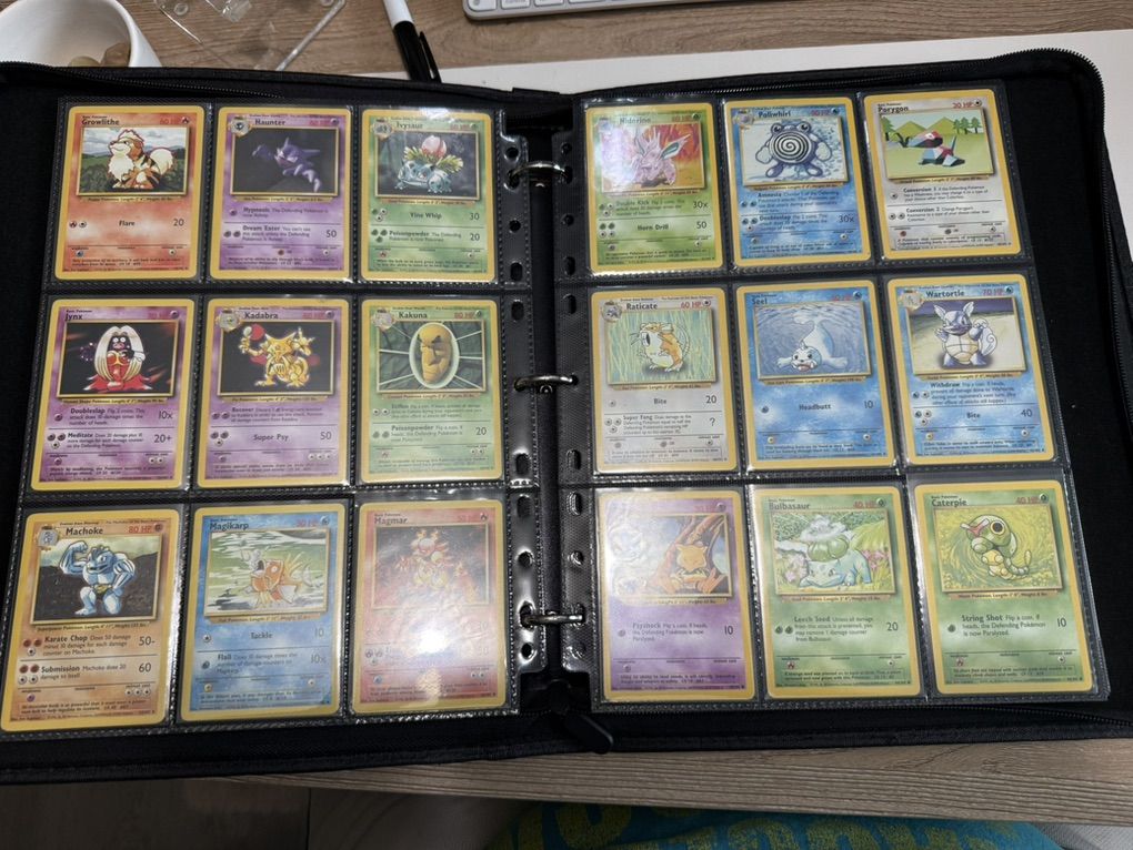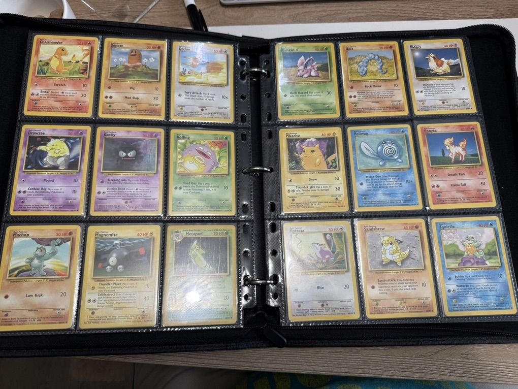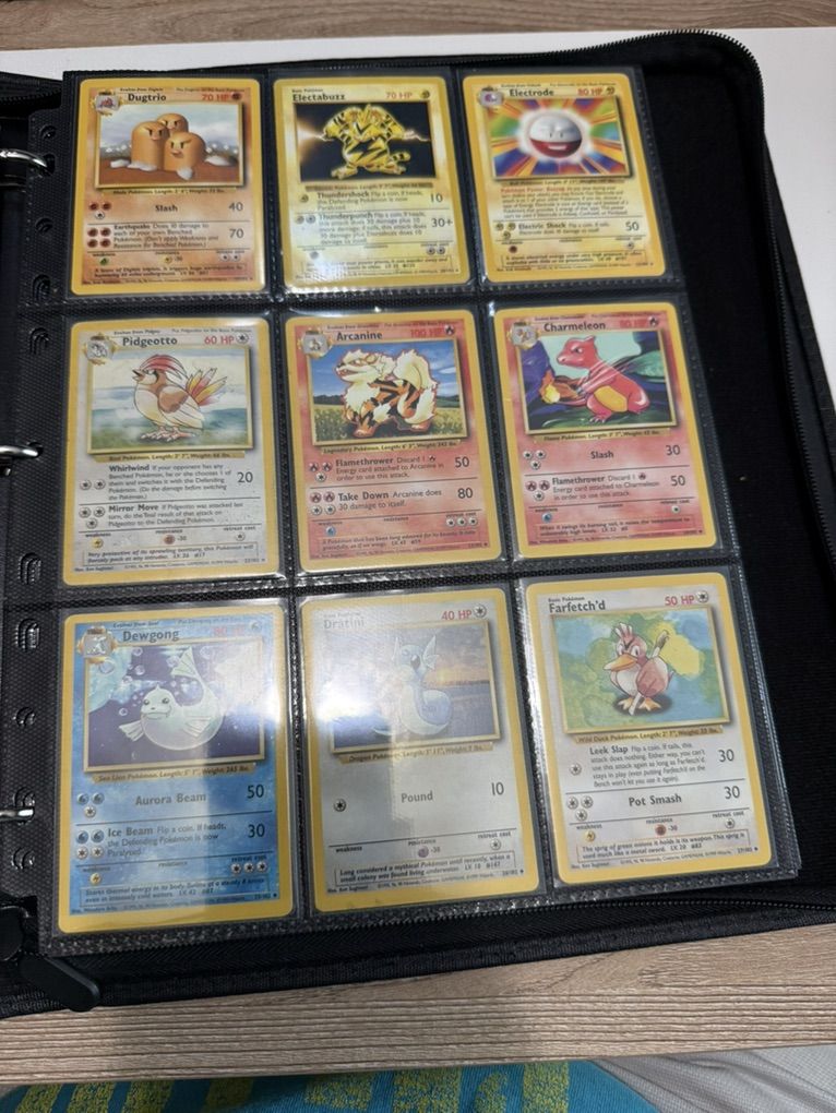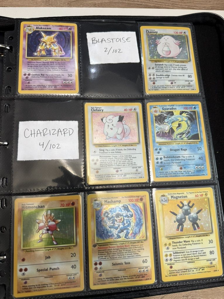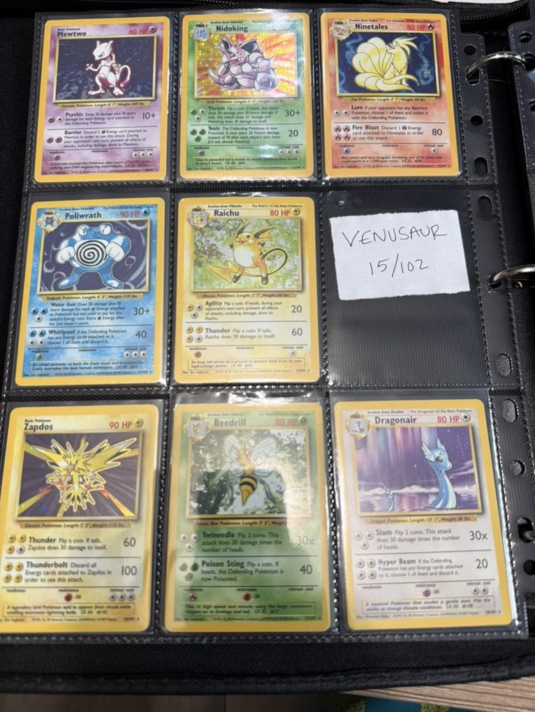 Pokémon Base Complete Set (Missing Charizard Blastoise Venasaur Holo) WOTC These cards range from LP-HP conditions. Please see pictures for card details. The set is in English and does not include Charizard, Blastoise, or Venasaur Holo cards. There may be a few cards you'll want to upgrade but overall this is a great (nearly) complete binder set!