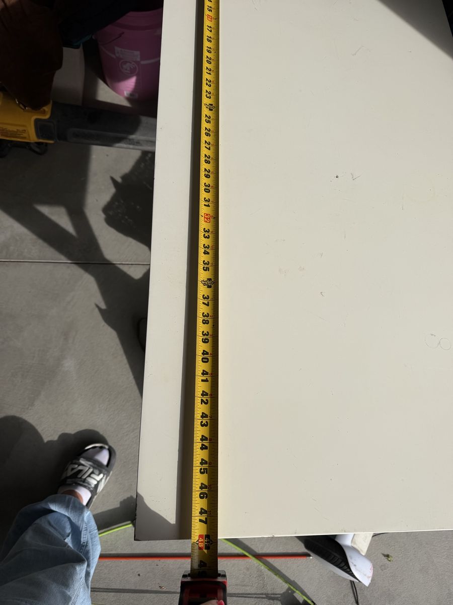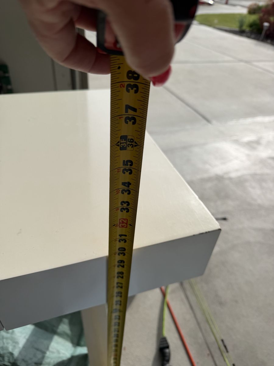 Heavy duty, cute white desk. 48 inches long 30 inches high. Would make a super cute makeup vanity, crisscross legs.