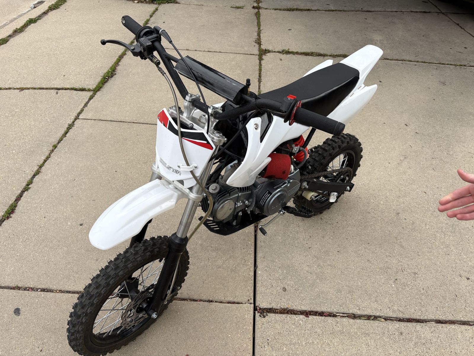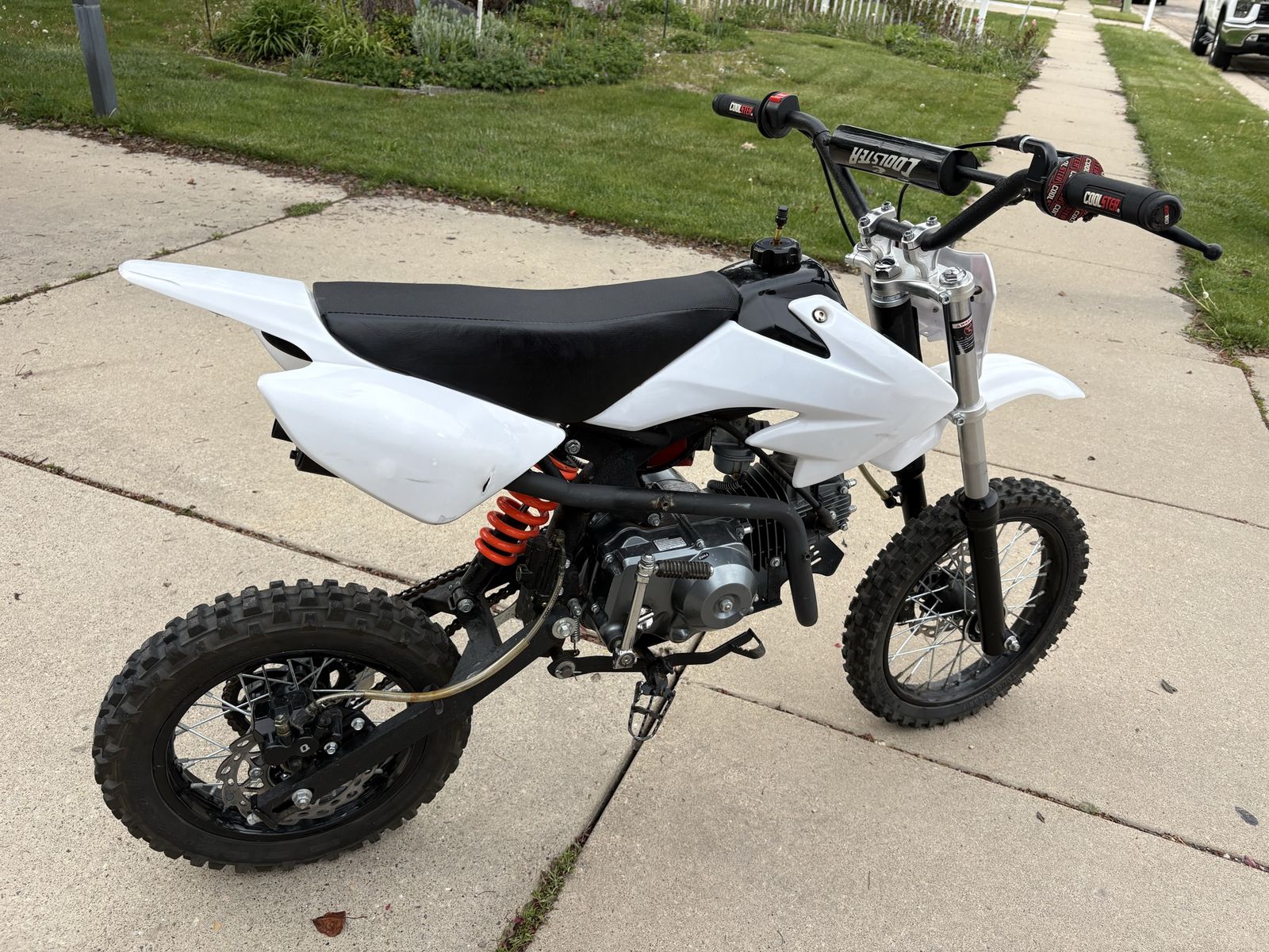 VenmoCoolster 110cc dirt bike. Beginner-friendly, gas-powered, 4-stroke automatic pit bike ideal for children and teenagers. It features a 110cc engine, top speeds around 30 mph, and a 26-inch seat height. The bike features an electric start, sturdy construction, and hydraulic disc brakes for easy handling and safety.