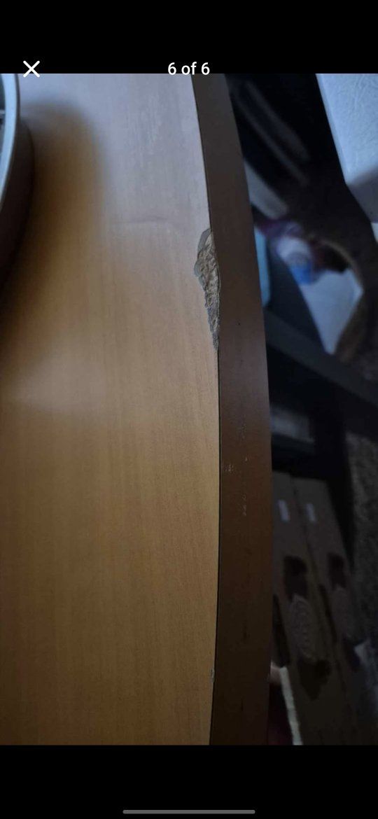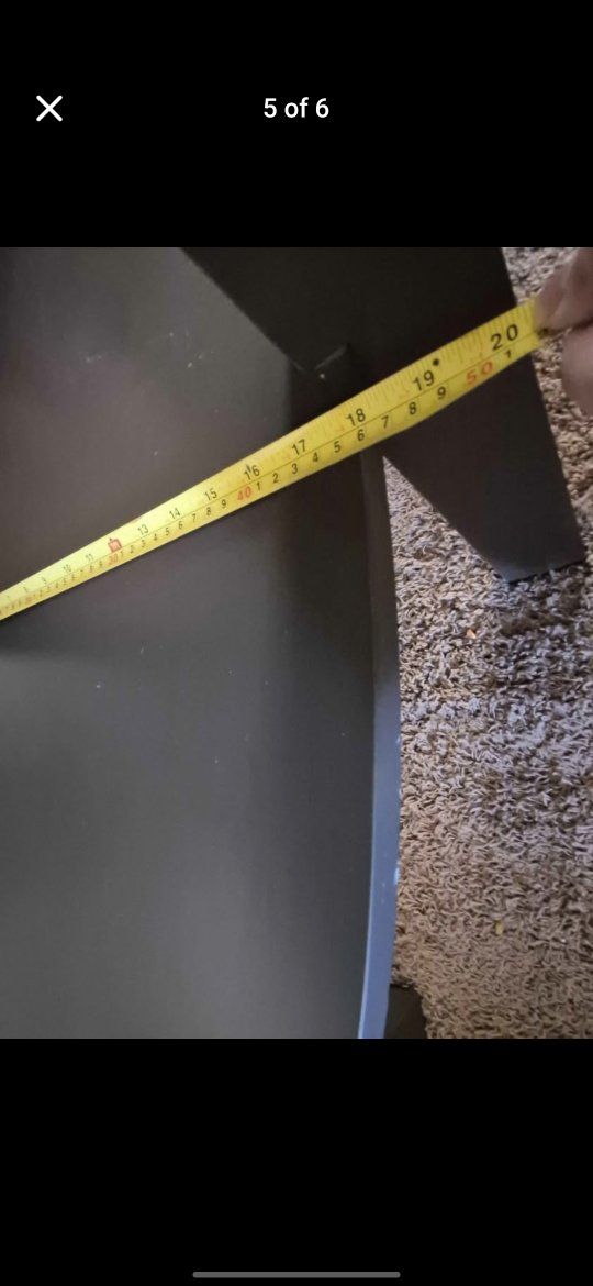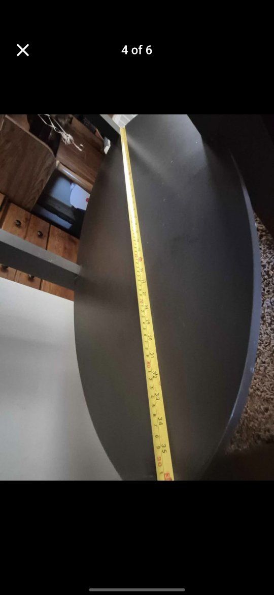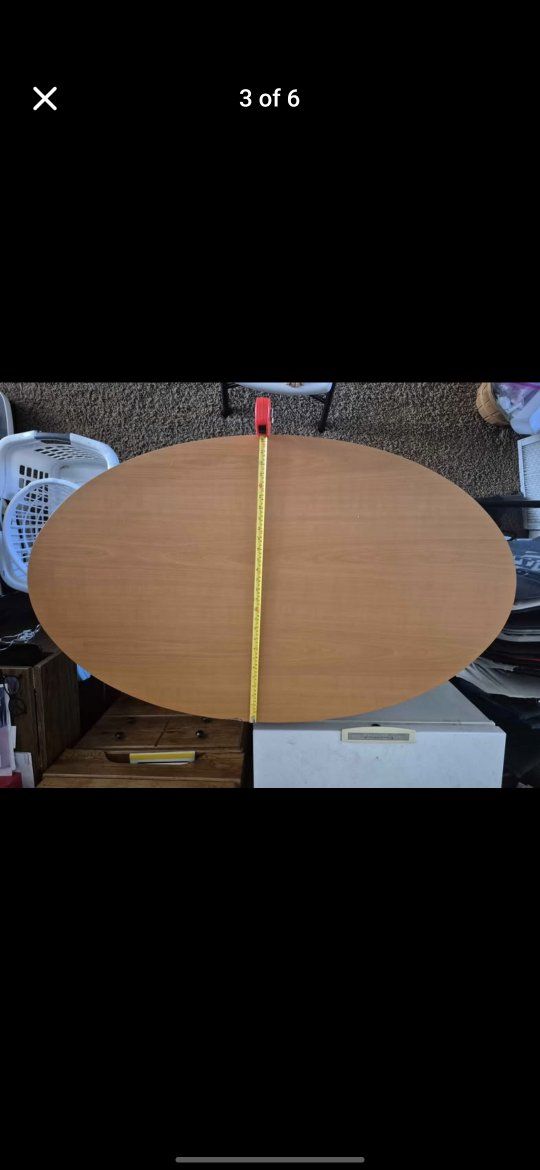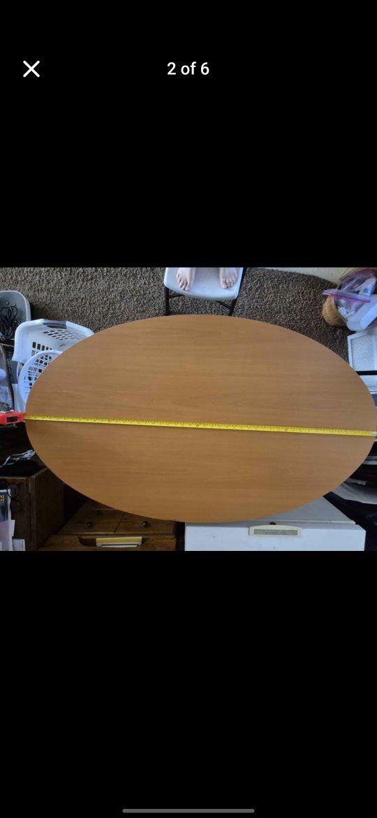 PayPalStylish oval two-tier table. Light wood color top with dark legs and bottom shelf. Great for living room or entryway. I don't have room for it anymore. Top surface about 47.5 inches long and 27.5 inches wide. Table stands about 35.5 inches tall. Bottom shelf about 35.5 inches long.