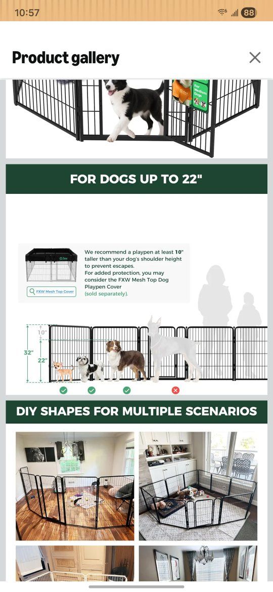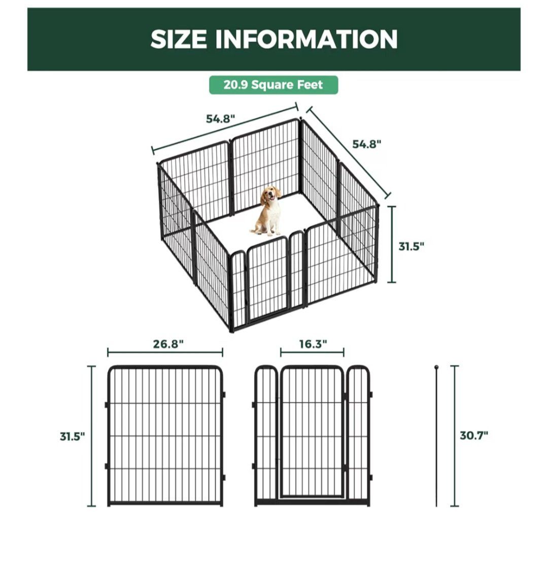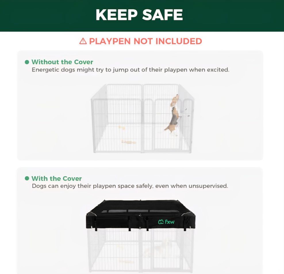 VenmoPlaypen is of semi-open and expandable design, safe and sturdy build, and has ease of access. 32" tall Semi-Open & Expandable: Creates a stress-free environment and allows you to add more panels as your dog grows. Safe & Sturdy Build: No sharp edges and strong construction prevent injuries and withstand jumping. Ease of Access: Threshold-free gate allows easy walk-in cleaning for humans and worry-free running for dogs Top cover is new. Adds cozy security and keeps pets safe.