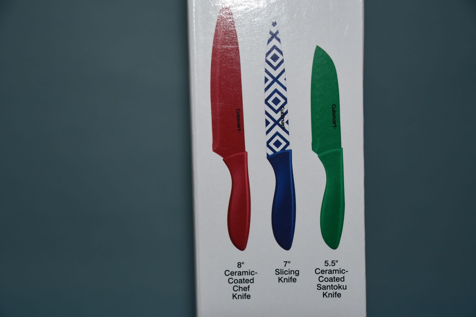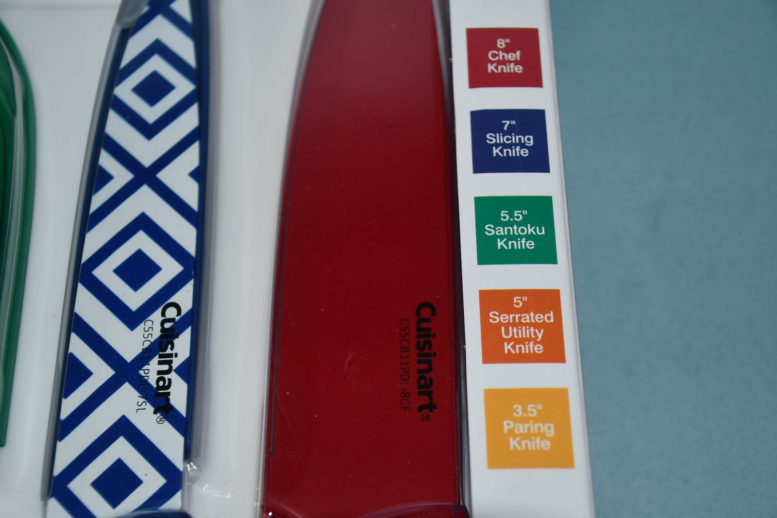 This NIB "CUISINART" 5 PIECE STAINLESS STEEL KNIFE SET with BLADE GUARDS + a NON SLIP CUTTING BOARD is from a smoke free home. Questions??? Please ask. We are located in Plain City. Cash only please.
