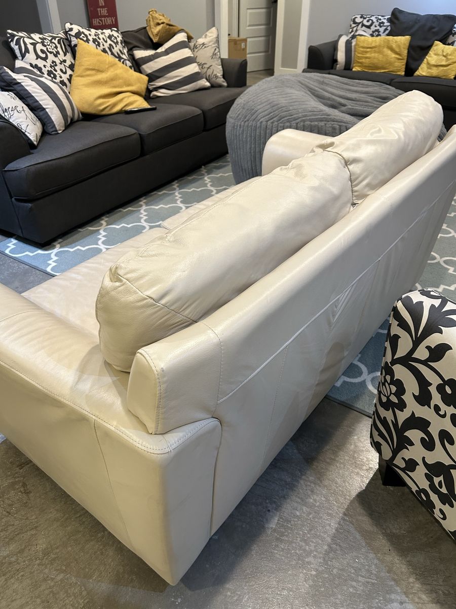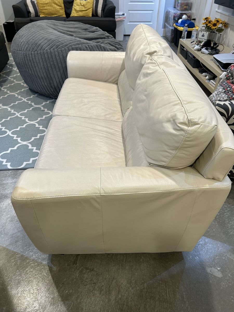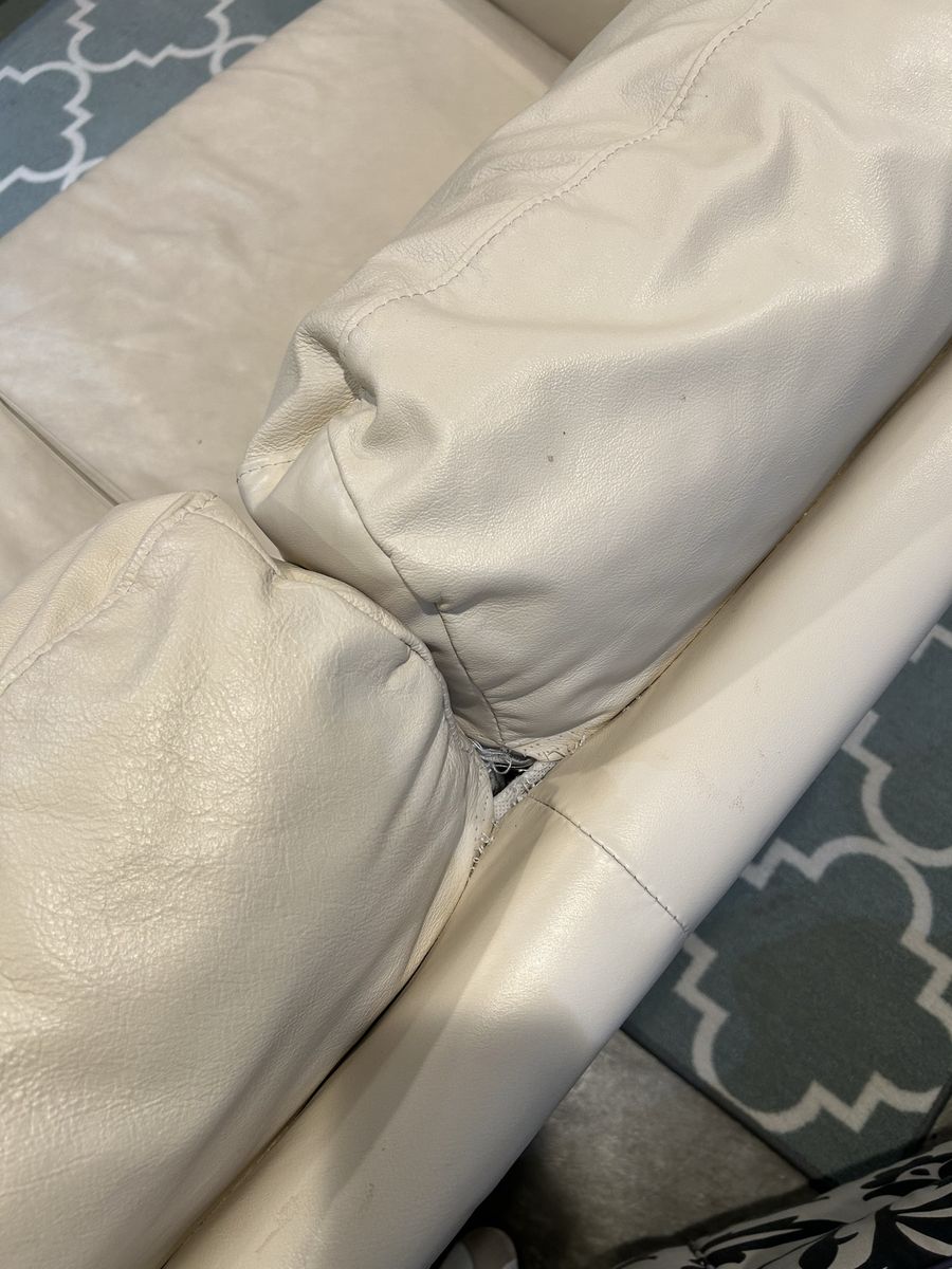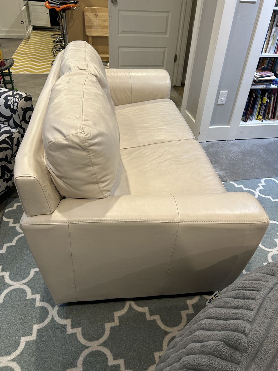 VenmoHardly used vegan leather sofa. There is a hole in between the cushions where the thread is pulling apart (see picture). At its widest the couch is 32” high x 72” wide x 35” deep.