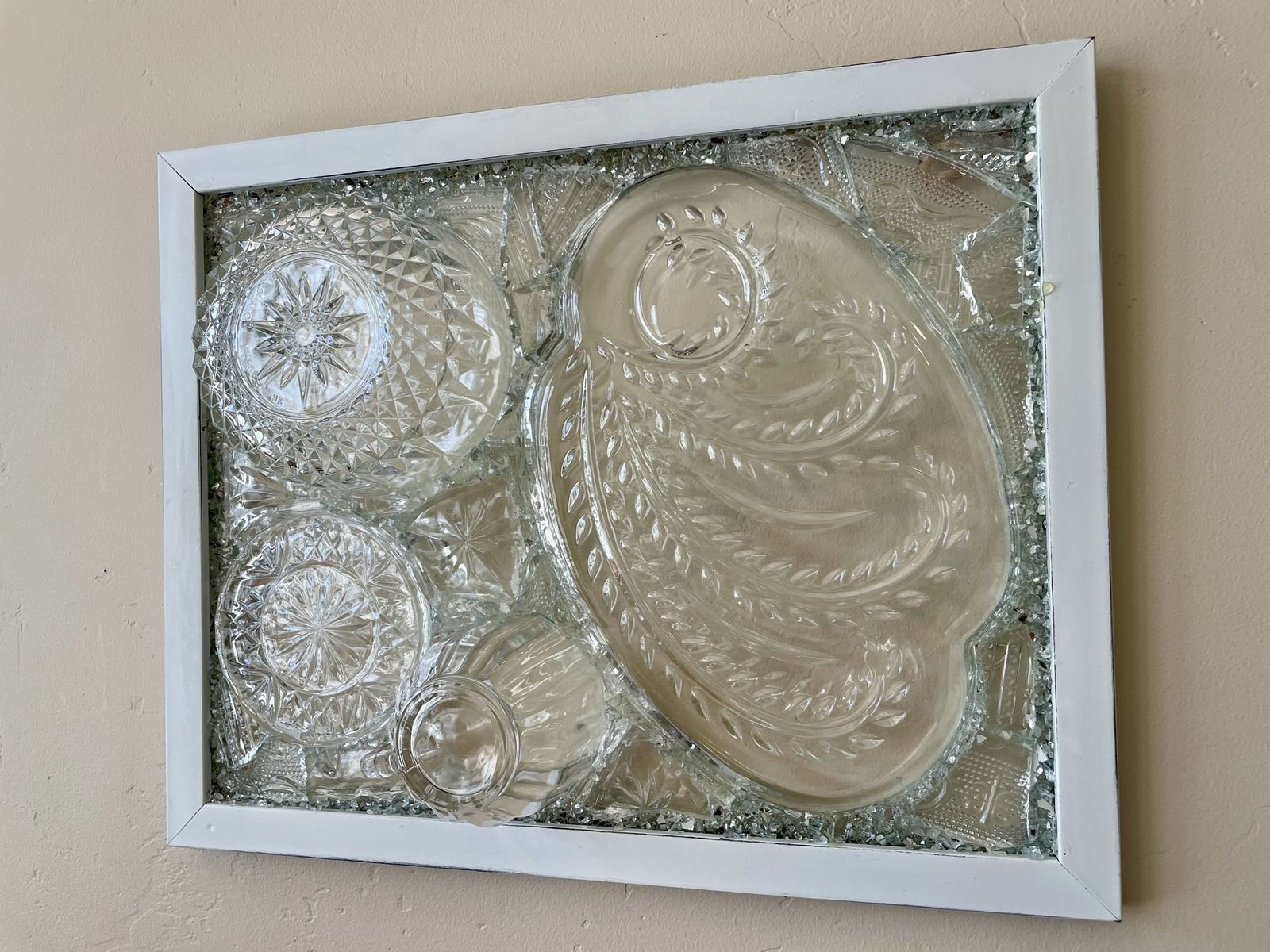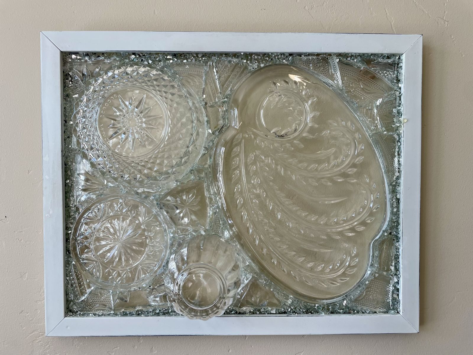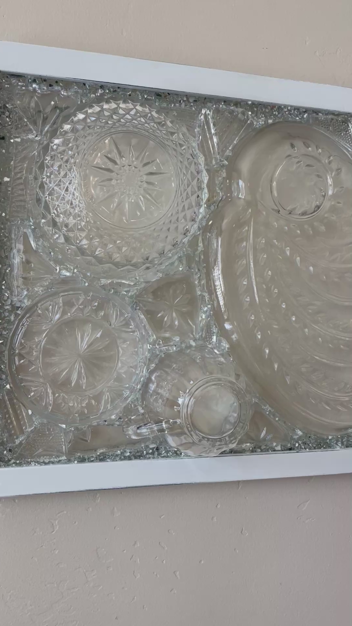 VenmoGorgeous one of a kind vintage dish preservation wall art. This stunning piece of art was handmade from precious antique dishes with broken dish mosaic & framed in farmhouse white.