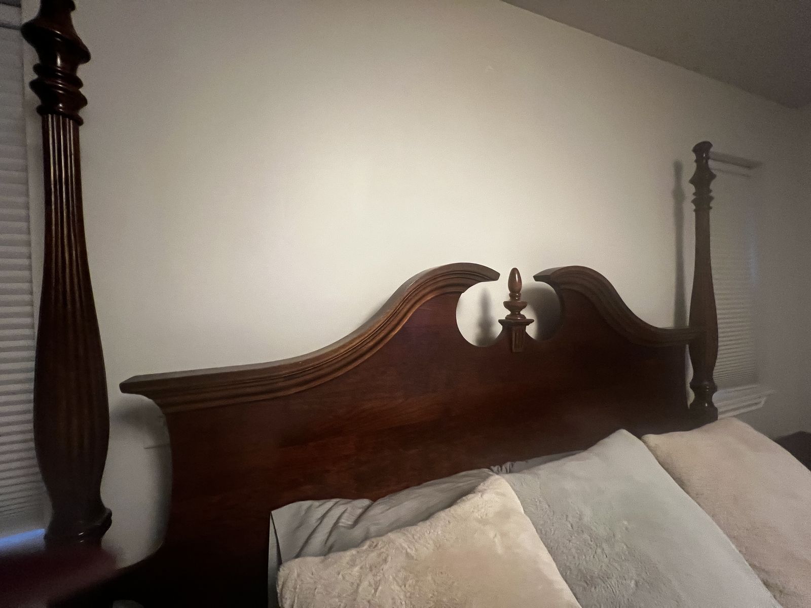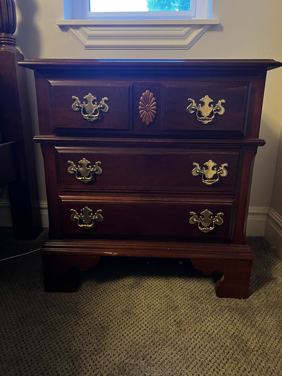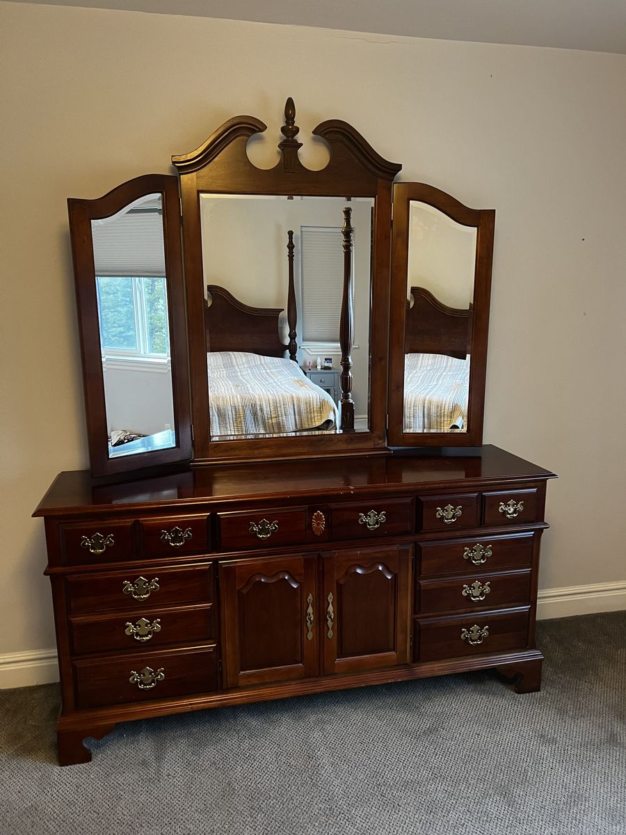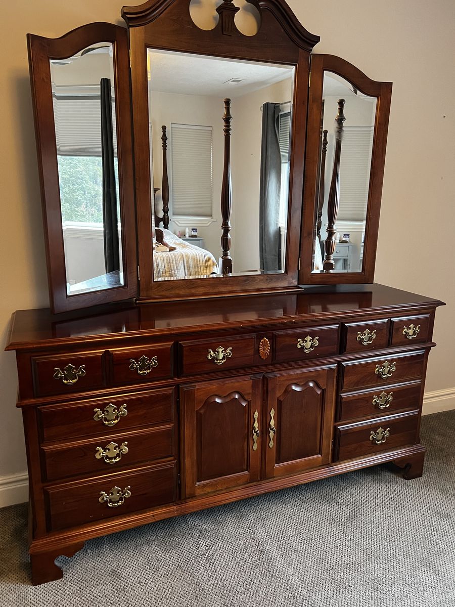ZelleFour poster king size bed frame. Large dresser with seven drawers, tri-fold mirror, and two storage shelves. One nightstand with two drawers. All made from solid cherry wood.