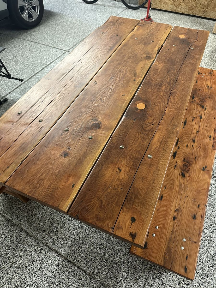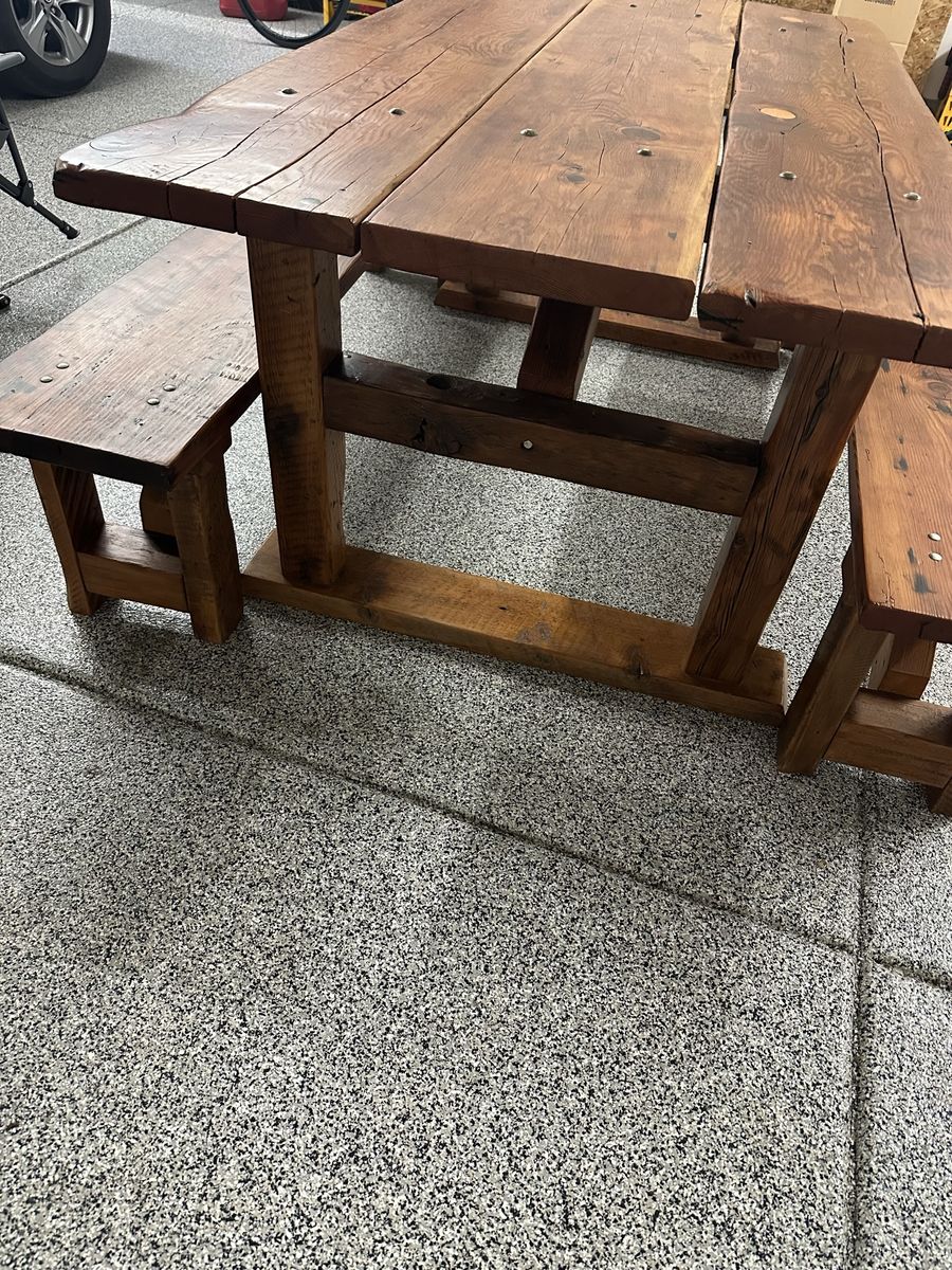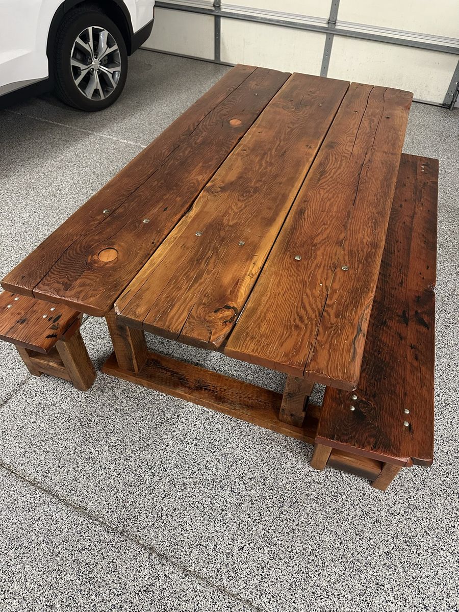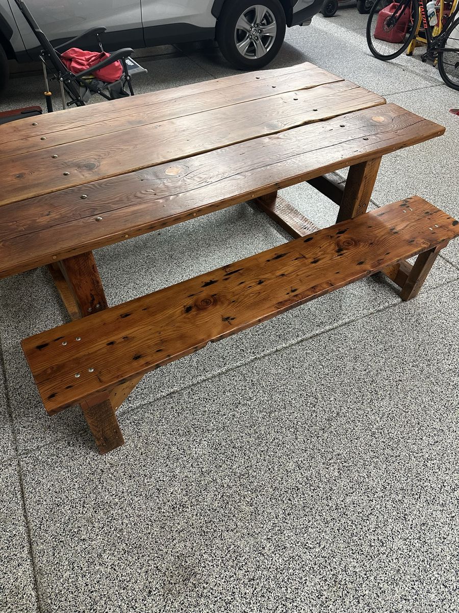 VenmoCustom Wood table made from reclaimed wood. About 7 years old but has been inside a garage for most of that time. Can be used outside or inside. Fantastic condition. Very high quality. Table has 2 benches on either side. Table is 30.5 in tall, 77 in long and 39 in wide. Benches are 17 in tall, 75 in long and 12 3/4 in wide.