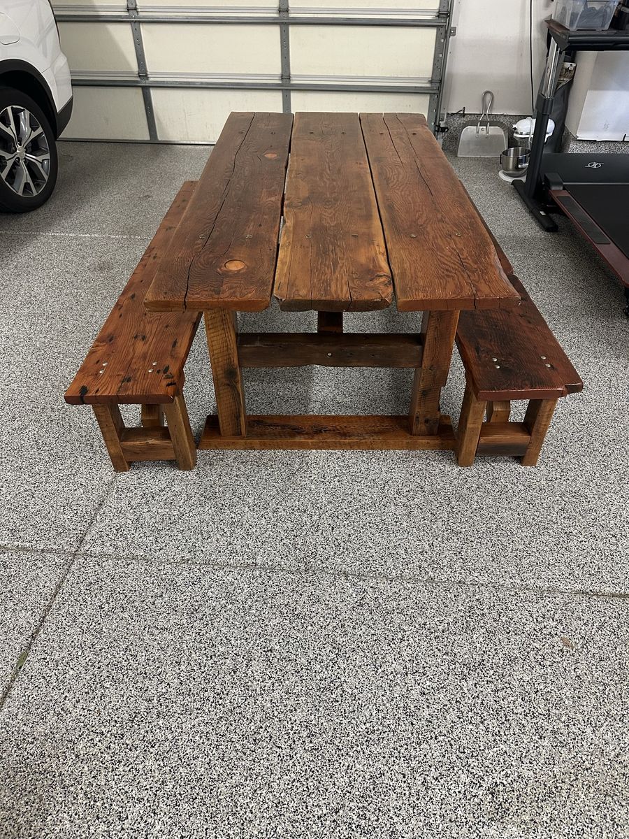 VenmoCustom ood table made from reclaimed wood. About 7 years old but has been inside a garage for most of that time. Can be used outside or inside. Fantastic condition. Very high quality. Table has 2 benches on either side. Table is 30.5 in tall, 77 in long and 39 in wide. Benches are 17 in tall, 75 in long and 12 3/4 in wide.