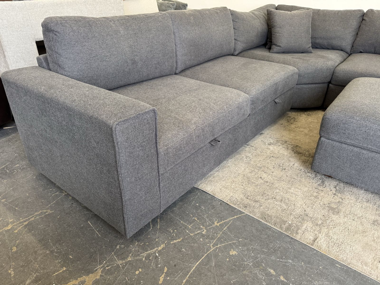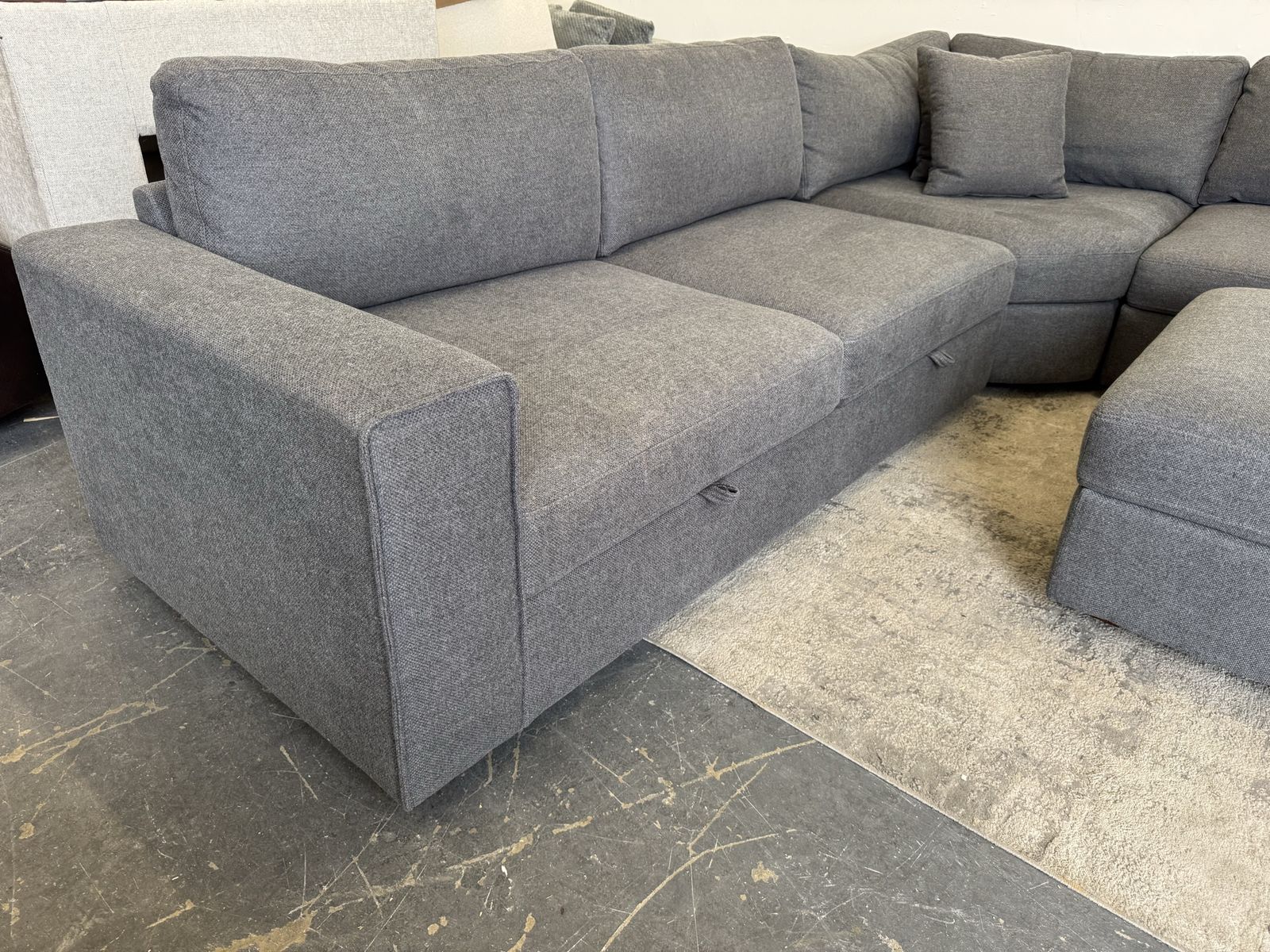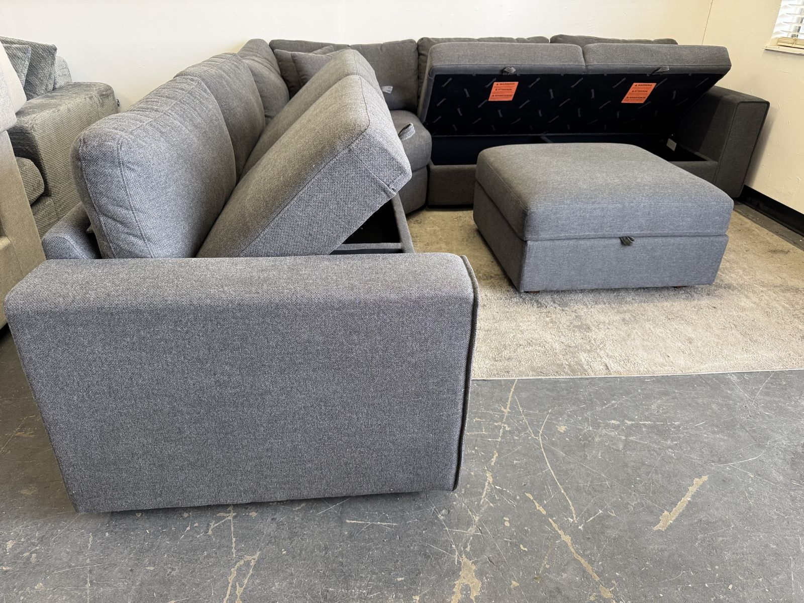 Features: • Modern Style with a Clean Look • Hidden Storage Seats on Both Sides • Storage Ottoman with Generous Storage Space • Zipper Attached Back Cushion Holds Cushions in Place • Wide Track Arms