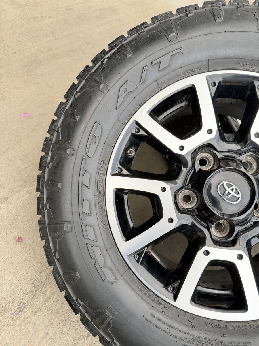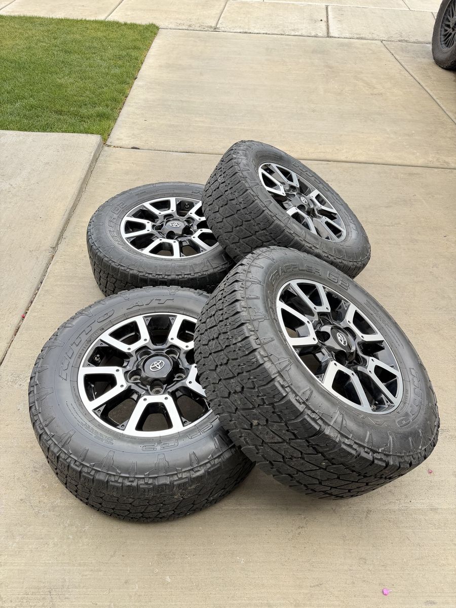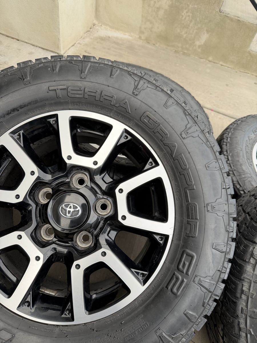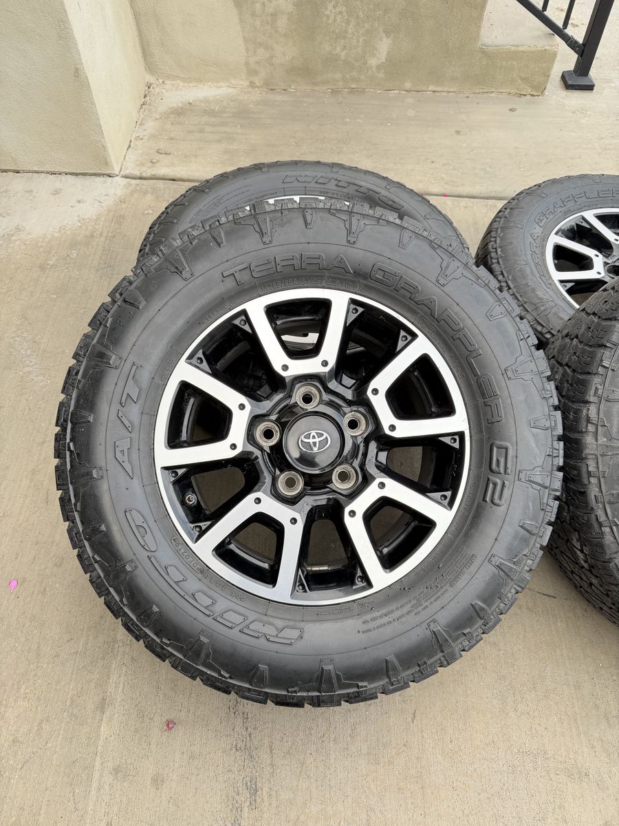 ApplePaySet of 4-Toyota Tundra Sequoia Rims and Tires 285/65R18 Nitto Terra Grappler G2 Load E in good condition,asking $1000 Rims are in good condition,1 rim has some clear coat peeling,not very noticeable Tires have around 1 year left or more Comes with lug nuts and sensors Bolt pattern 5-150 They will fit Toyota tundra sequoia Land Cruiser Lexus Text anytime 385-402-2292
